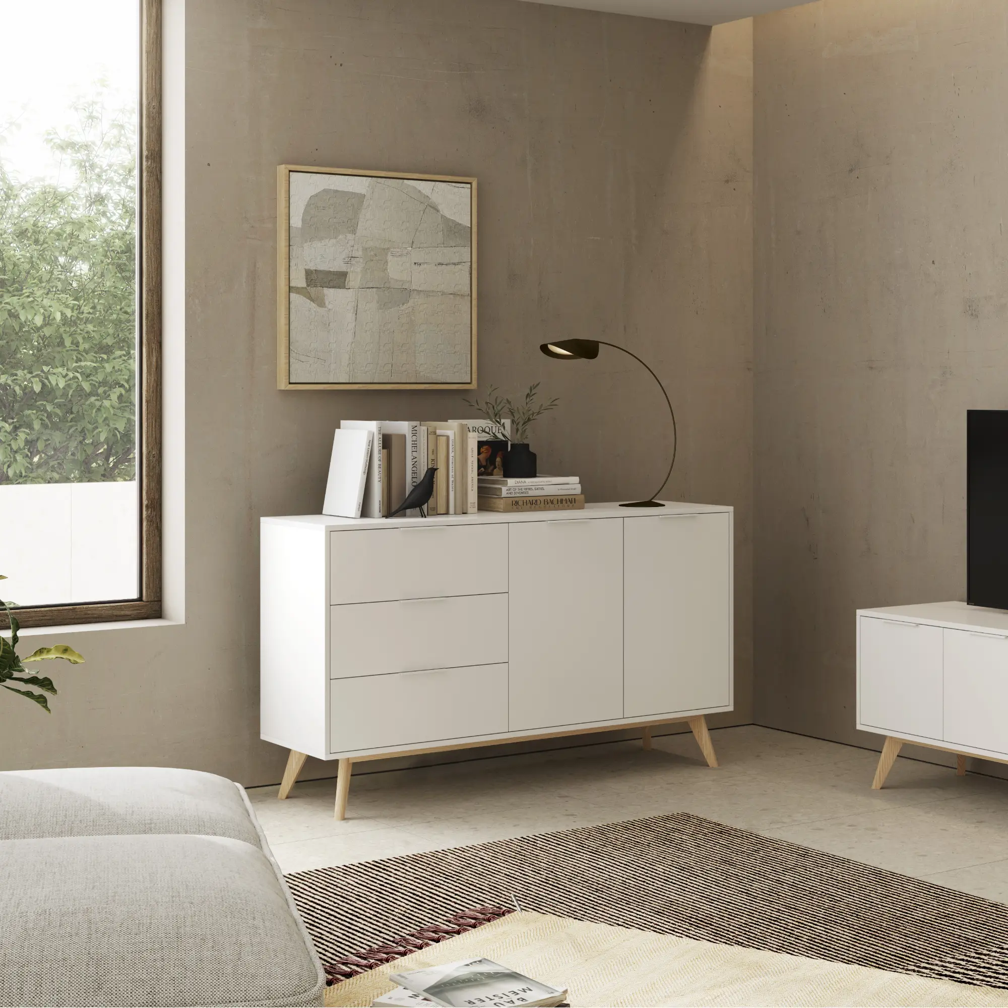 El Aparador Campus 2P3C es una pieza de mobiliario diseñada para aportar calidez, luminosidad y funcionalidad a cualquier salón o comedor. Fabricado en una combinación de madera DM y pino, este aparador destaca por su acabado en blanco con detalles en cera blanca, una combinación que aporta un estilo fresco, natural y atemporal. La mezcla de tonos claros y la textura suave de la madera tratada con cera crean un mueble que encaja a la perfección en ambientes nórdicos, mediterráneos, rústicos modernos o espacios de inspiración costera.
