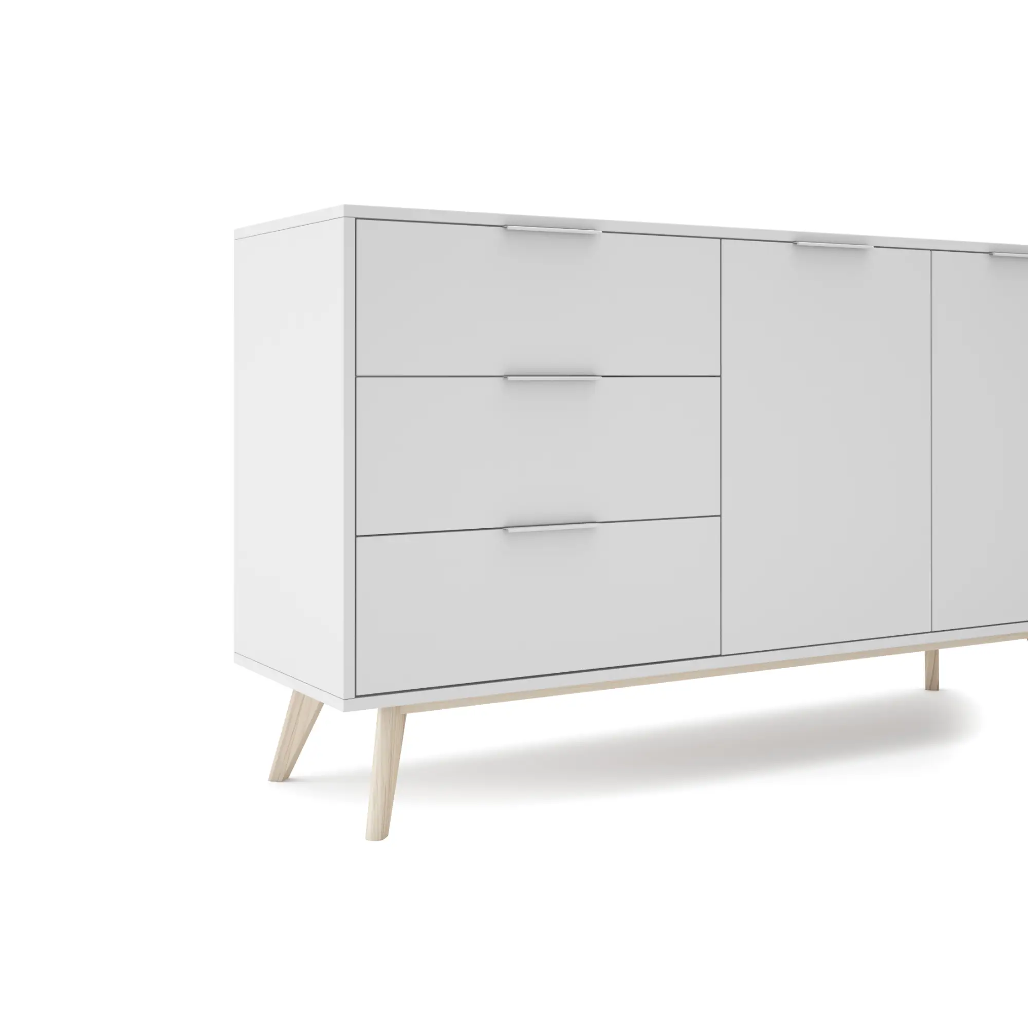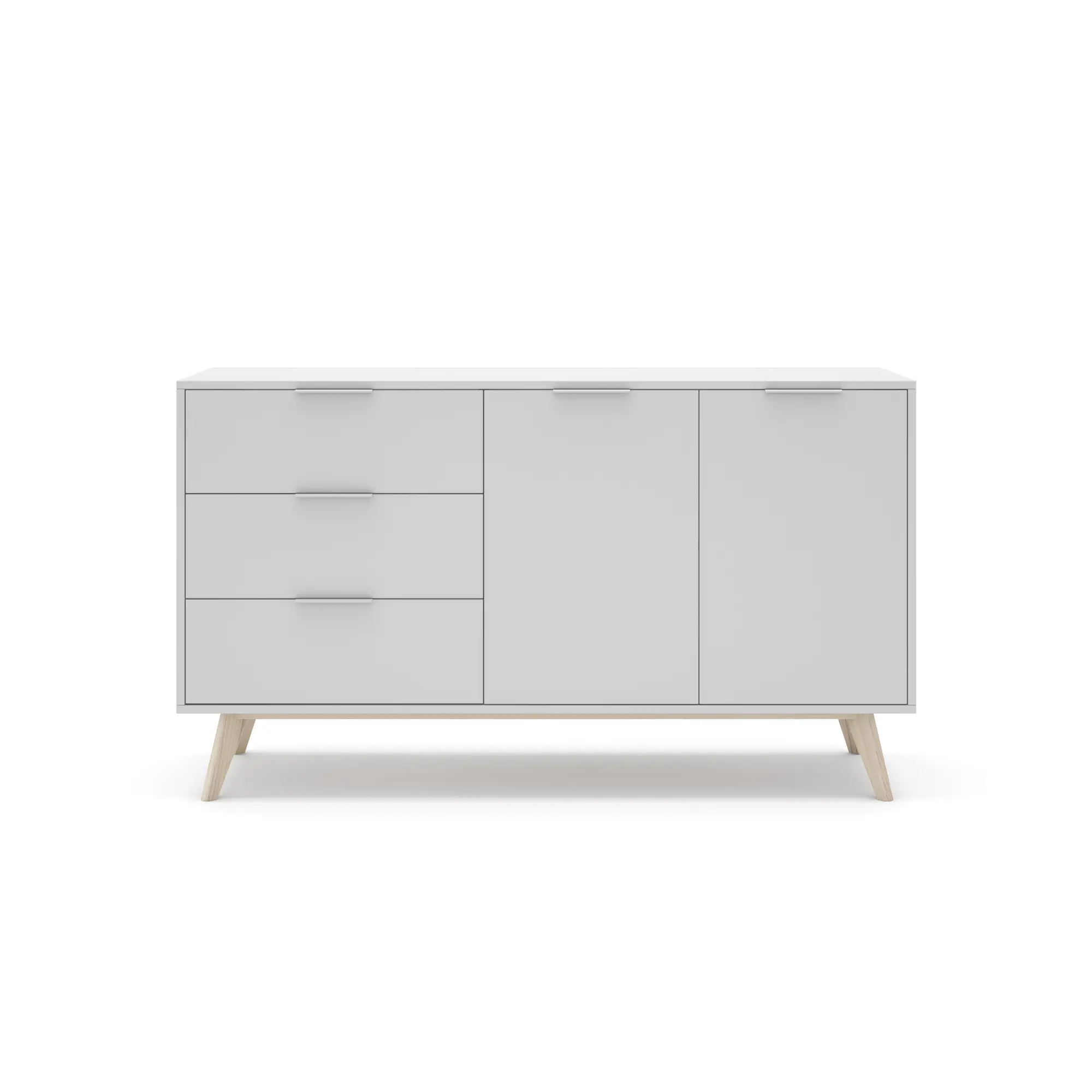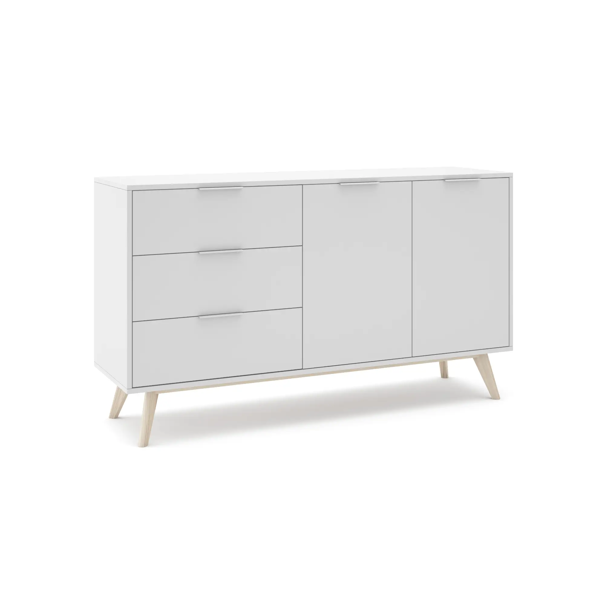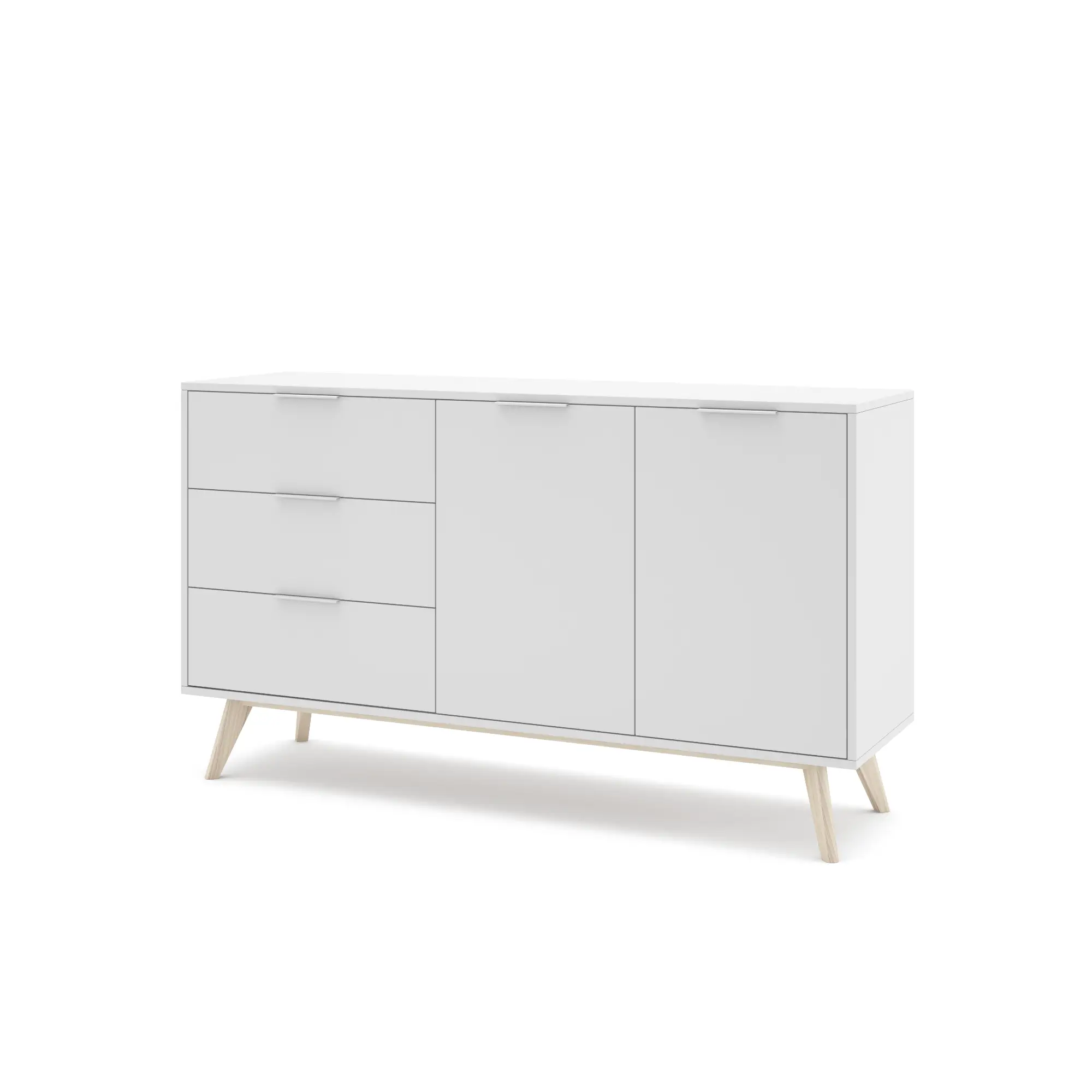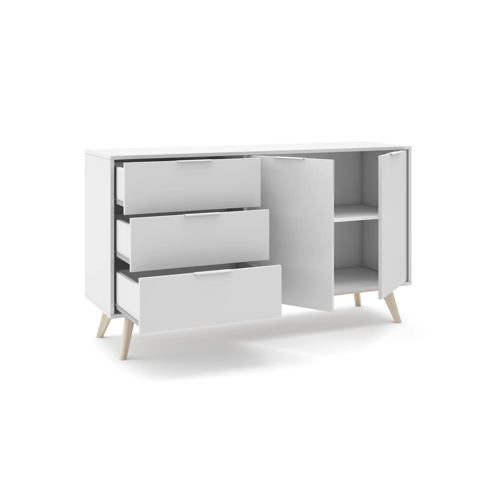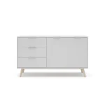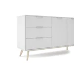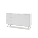 Aparador de 2 puertas y 3 cajones fabricado en DM y pino, acabado en blanco/cera blanca. Con medidas de 140×40×81 cm, ofrece gran capacidad de almacenamiento y un estilo luminoso y natural perfecto para salones y comedores modernos.