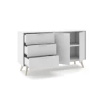 Con unas medidas de 140 cm de largo, 40 cm de fondo y 81 cm de alto, ofrece una capacidad de almacenamiento generosa sin ocupar demasiado espacio visual. Su diseño se compone de dos puertas laterales que esconden compartimentos amplios, ideales para guardar vajilla, mantelería, libros o cualquier objeto que desees mantener ordenado y fuera de la vista. En la parte central incorpora tres cajones, perfectos para organizar pequeños accesorios, cubertería, documentos o elementos de uso diario.