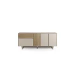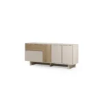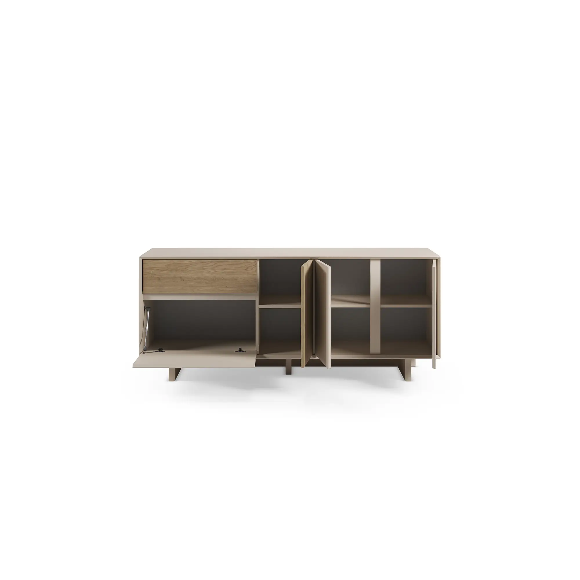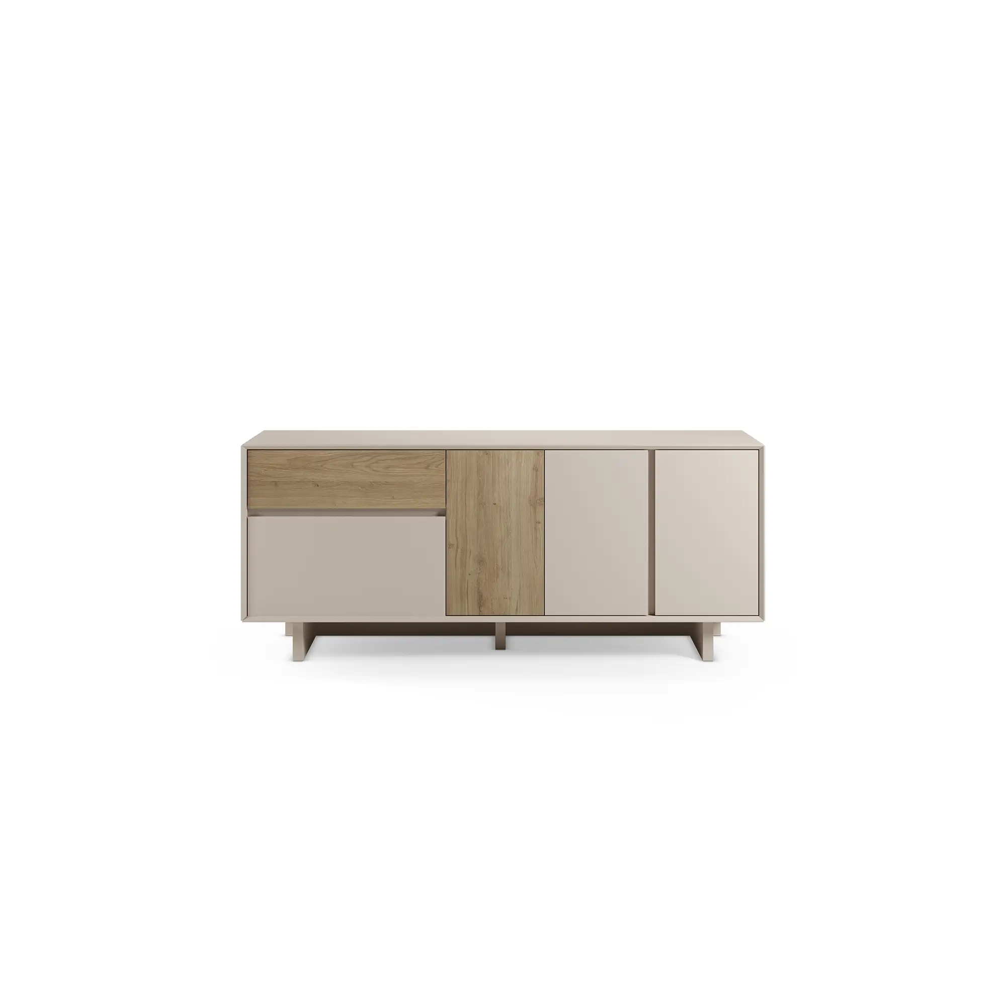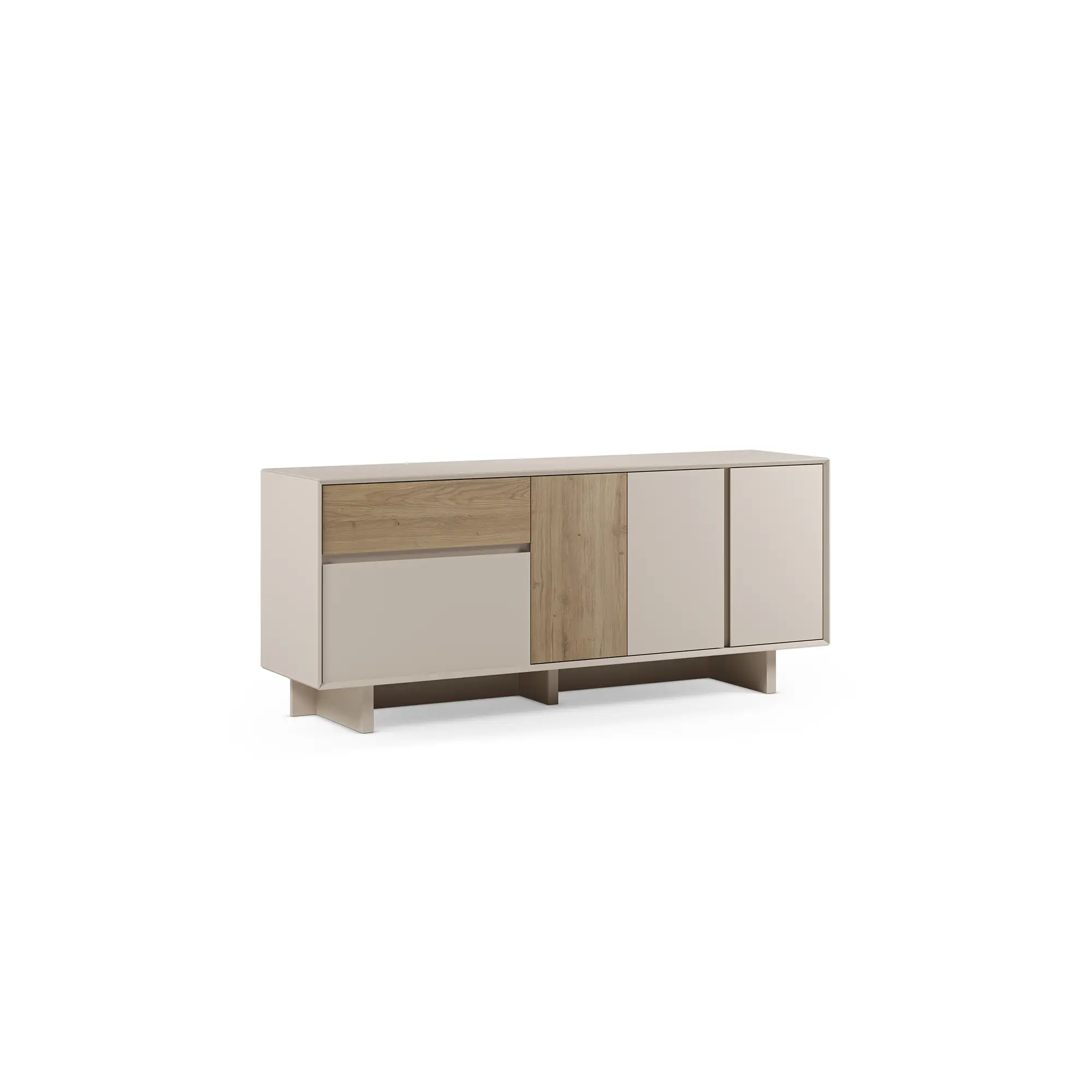 Aparador Carpi 4P1C es un mueble ancho de diseño moderno y asimétrico. Combina un color visón mate con madera roble claro. Cuenta con un cajón y cuatro puertas, ofreciendo gran capacidad de almacenamiento cerrado sobre una base de zócalo bajo.
