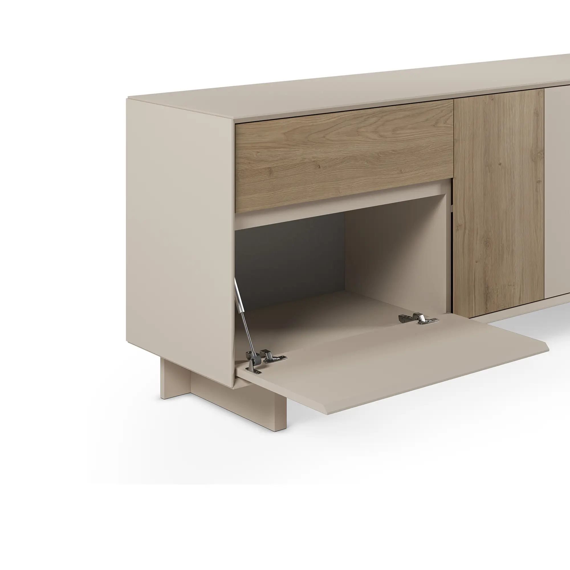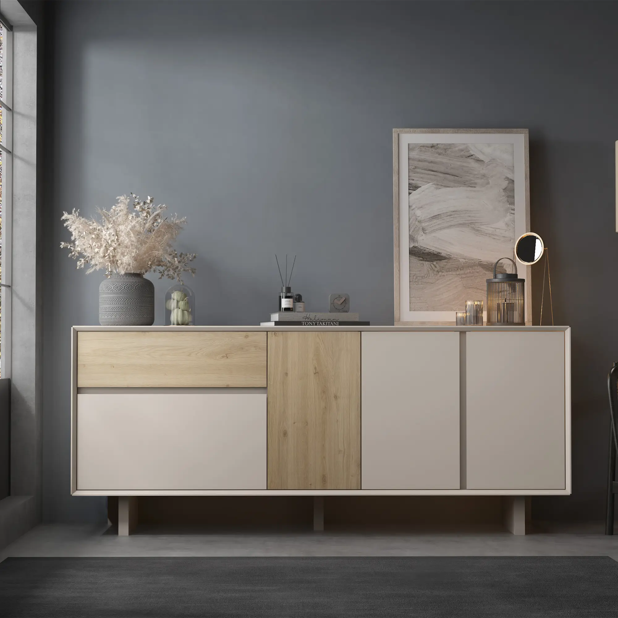 Acabado Bicolor de Contraste: El aparador combina un color base visón con frentes de madera de roble cádiz con veta visible.