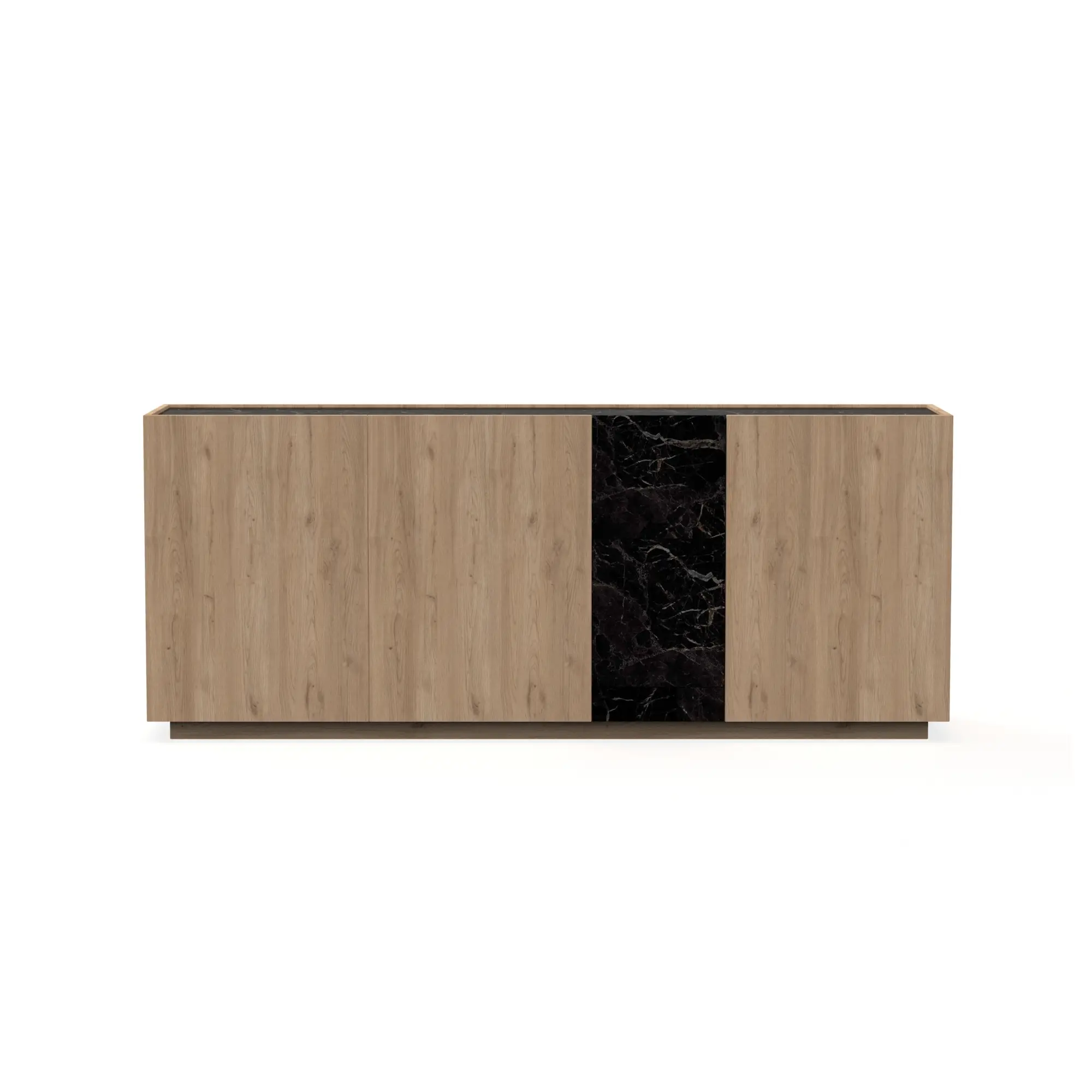 Eleva la categoría de tu salón con la imponente presencia del aparador Dione de 4 puertas. Este mueble de gran formato fusiona la calidez de la madera sepet con la sofisticación eterna del mármol Lotus en una estructura perfectamente simétrica. Con sus 180 cm de ancho, es la pieza definitiva para quienes exigen máxima capacidad de almacenaje sin renunciar a un diseño de alta gama que irradia orden y distinción