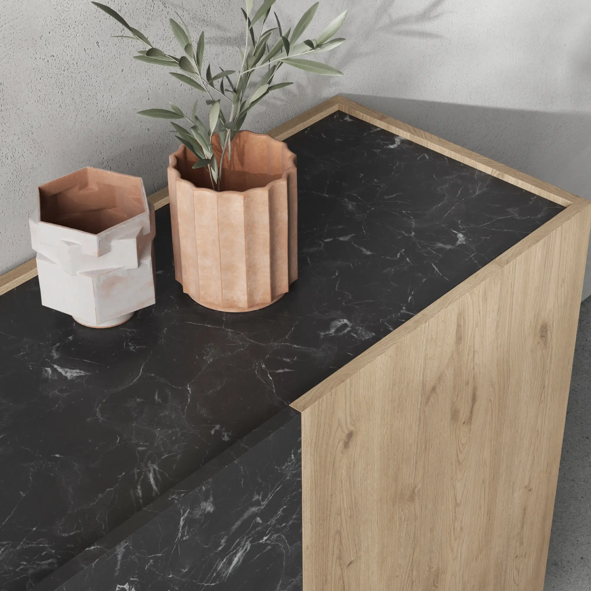 El aparador Dione de 180 cm es la máxima expresión de la colección de Marckeric. Diseñado para presidir salones de grandes dimensiones, este modelo de cuatro puertas utiliza la repetición geométrica para crear una sensación de calma y orden absoluto. El contraste entre la textura orgánica del acabado sepet y el veteado mineral del mármol Lotus se despliega aquí en toda su magnitud, ofreciendo una superficie de diseño continua y fascinante.