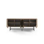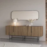 Con su gran tamaño de 200 cm, el Aparador Eldia ofrece una superficie generosa y una capacidad de almacenamiento excepcional, siendo ideal para un salón o comedor que busca combinar la calidez de la madera con un diseño contemporáneo.