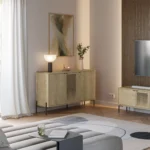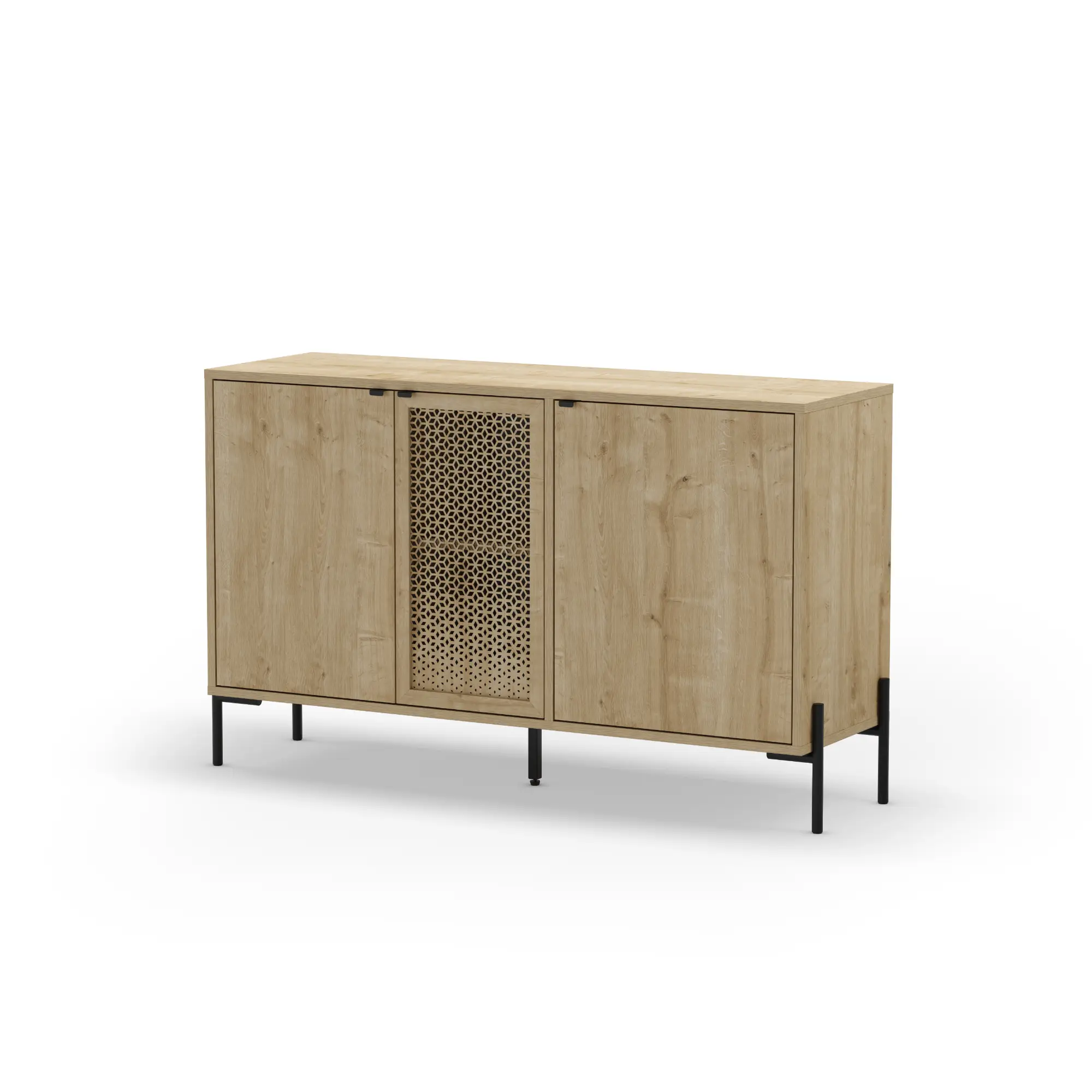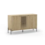 El aparador Inca de 3 puertas es la definición de mobiliario con personalidad propia. Marckeric ha diseñado esta pieza para quienes no se conforman con superficies lisas; el modelo Inca apuesta por un frontal con carácter donde el acabado roble se presenta de forma dinámica. La calidez de la madera se ve reforzada por una base metálica en negro, logrando un contraste de materiales que es tendencia absoluta en el interiorismo de corte industrial y urbano.