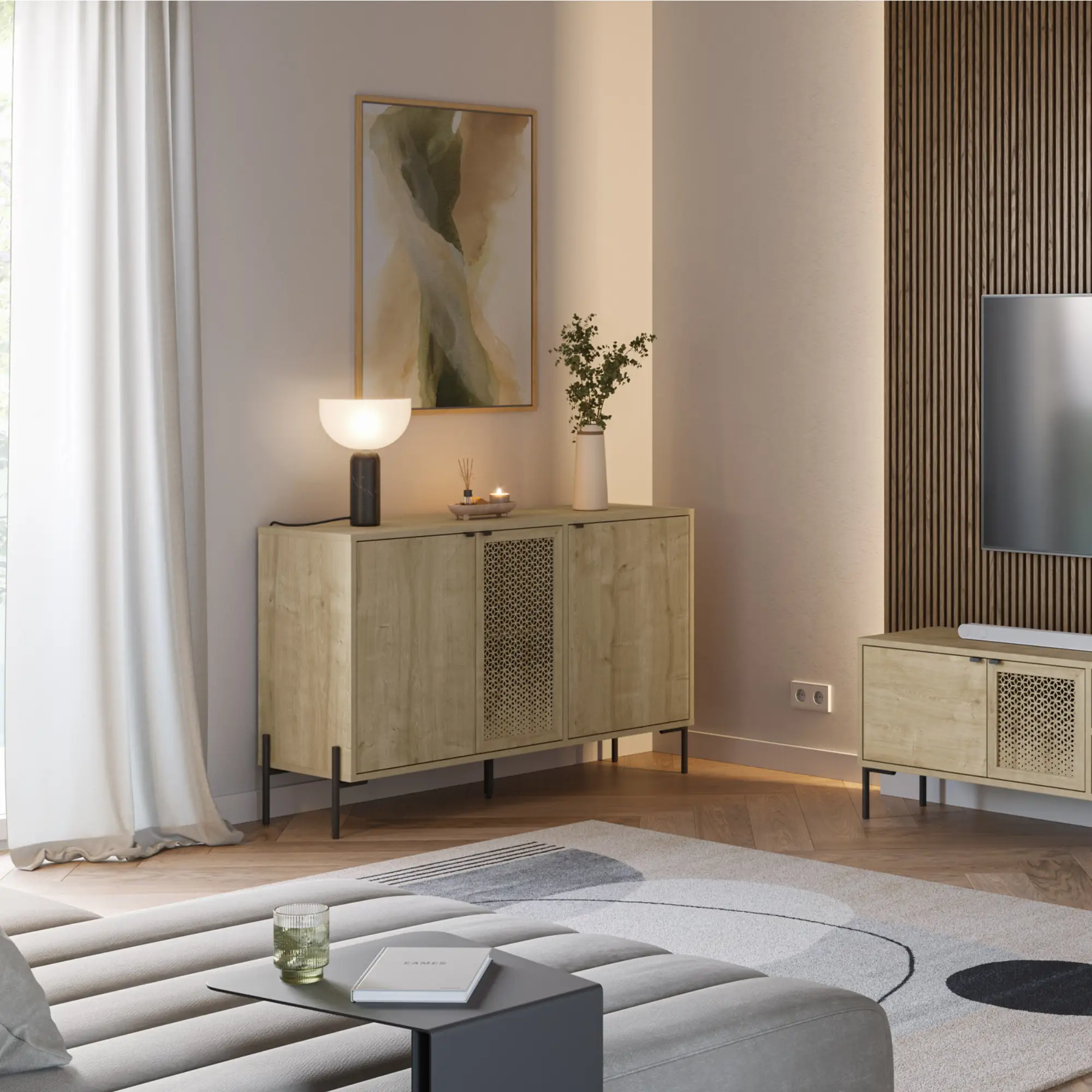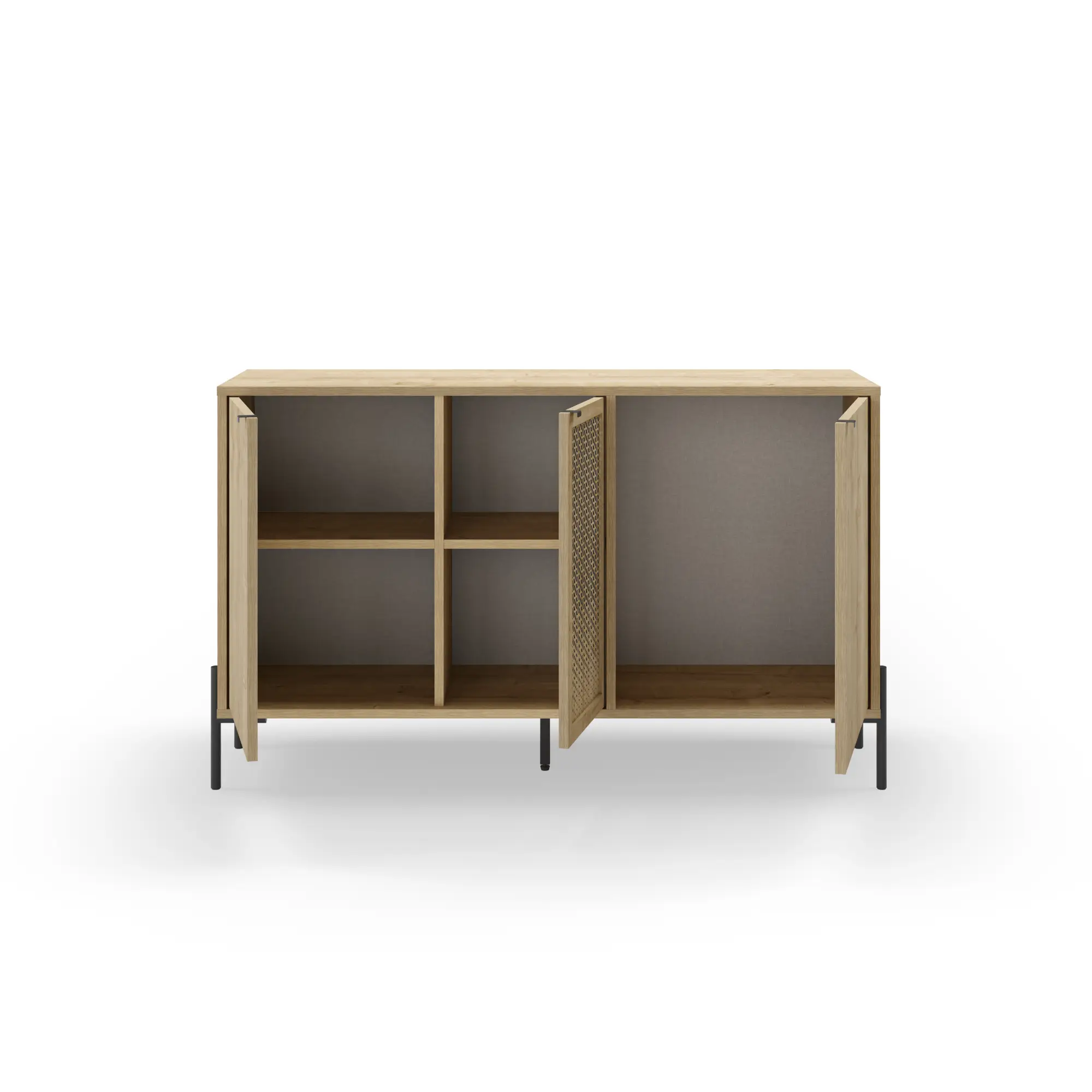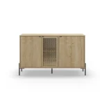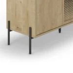 Dale una nueva dimensión a tu salón con el aparador Inca. Este mueble de tres puertas destaca por su fascinante juego de texturas en acabado roble, donde el veteado natural cobra vida sobre una estructura de inspiración geométrica. Sus estilizadas patas metálicas elevan el diseño, aportando una ligereza industrial que equilibra la fuerza de la madera. Una pieza con alma y gran capacidad para hogares que buscan huir de lo convencional.