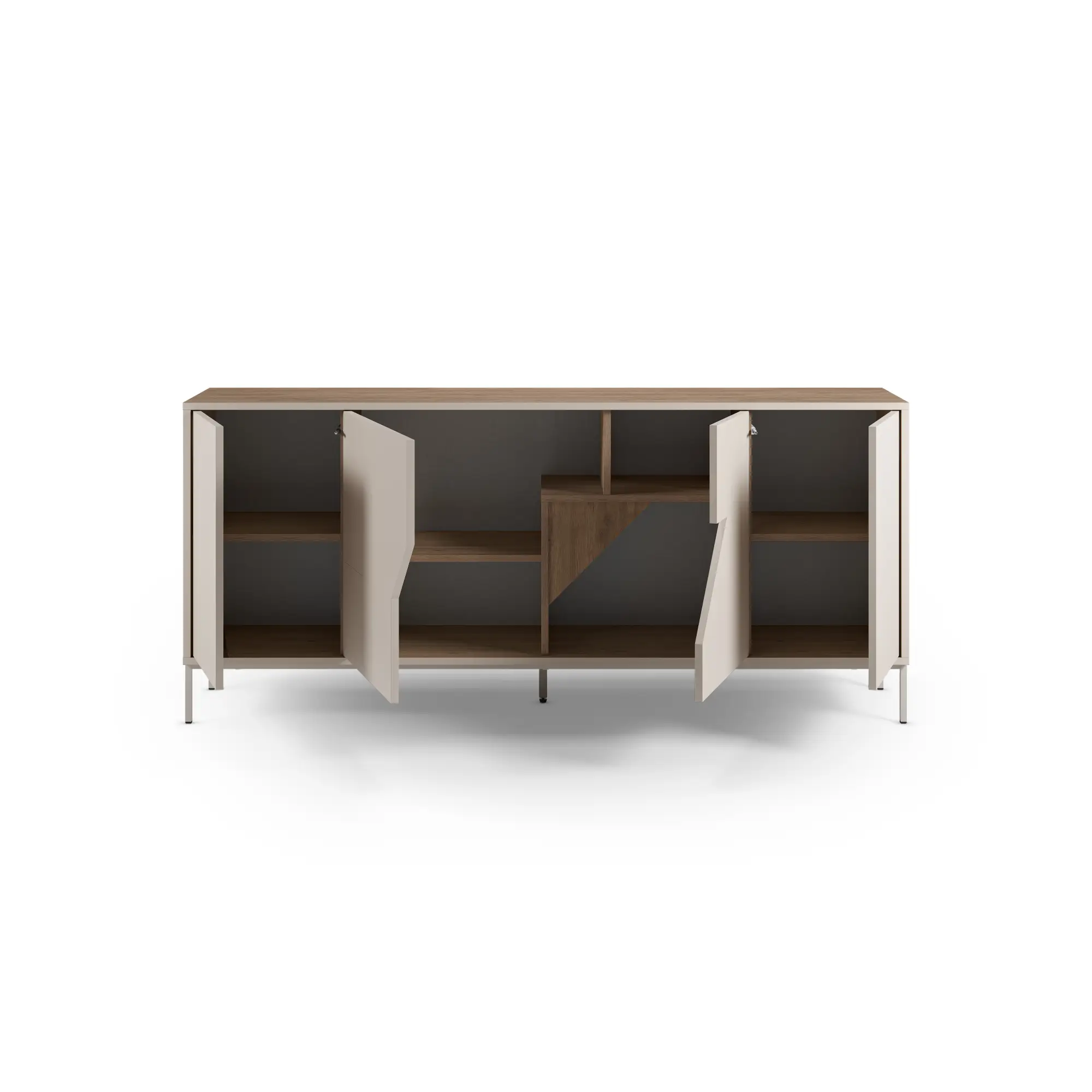 Configuración de 4 Puertas: Este aparador maximiza el volumen de guardado interno, permitiendo clasificar desde vajillas completas y cristalería hasta objetos voluminosos de uso ocasional.