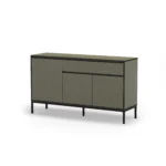 El Aparador Lorenza de 140 cm en acabado Verde y Negro redefine el concepto de mueble auxiliar. Esta pieza destaca por su frente en un tono verde profundo que evoca elegancia y calma, equilibrado por una estructura y patas metálicas en negro. Con 3 puertas y 1 cajón, es el mueble perfecto para quienes buscan una pieza de autor que maximice el almacenamiento sin saturar el espacio visual del salón.