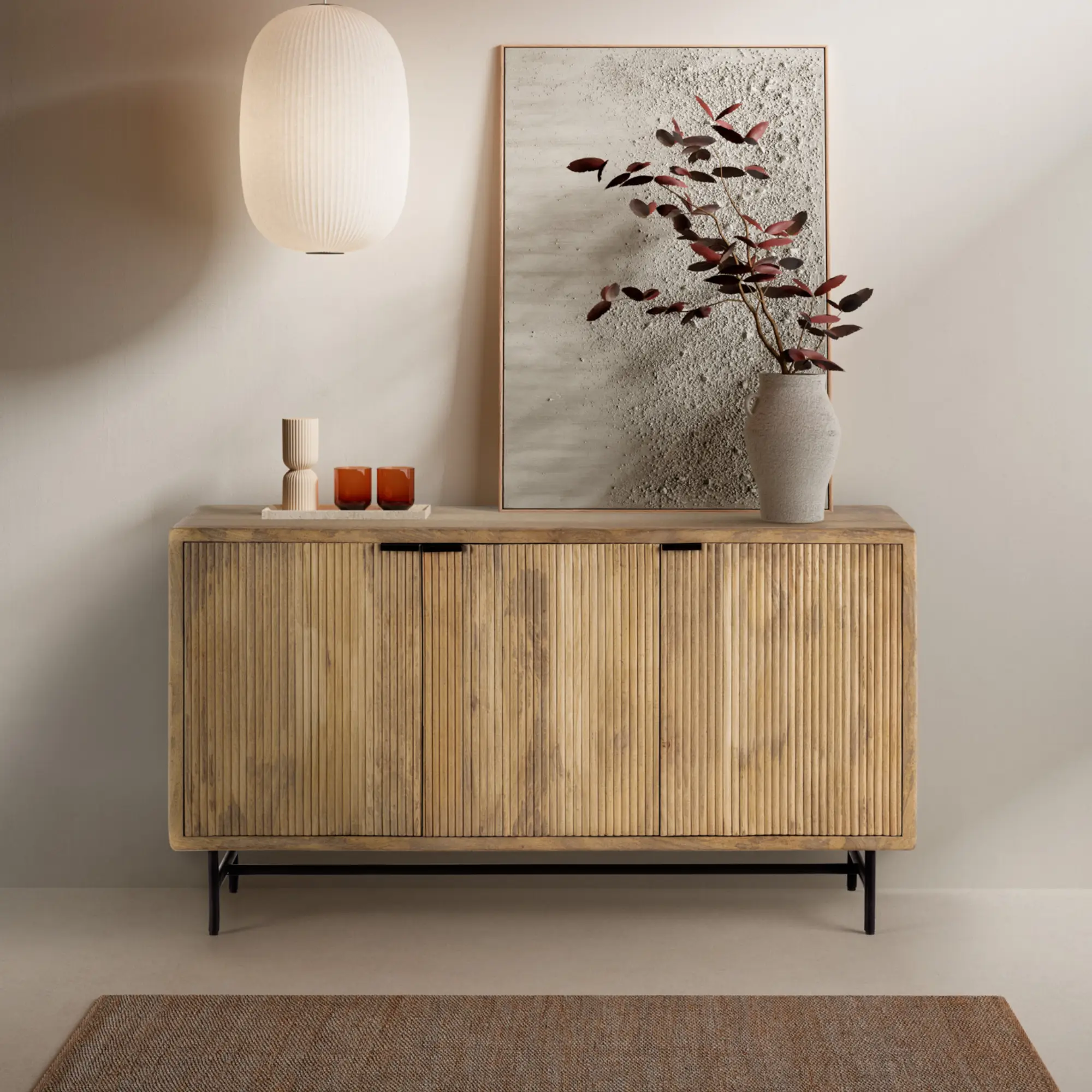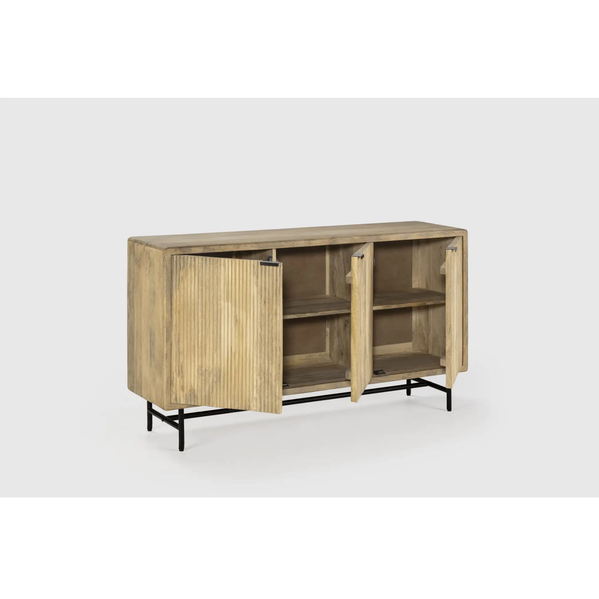 Aparador Mundra 3P de 150 cm en madera de mango con patas de metal, moderno y funcional, ideal para almacenar con estilo.