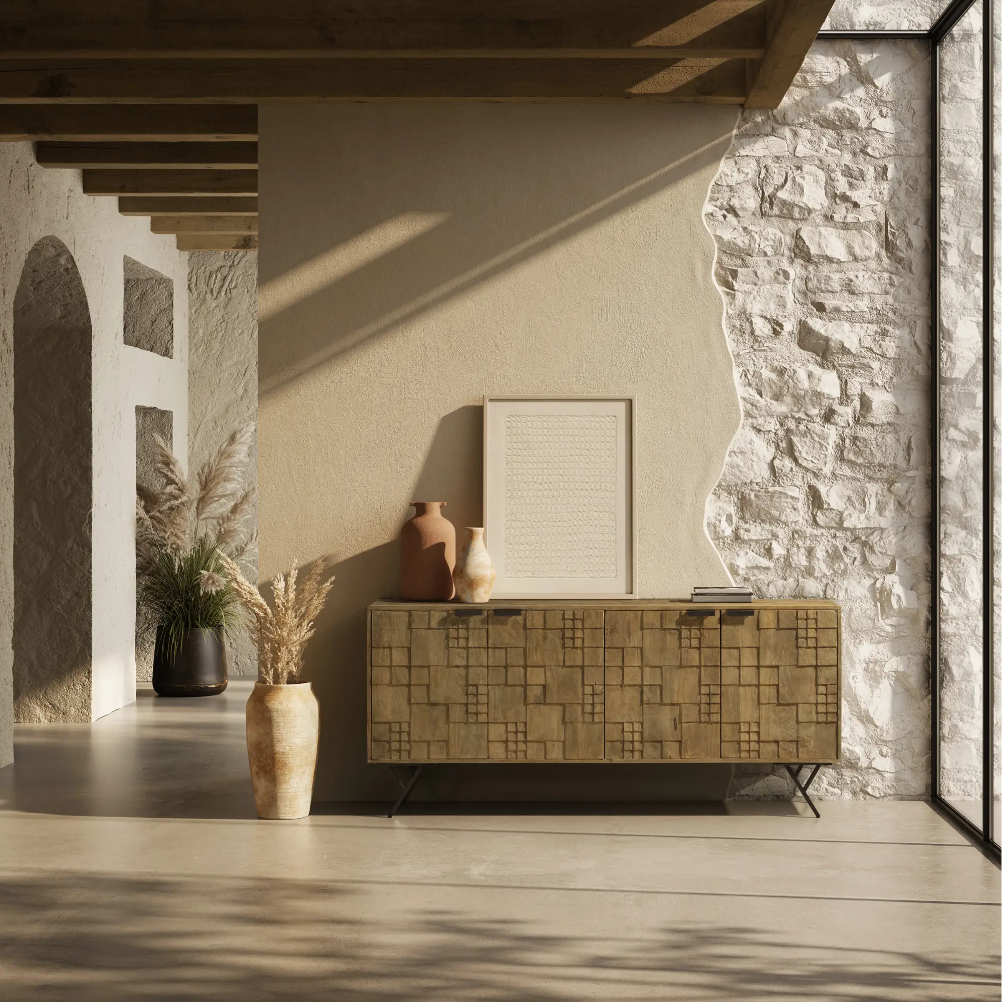 Aparador Priya 4P en madera de mango con acabado lavado, funcional y con estilo natural, ideal para organizar y decorar el espacio.