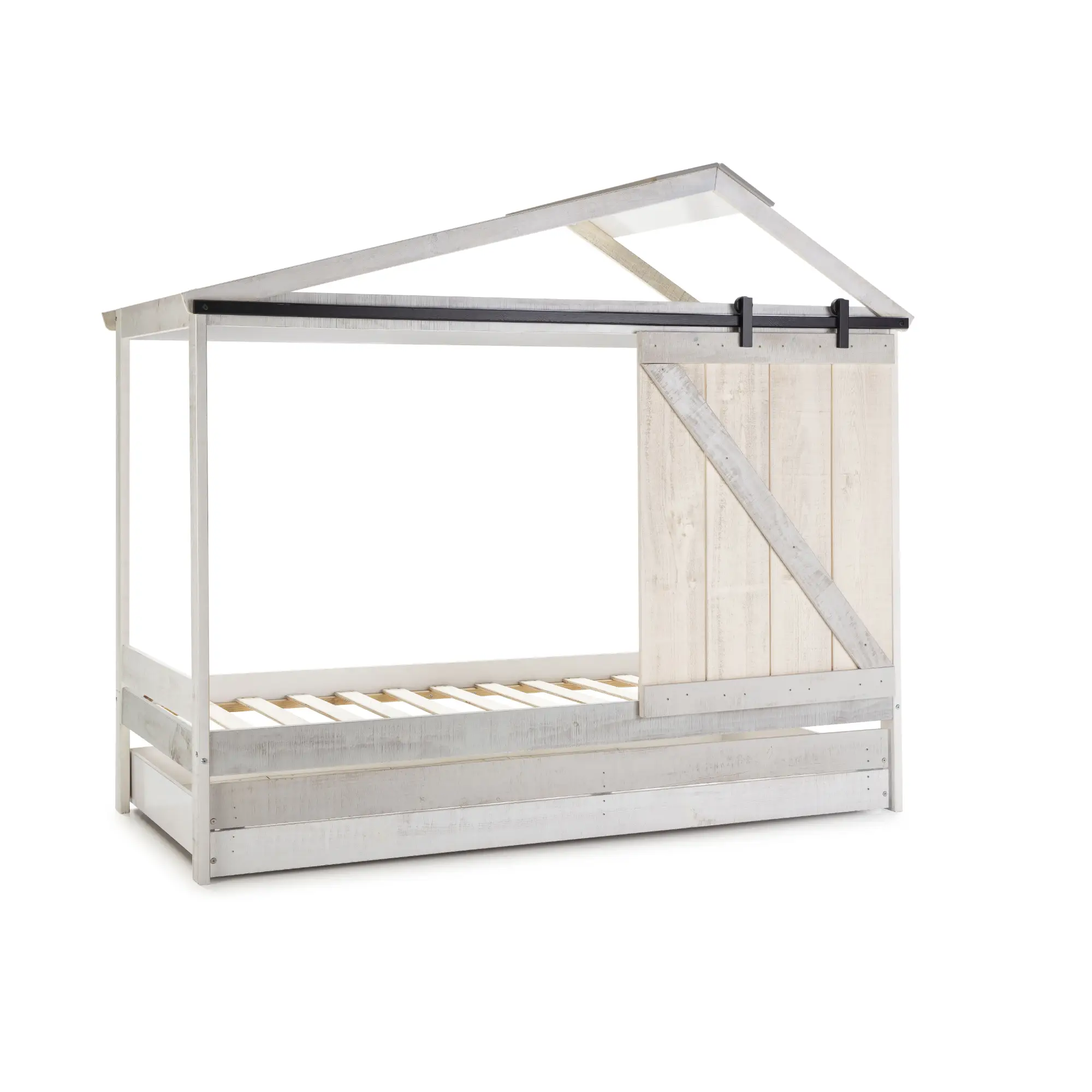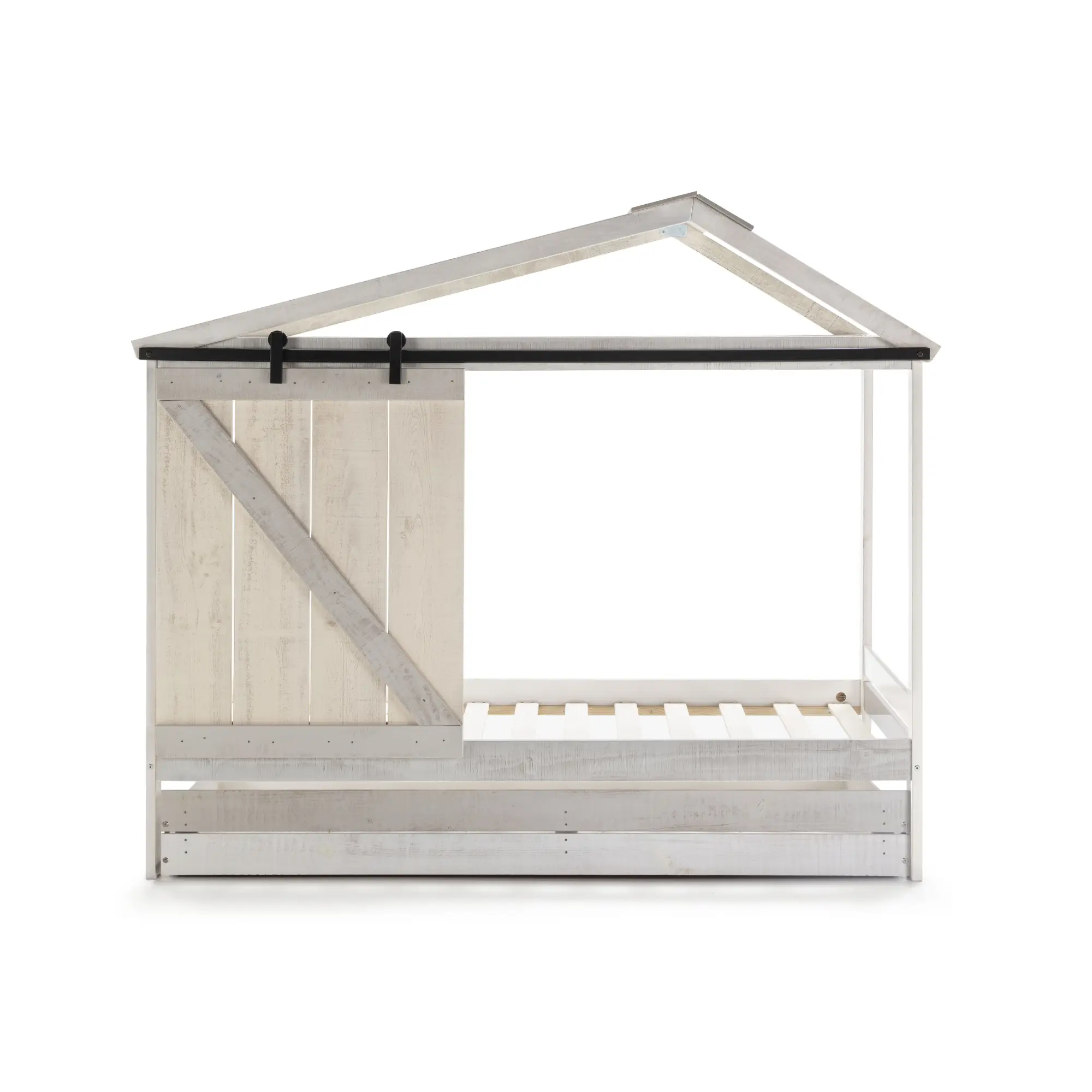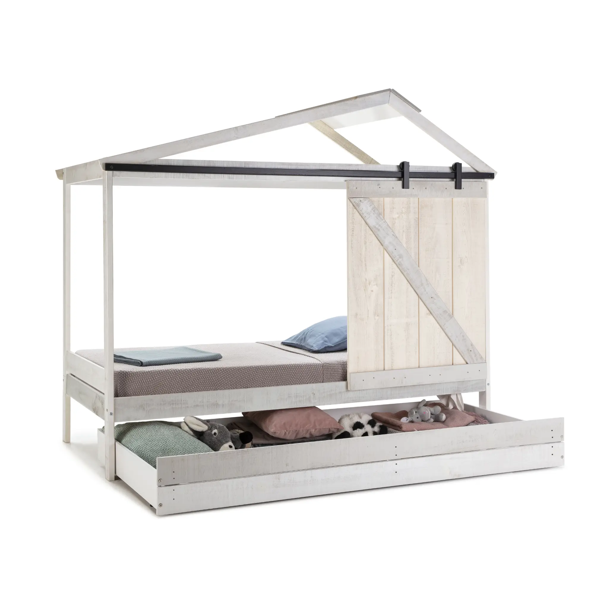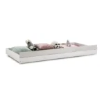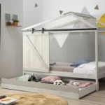 Cajón en blanco rústico y gris claro para cama cabaña diseñado para añadir almacenamiento extra y mantener el dormitorio ordenado