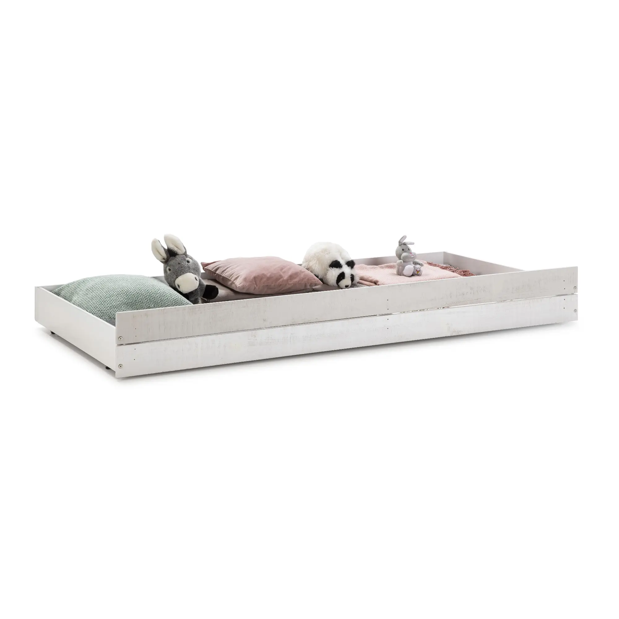 El cajón cabaña Lara 90 cm en acabado blanco rústico y gris claro es un complemento práctico diseñado para colocarse bajo la cama tipo cabaña, proporcionando un espacio extra de almacenamiento. Su diseño combina funcionalidad y estética, integrándose perfectamente en dormitorios infantiles o juveniles.