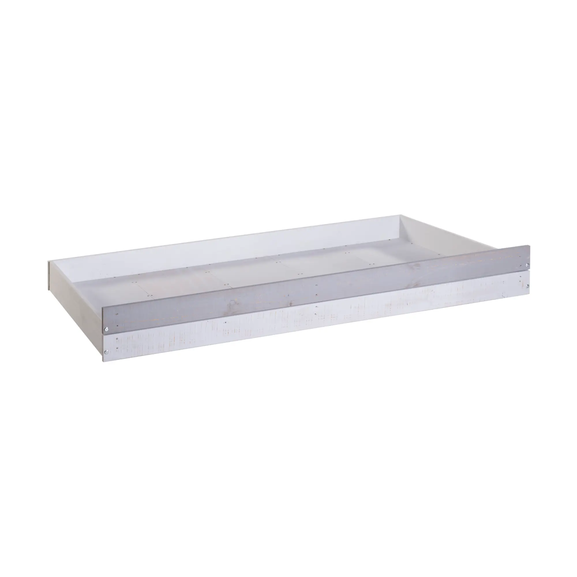 Cajón blanco y gris para cama pensado para añadir almacenamiento extra y mantener el dormitorio organizado