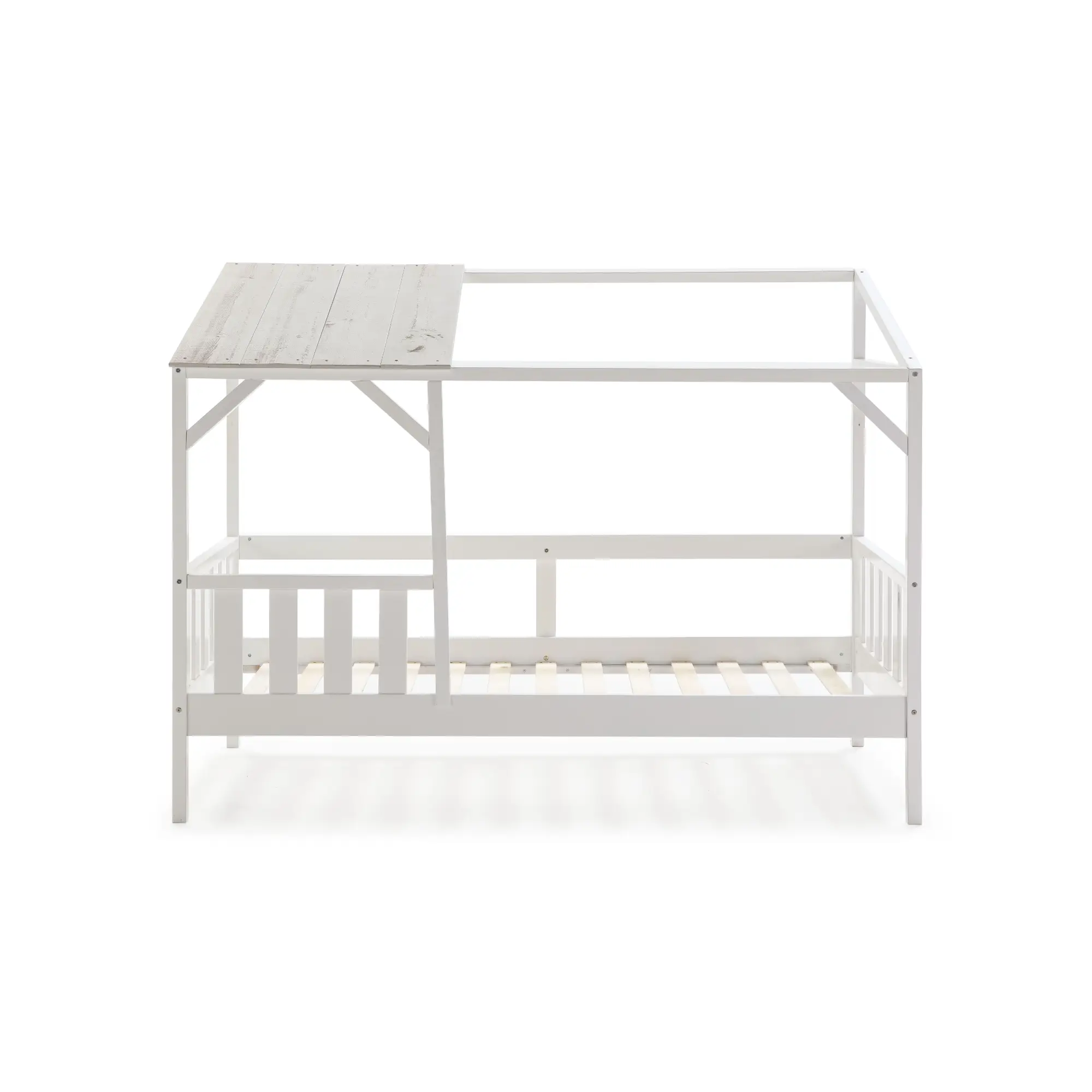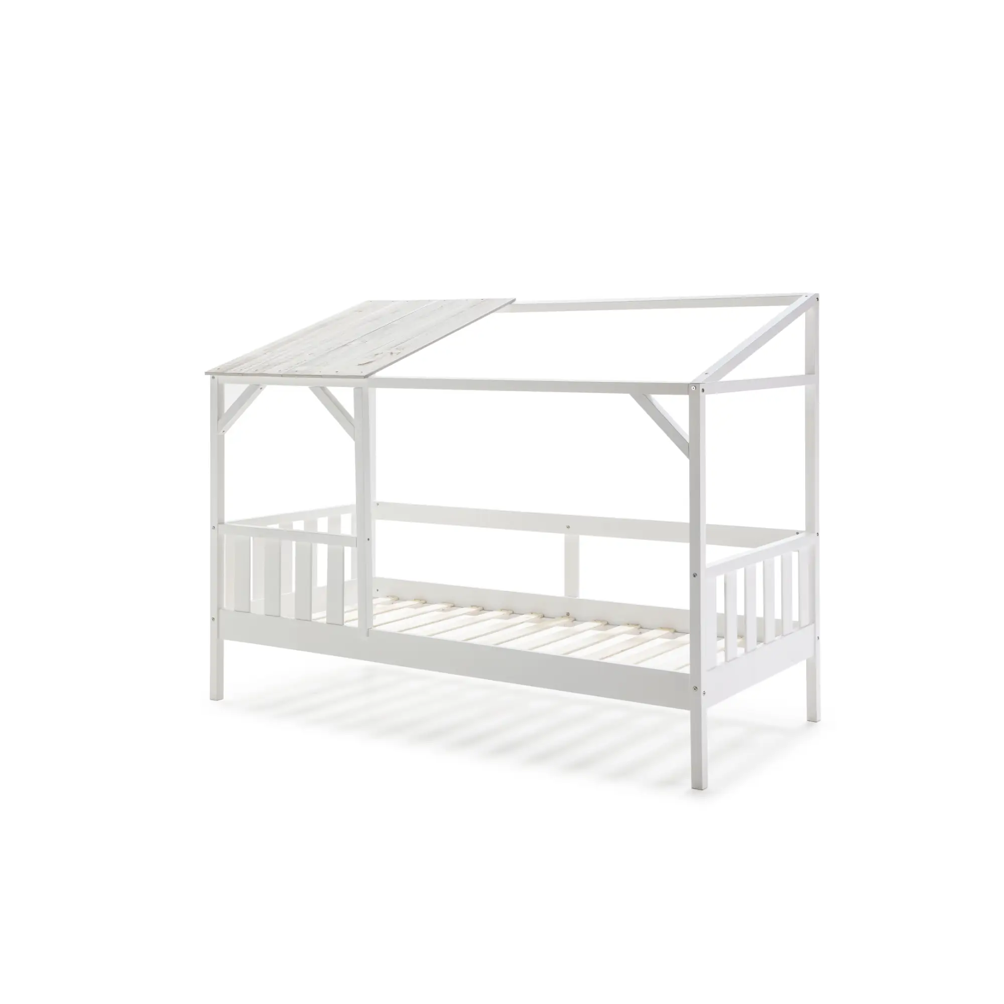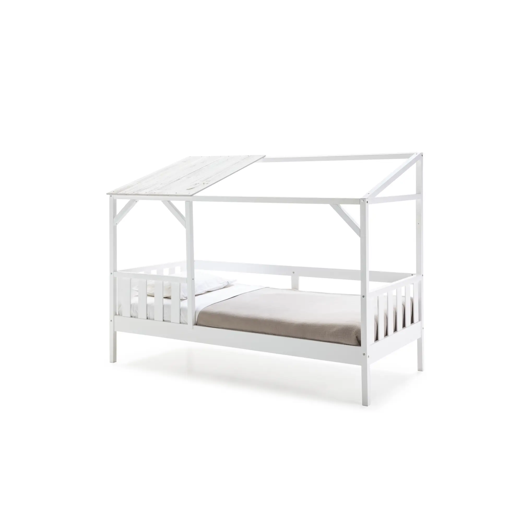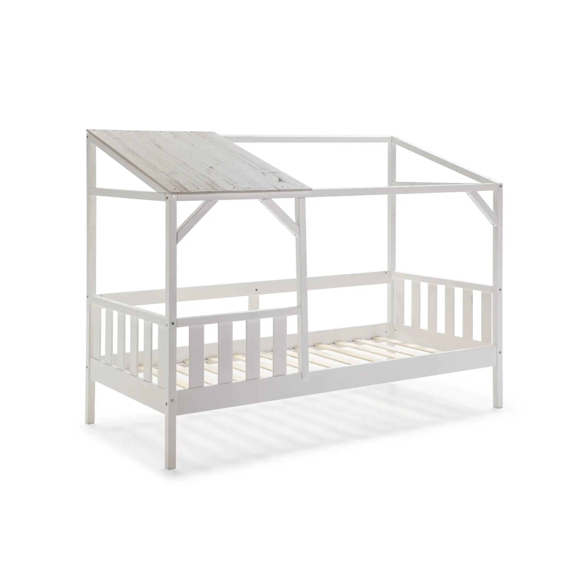 La cama cabaña Amón 90×200 en acabado blanco y blanco rústico es una cama infantil de estilo nórdico diseñada con estructura tipo casita que aporta un ambiente acogedor y lúdico al dormitorio. Combina funcionalidad y diseño, creando un espacio ideal tanto para el descanso como para el juego.