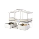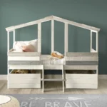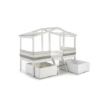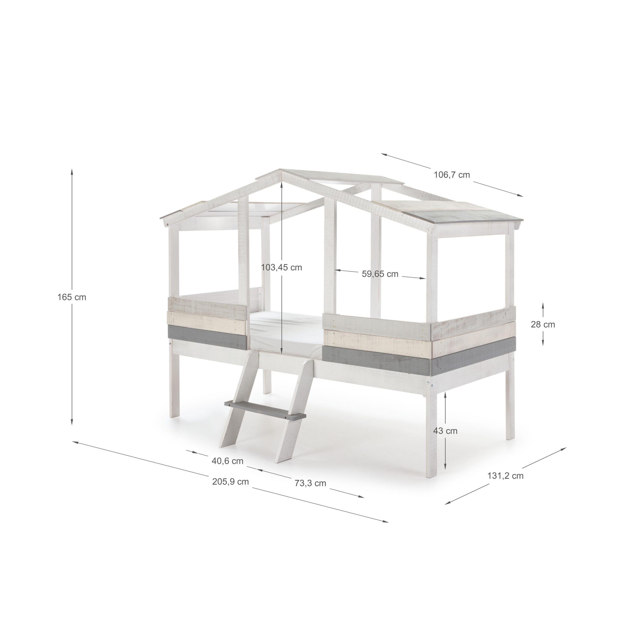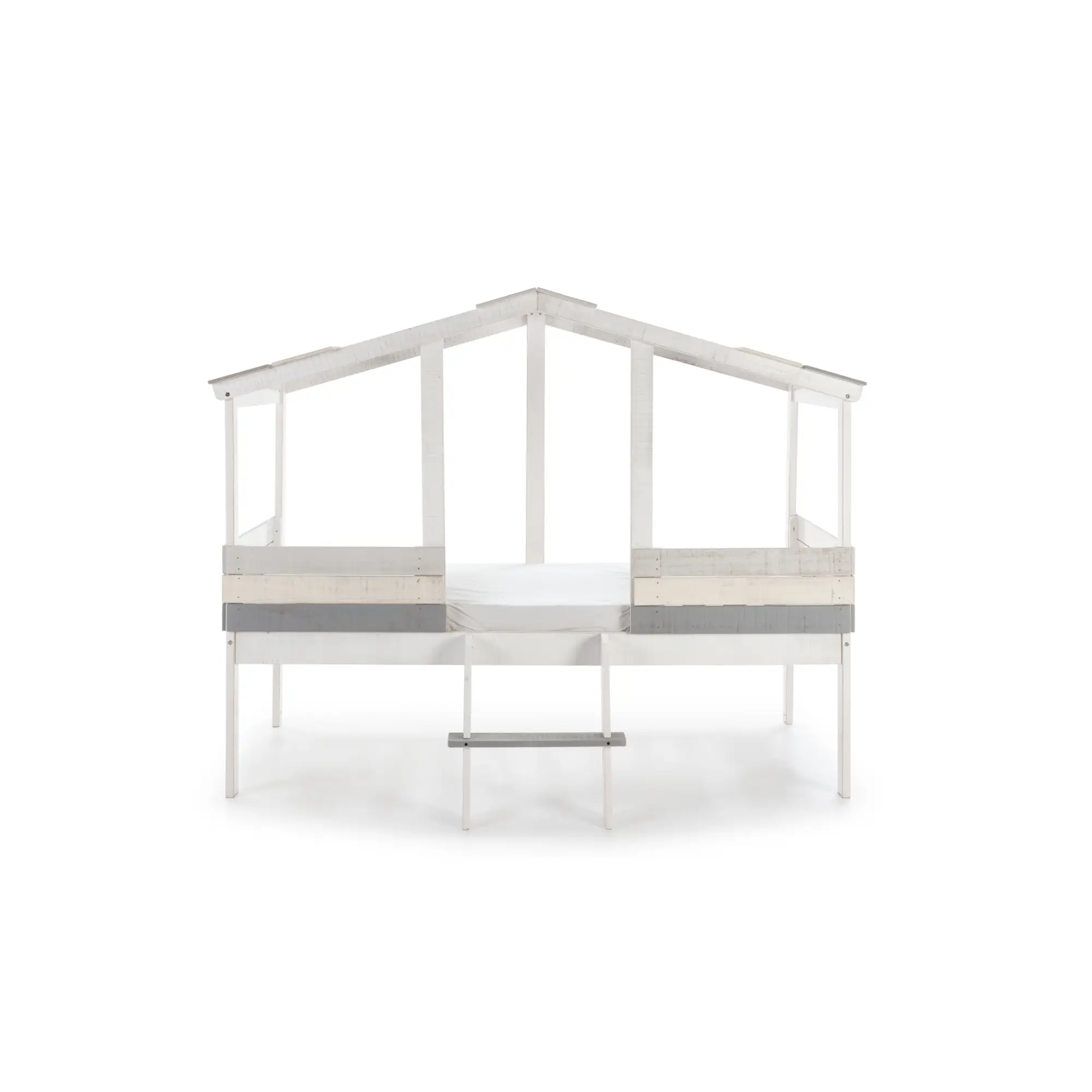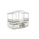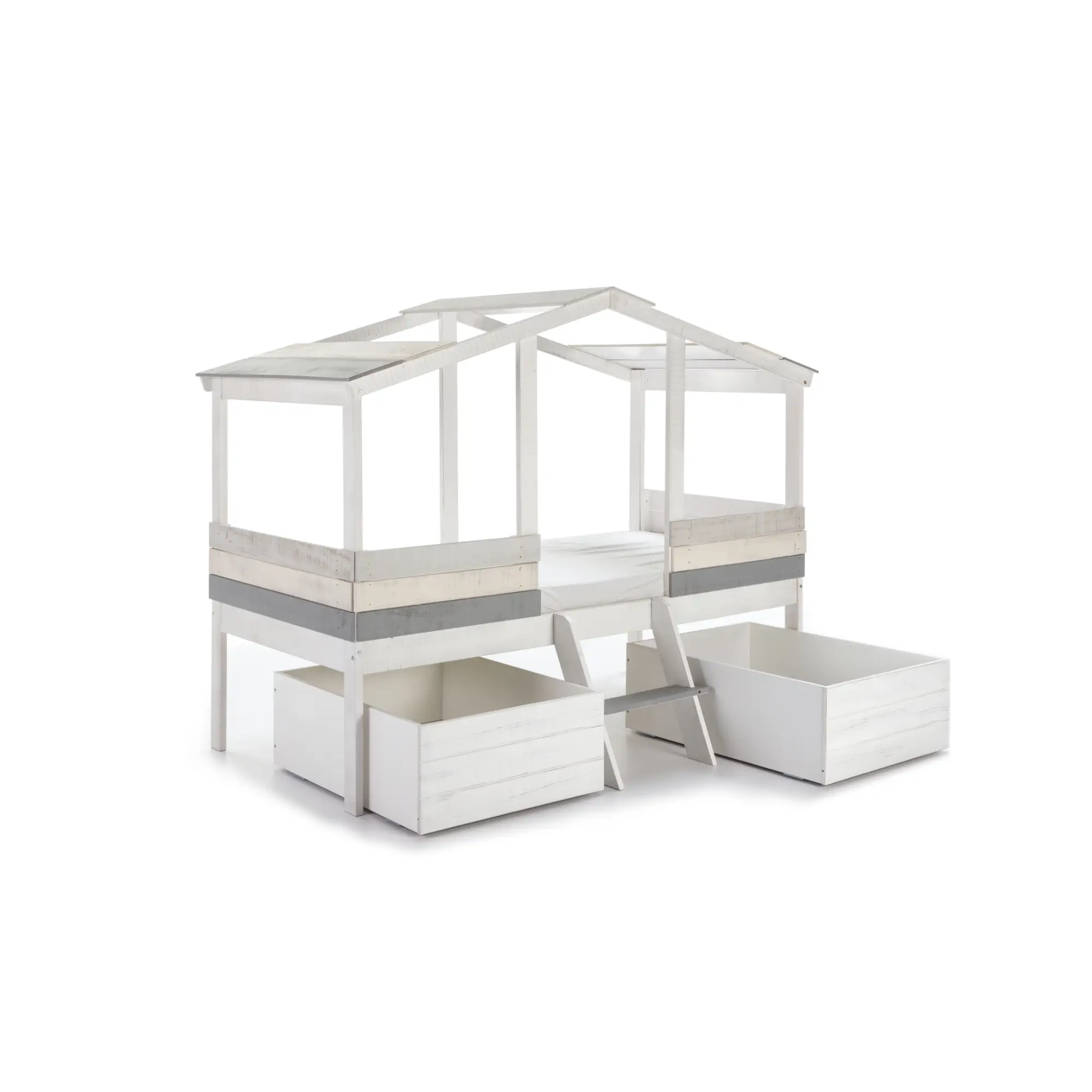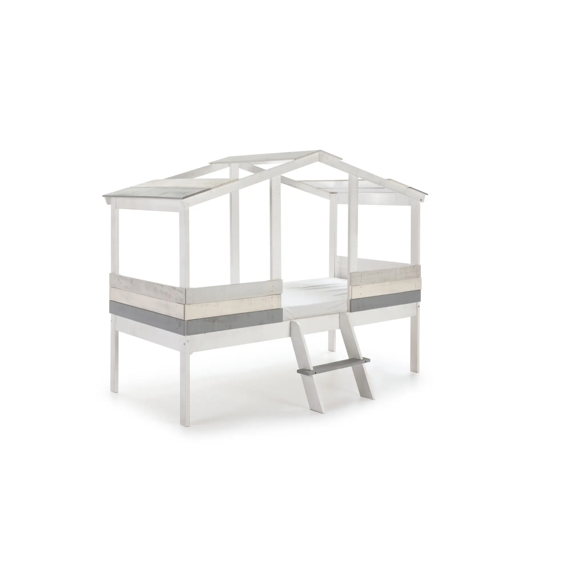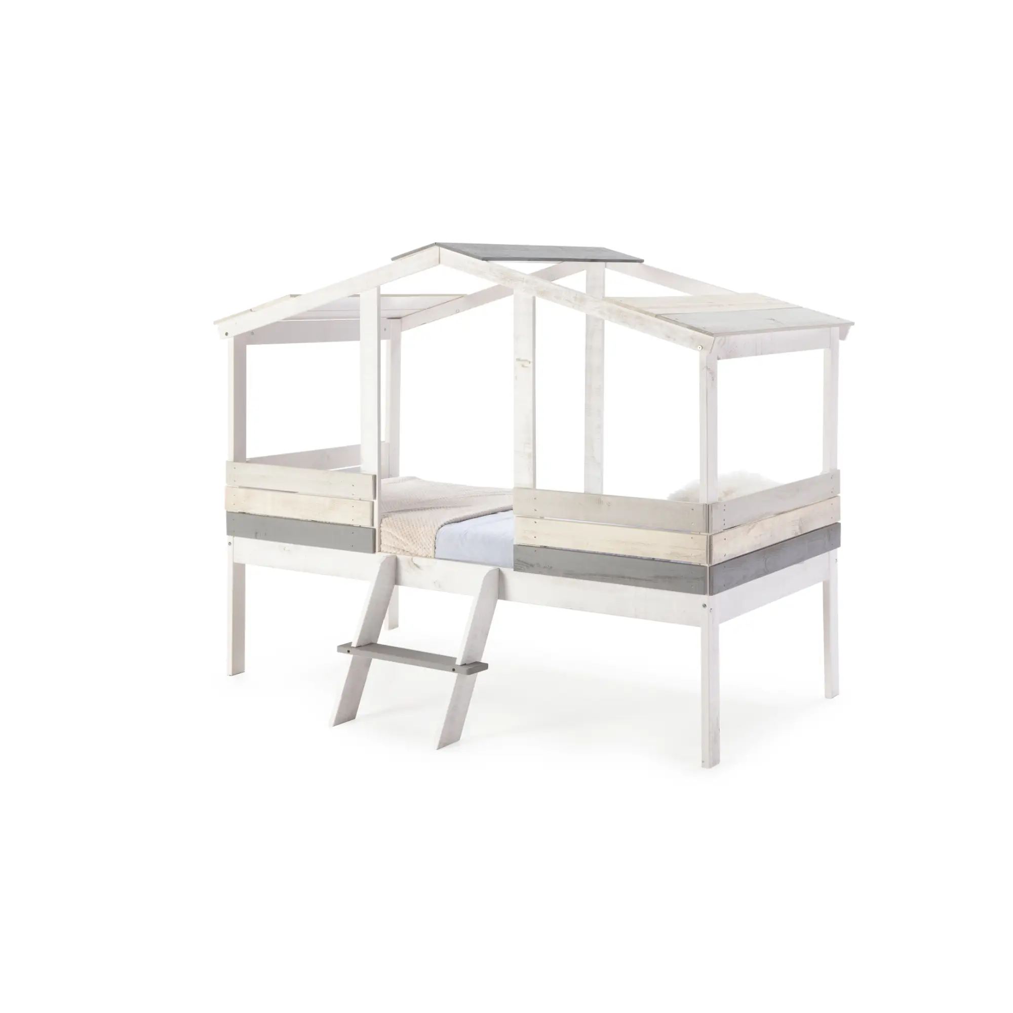 Cama tipo cabaña en blanco rústico, gris claro y gris oscuro pensada para aportar confort y estilo moderno al dormitorio infantil o juvenil.