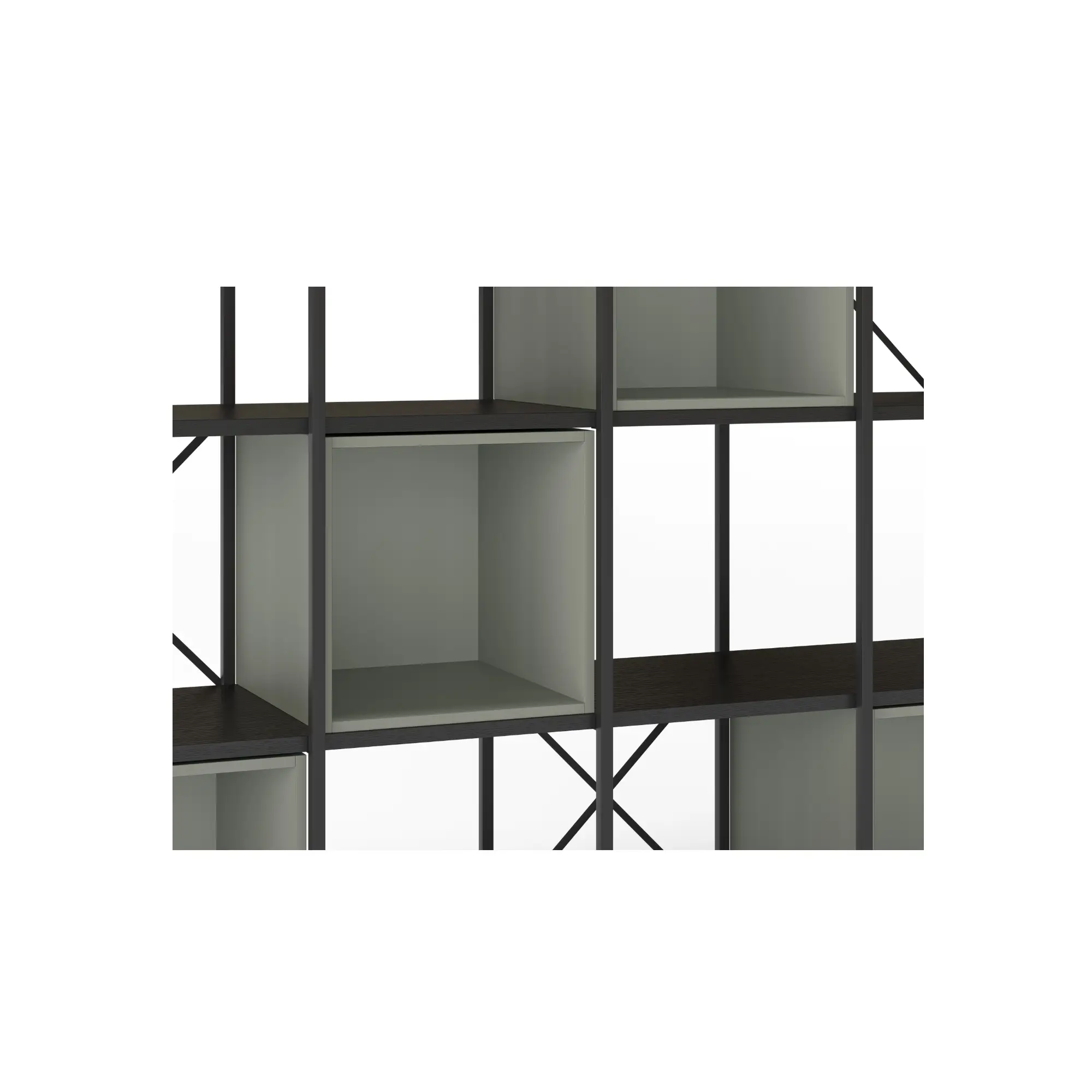• Varios estantes y cubos que permiten organizar libros, objetos decorativos o elementos de uso diario.
