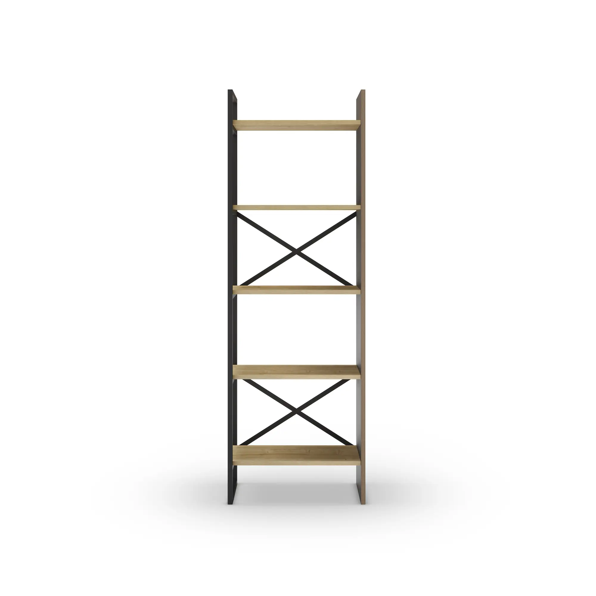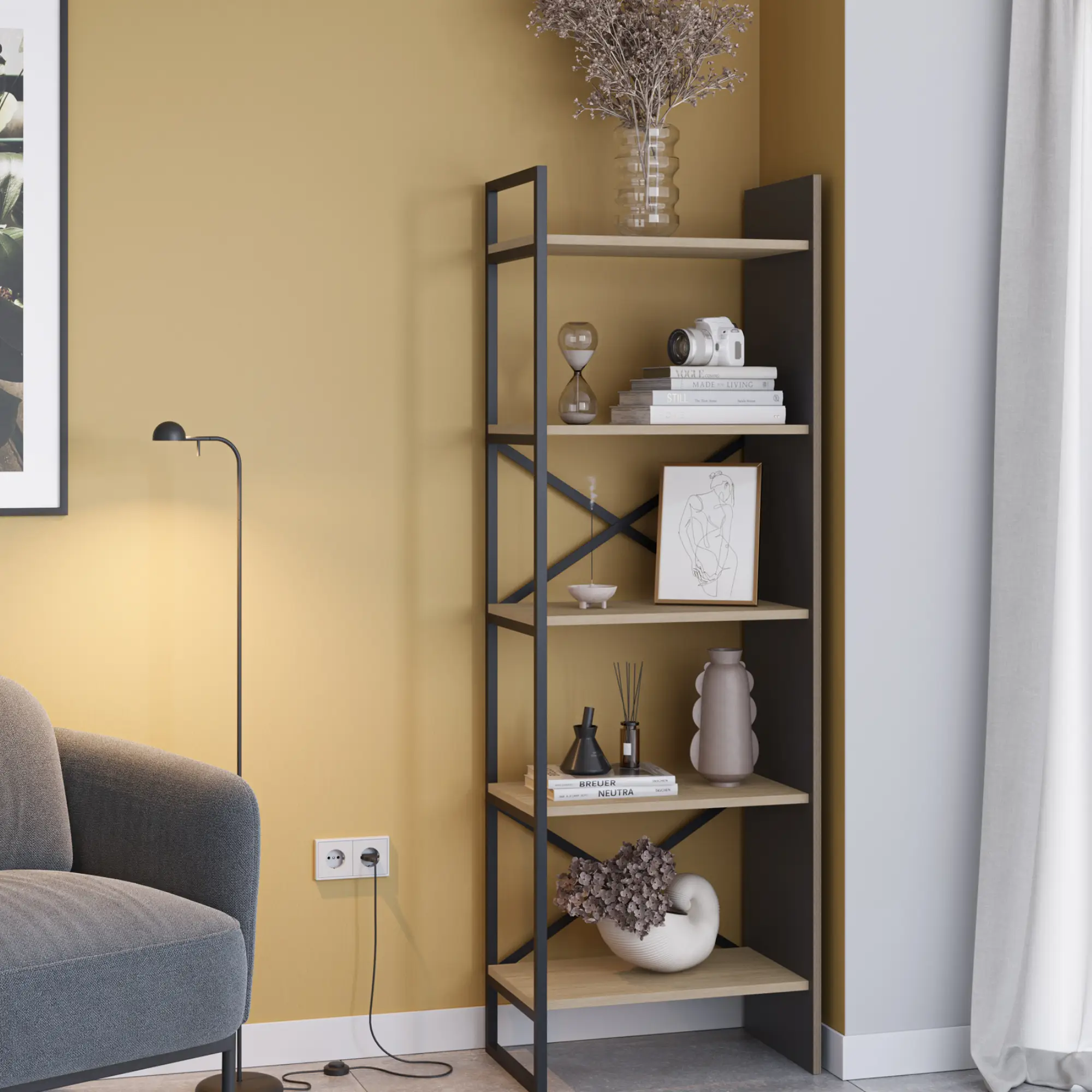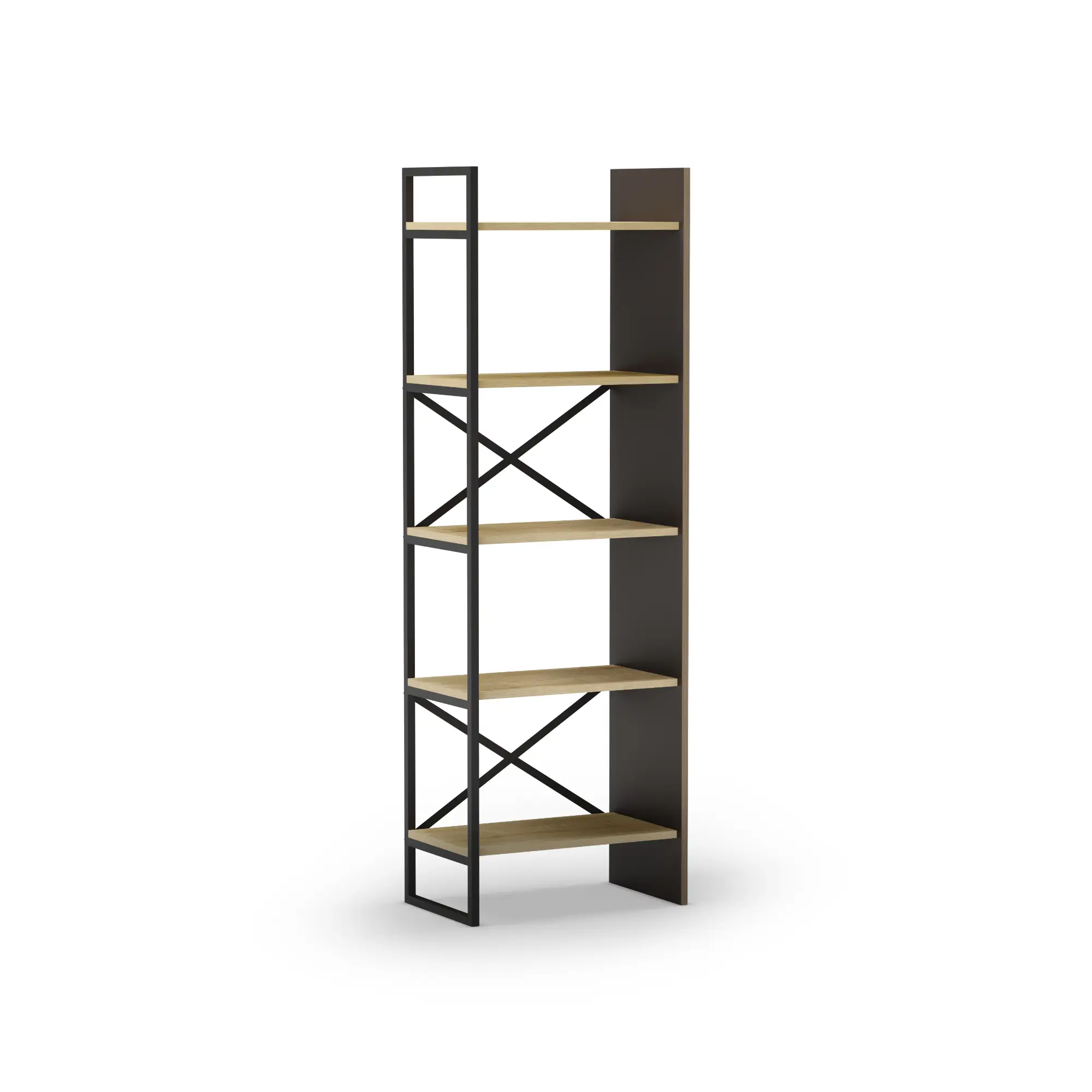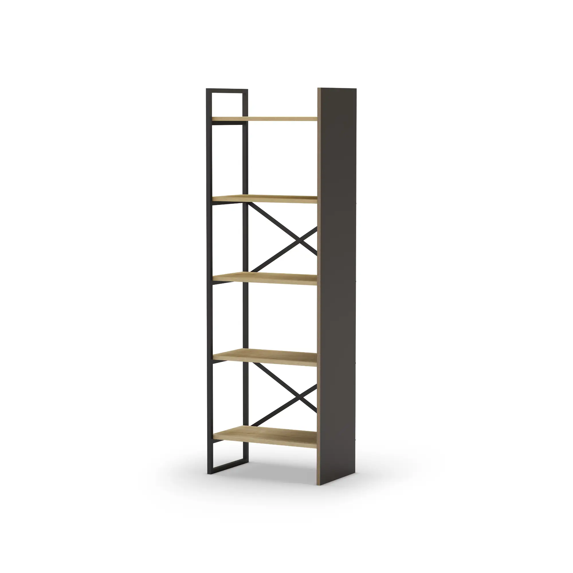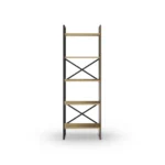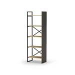 Estantería Ara en roble y negro silky con estructura metálica y estantes abiertos. Un mueble funcional y moderno perfecto para organizar libros y objetos decorativos en cualquier estancia del hogar.