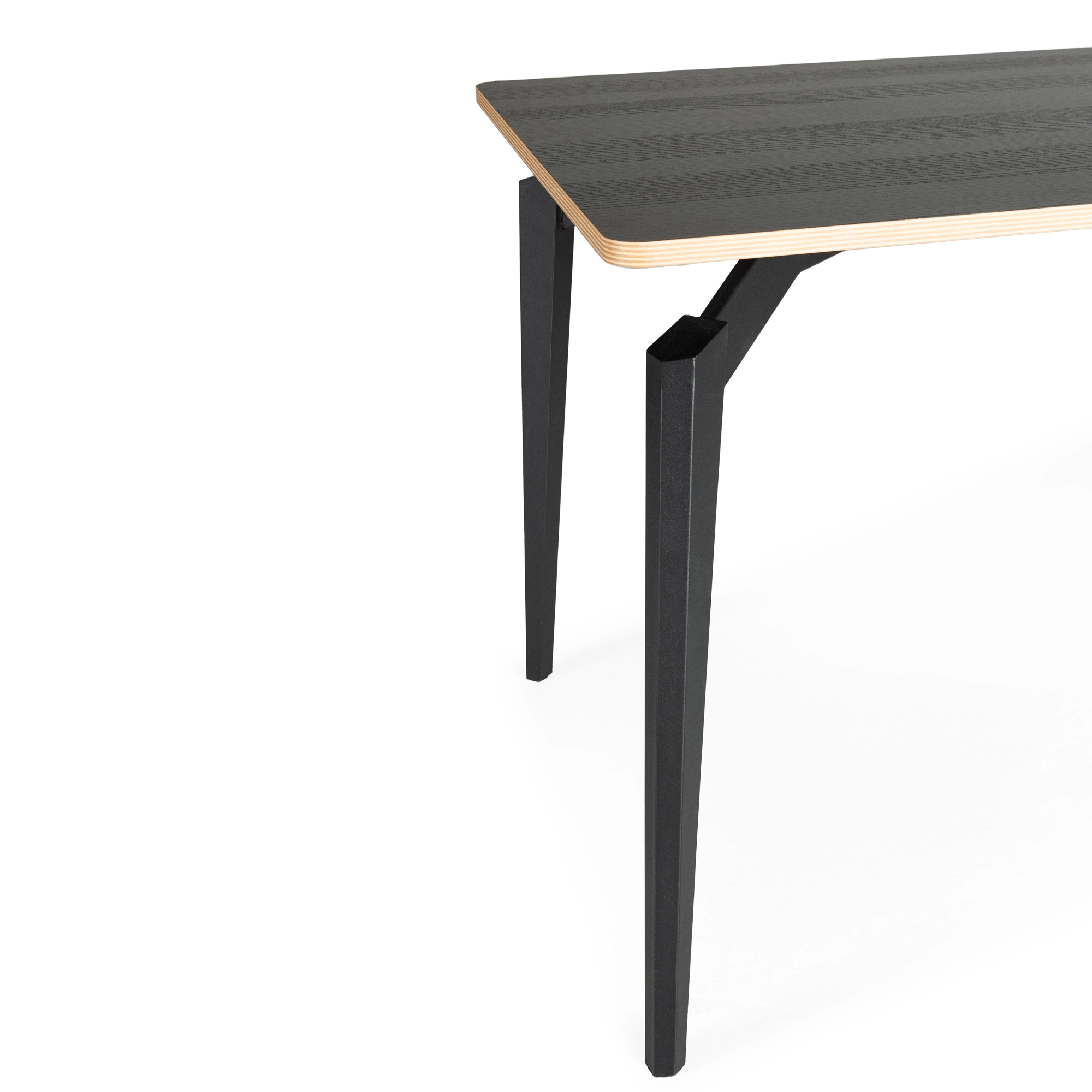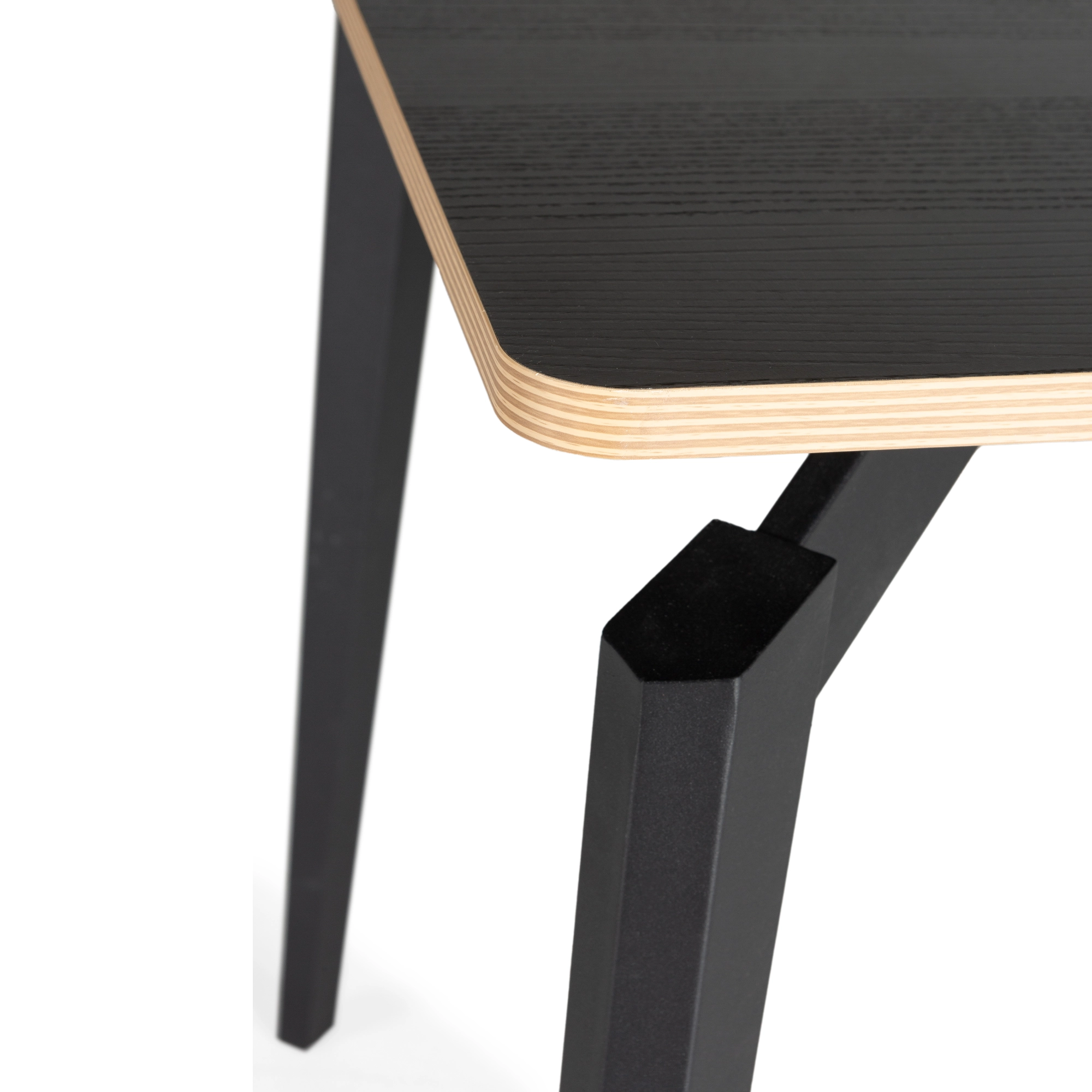 Canto Contrachapado (Plywood): A diferencia de las mesas totalmente lacadas, el modelo Denia deja a la vista el canto de madera contrachapada. Este detalle revela las capas naturales de la madera, rompiendo la monocromía del negro y aportando una calidez visual «raw» o bruta que es tendencia en el diseño de interiores actual.