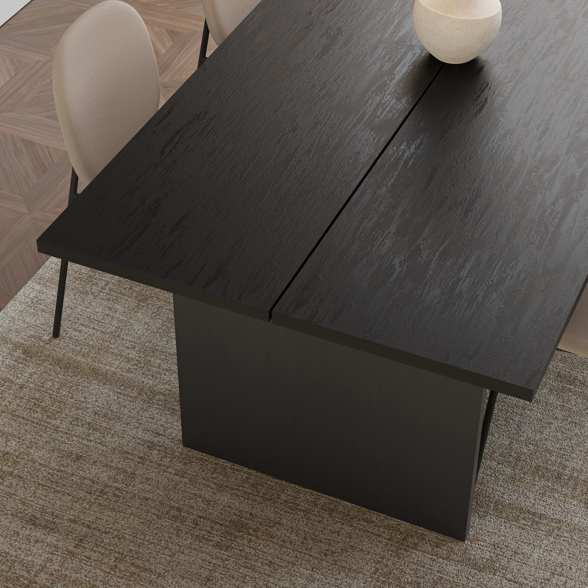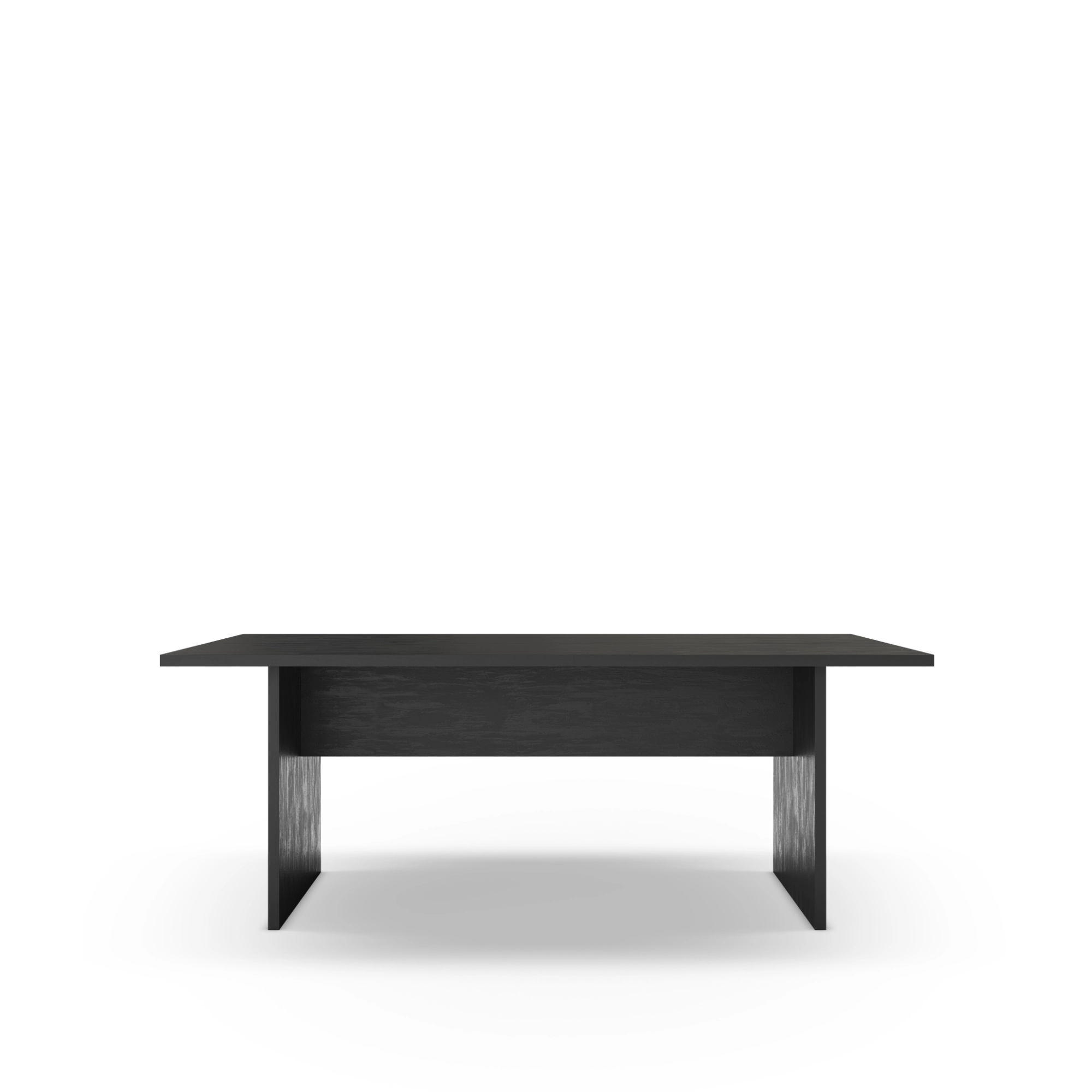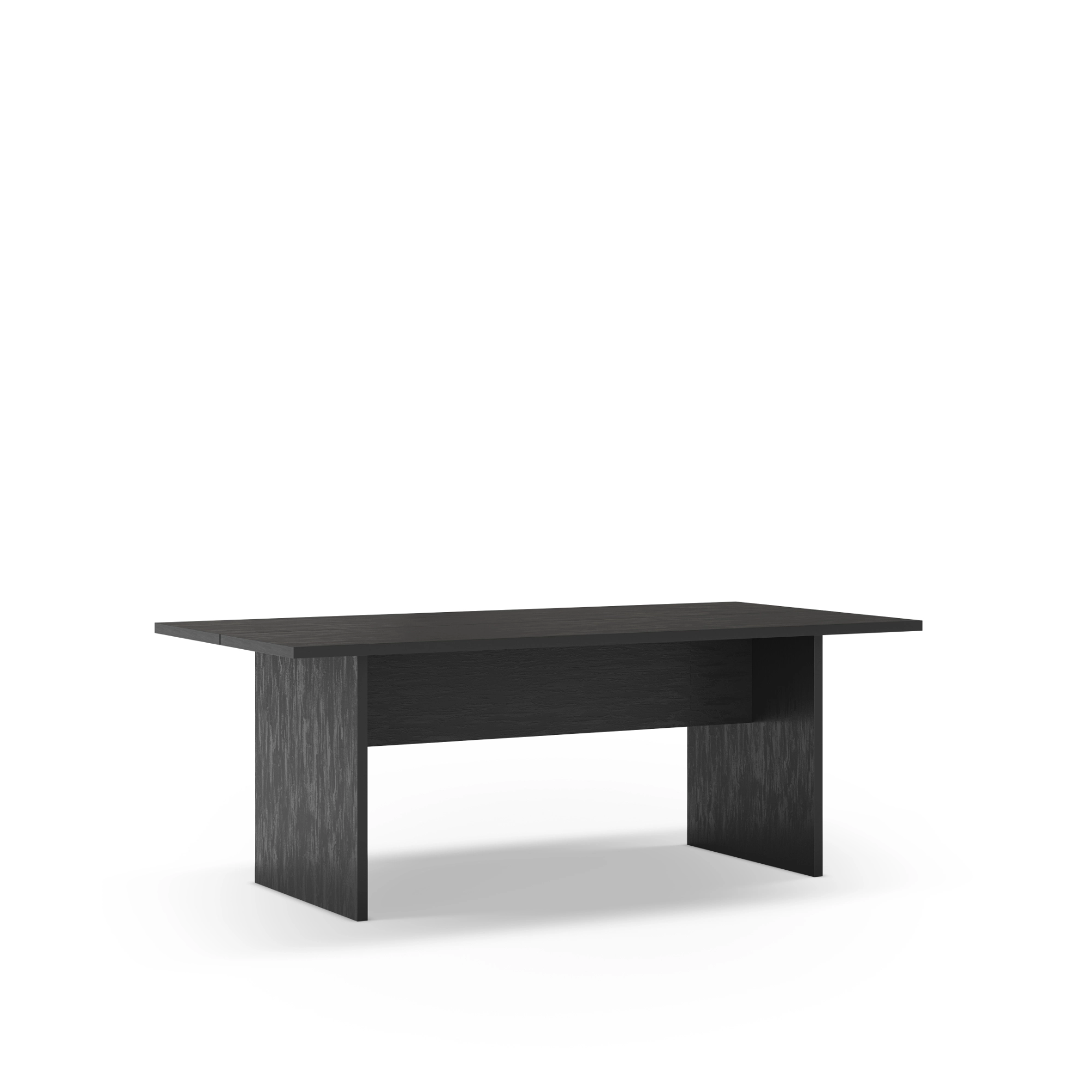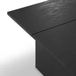 La Loana destaca por su minimalismo escultural. Su tablero rectangular de 200 cm ofrece una superficie amplia y despejada, ideal para salones de grandes dimensiones o salas de juntas con personalidad. El acabado en negro con efecto travertino (TRV) proporciona una textura visual rica y profunda que emula la piedra natural, pero con la versatilidad de los materiales modernos.