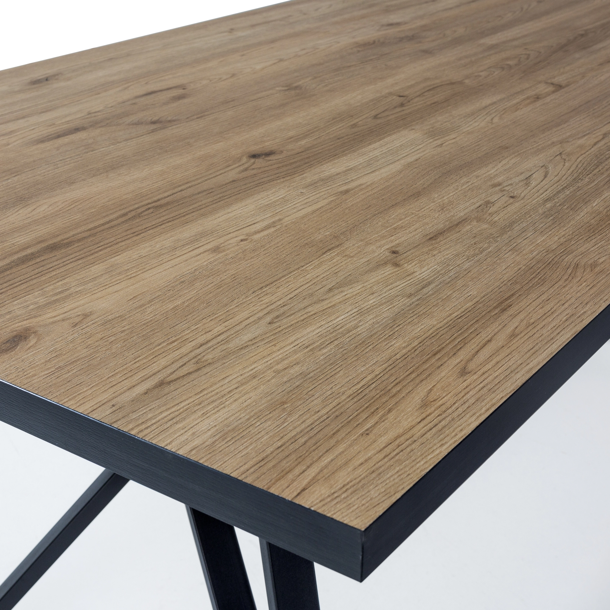 Lo que hace única a la serie Myla es su canto Bocamina. Mientras que el tablero presenta un acabado en Roble Natural con un veteado suave y luminoso, los laterales (el grosor del tablero) están acabados en un tono oscuro antracita o negro (Bocamina). Este detalle simula el corte profundo de la madera o un enmarcado industrial que define la silueta de la mesa, dándole un aspecto robusto y sofisticado.