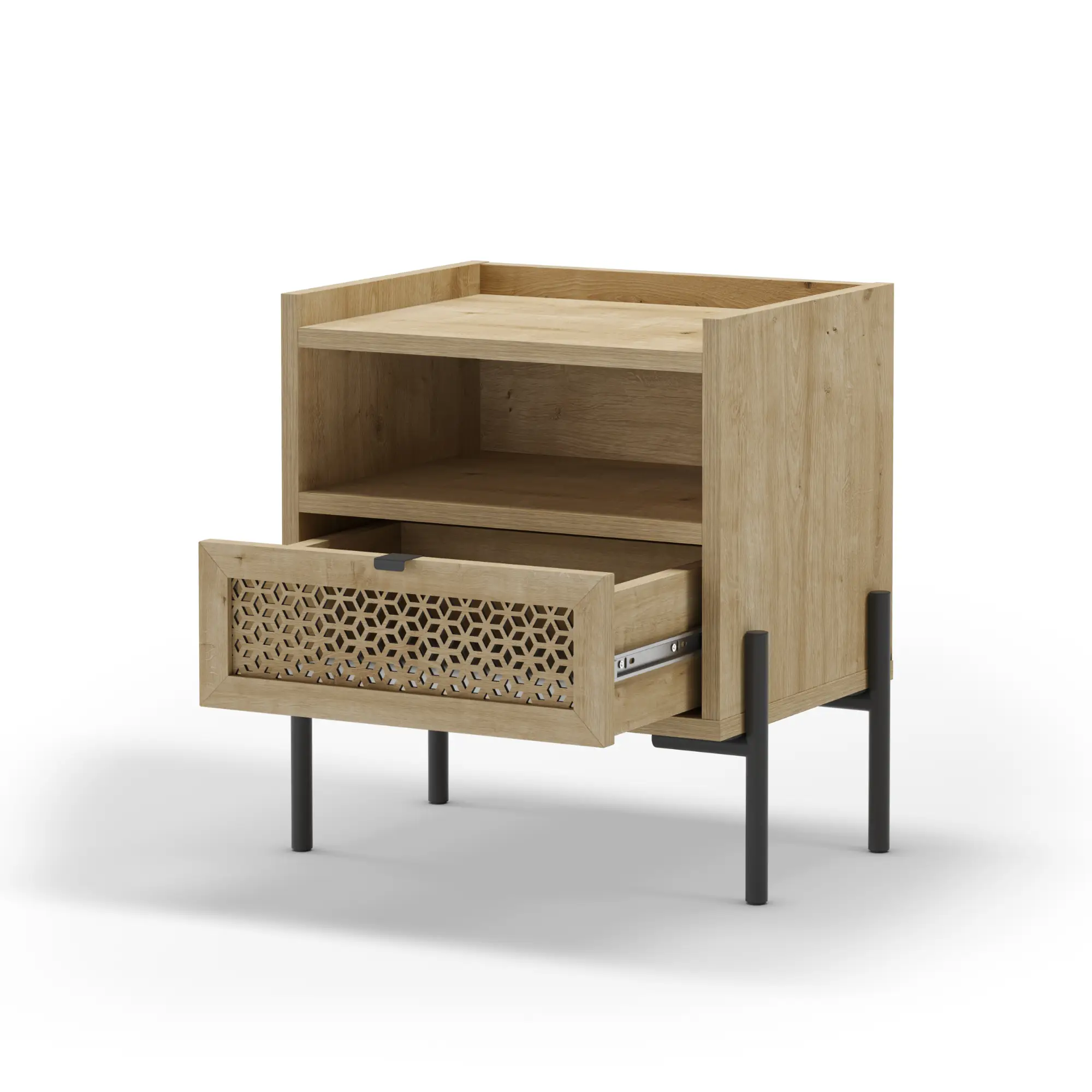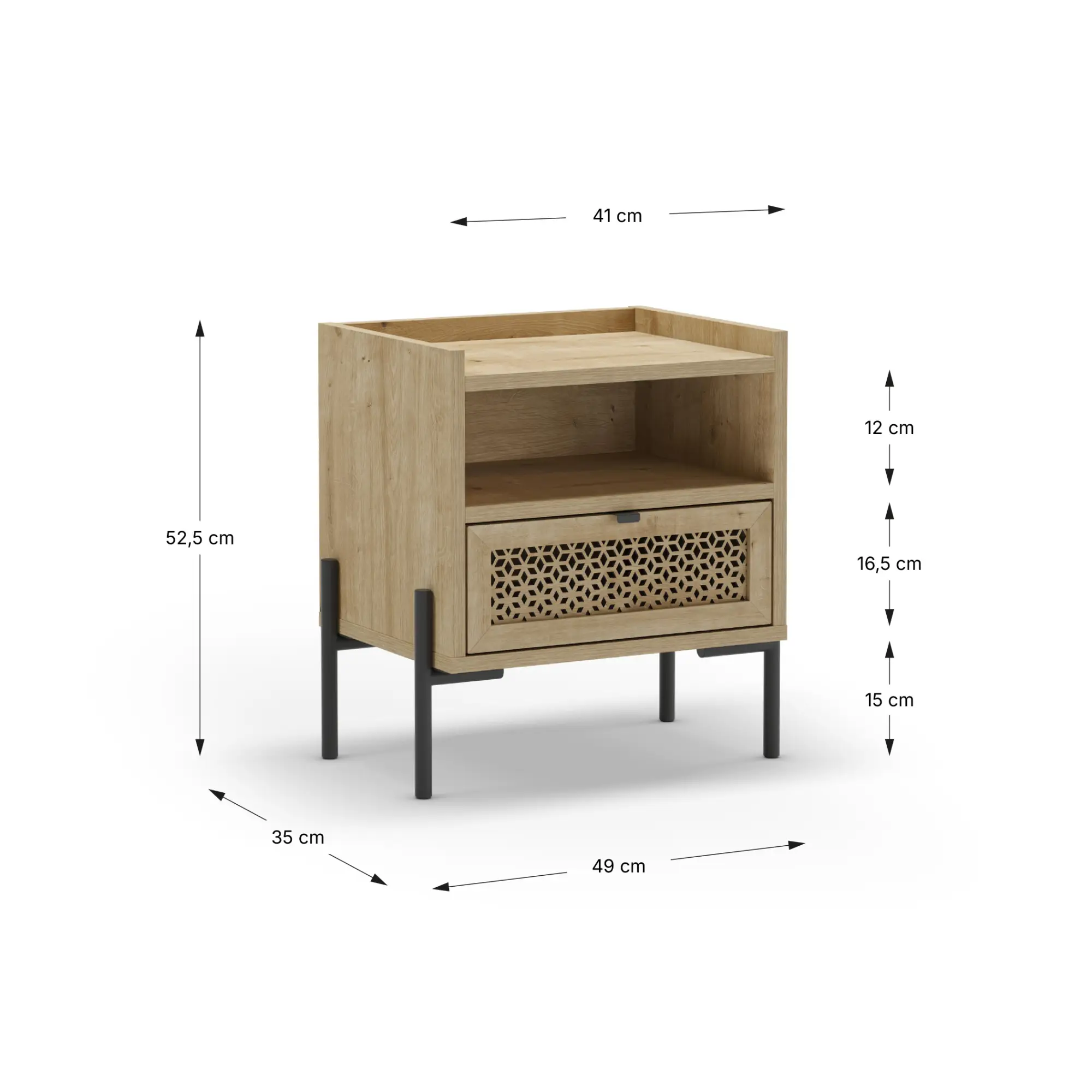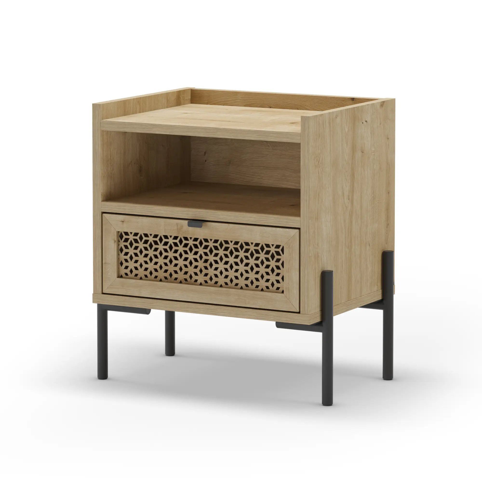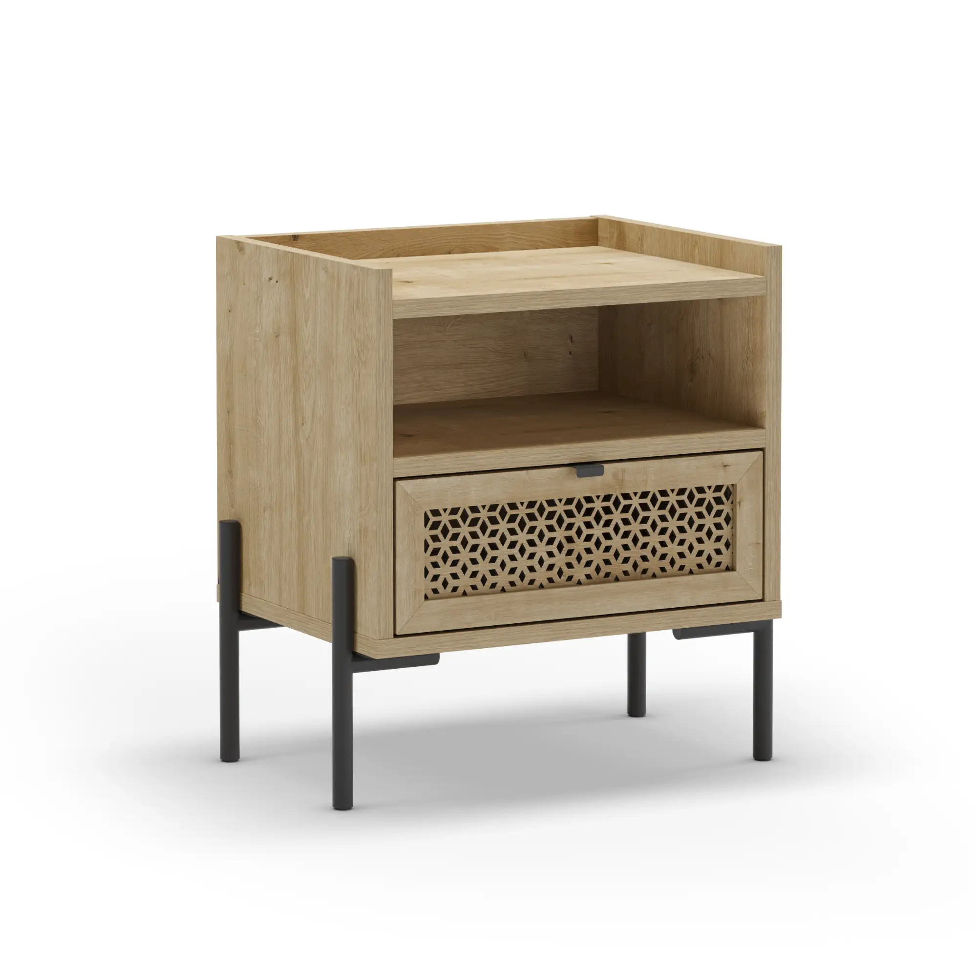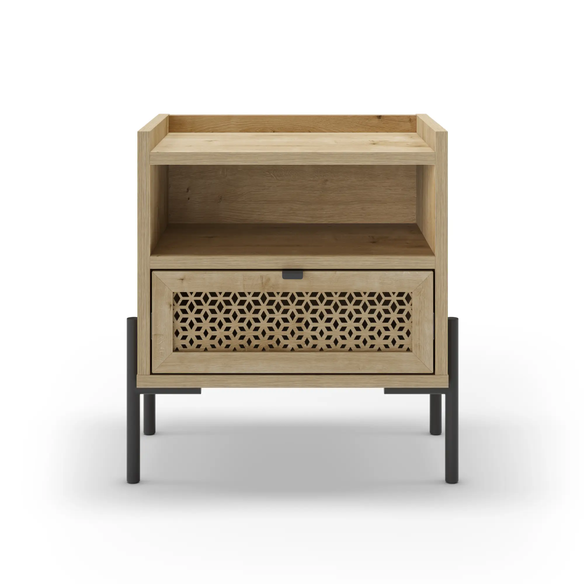 La Mesita Inca fusiona calidez y diseño industrial en una pieza compacta y funcional. Gracias a su combinación de cajón y hueco abierto, es la solución perfecta para mantener tu dormitorio organizado con estilo.