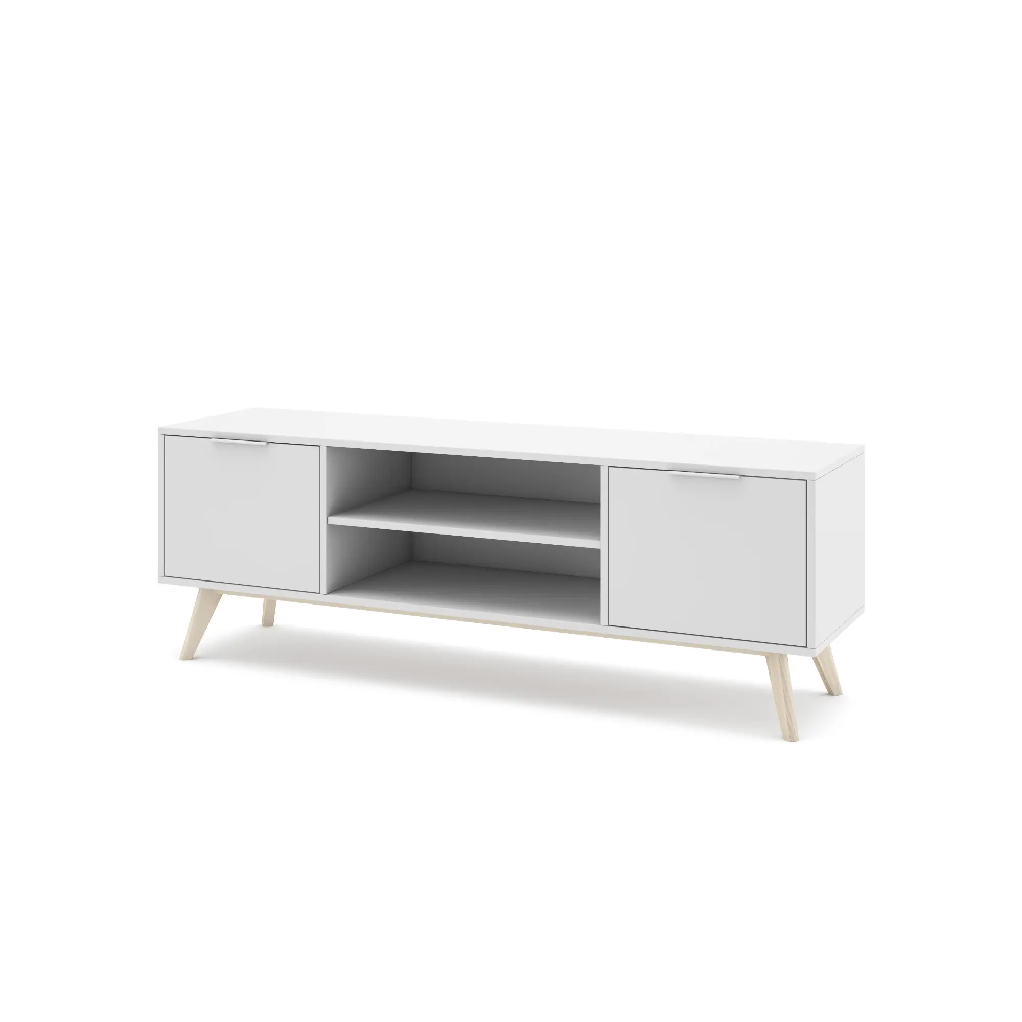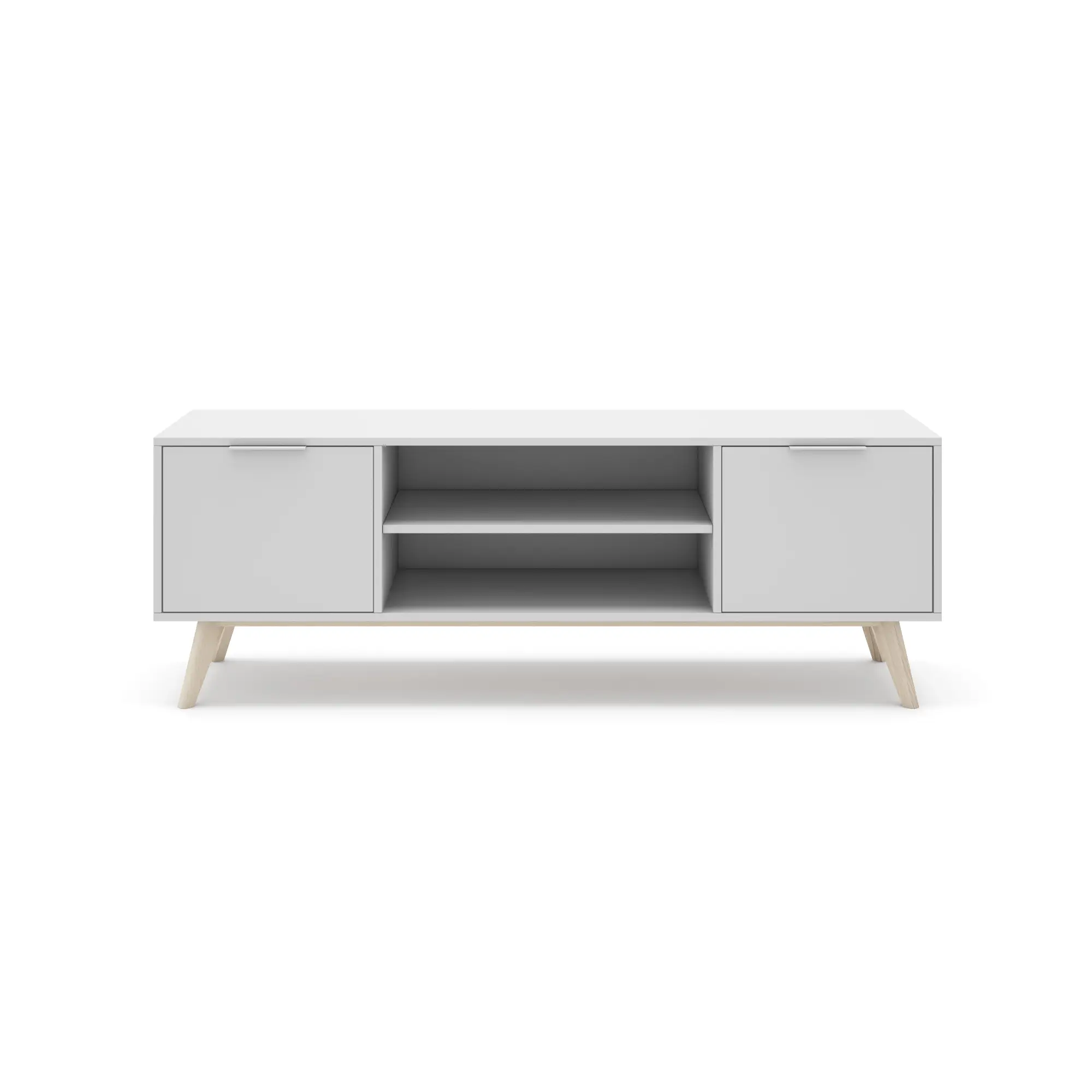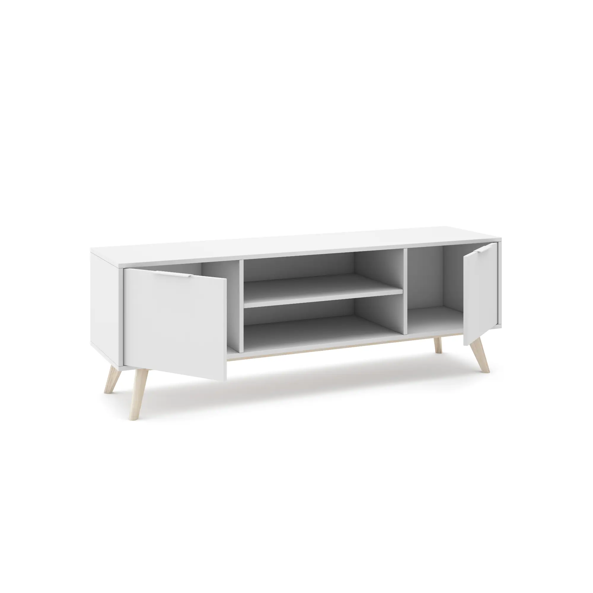 Simplifica y embellece tu salón con el mueble de TV Campus. Fabricado en pino macizo, esta pieza combina la pureza del blanco mate con el acabado cera blanca, que realza la veta natural de la madera con un toque sutil y claro. Su diseño funcional de dos puertas laterales y dos huecos centrales abiertos es la solución perfecta para organizar tus consolas y decodificadores manteniendo el orden visual en espacios de estilo nórdico o mediterráneo.