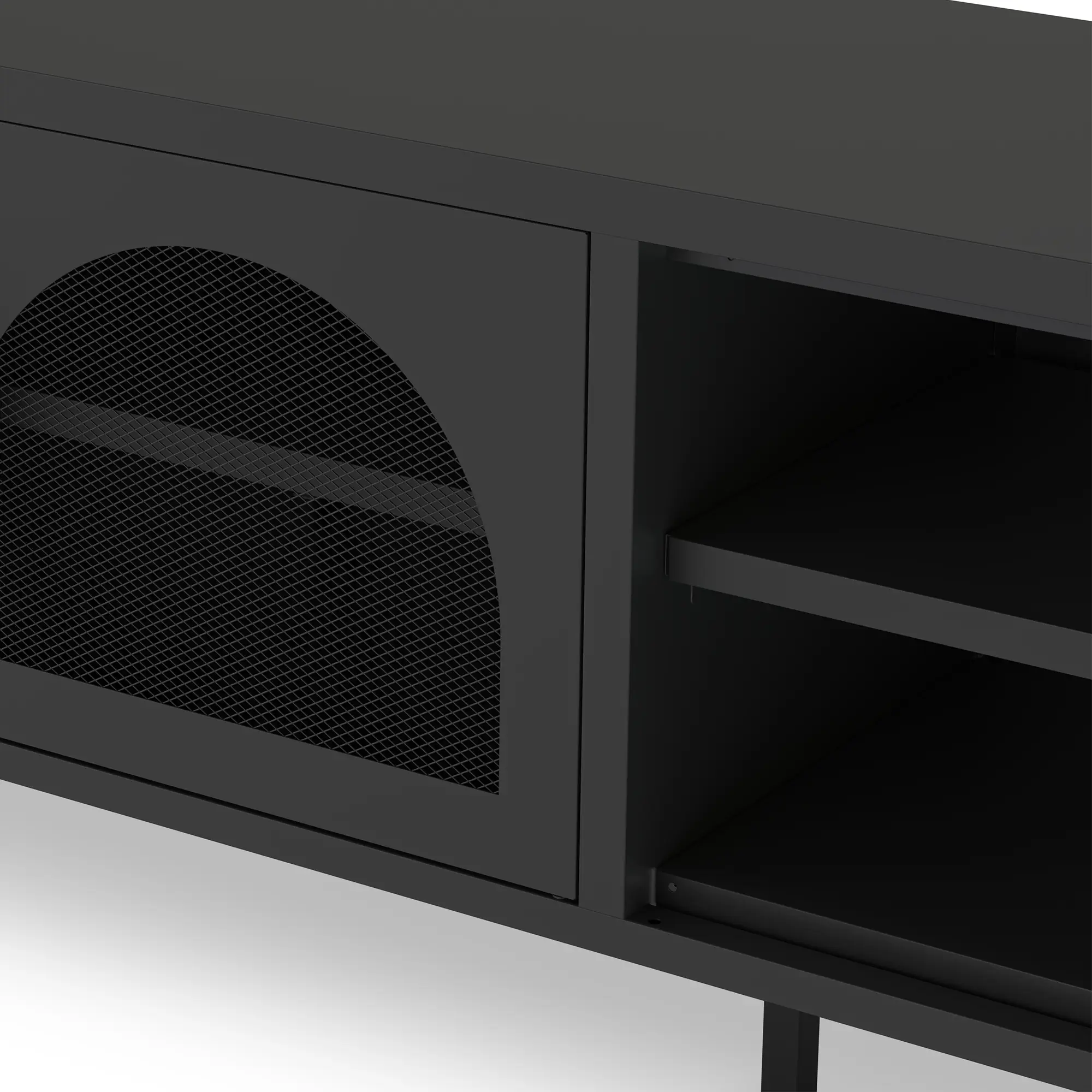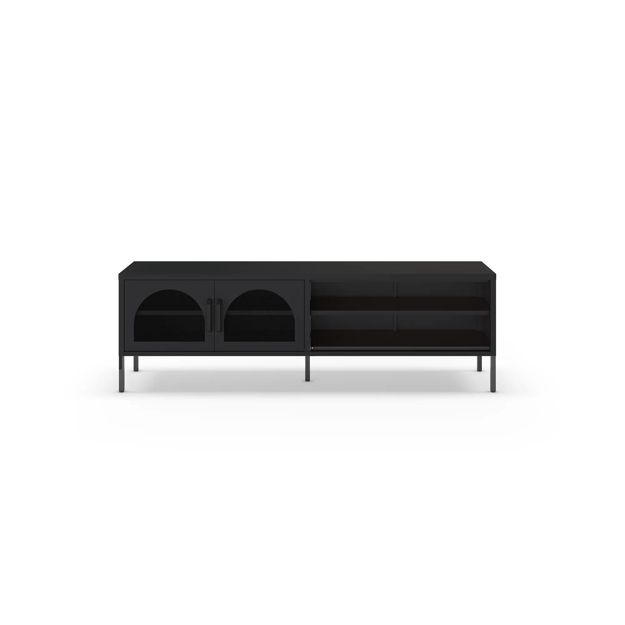 Mueble TV Diora 2P2H es un mueble de TV moderno y elegante de 160 cm. Destaca por su color negro mate y su diseño que combina un compartimento cerrado con puertas y dos huecos abiertos para dispositivos. Es una solución funcional con un estilo sobrio y sofisticado.