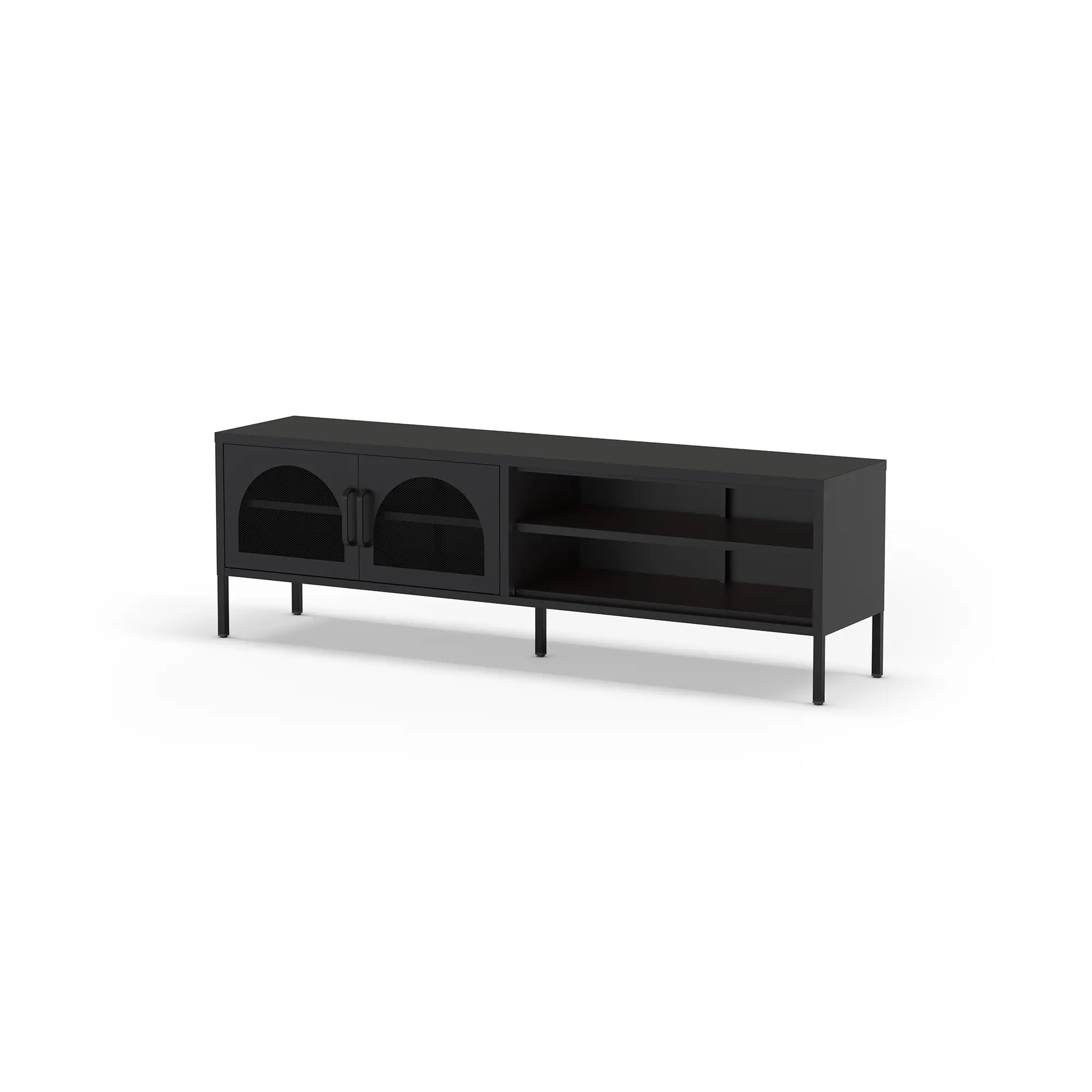 El Mueble TV Diora es altamente funcional, ofreciendo una amplia superficie para televisores de gran pulgada. La combinación de puertas para guardar y huecos abiertos para dispositivos lo convierte en una completa central de entretenimiento.