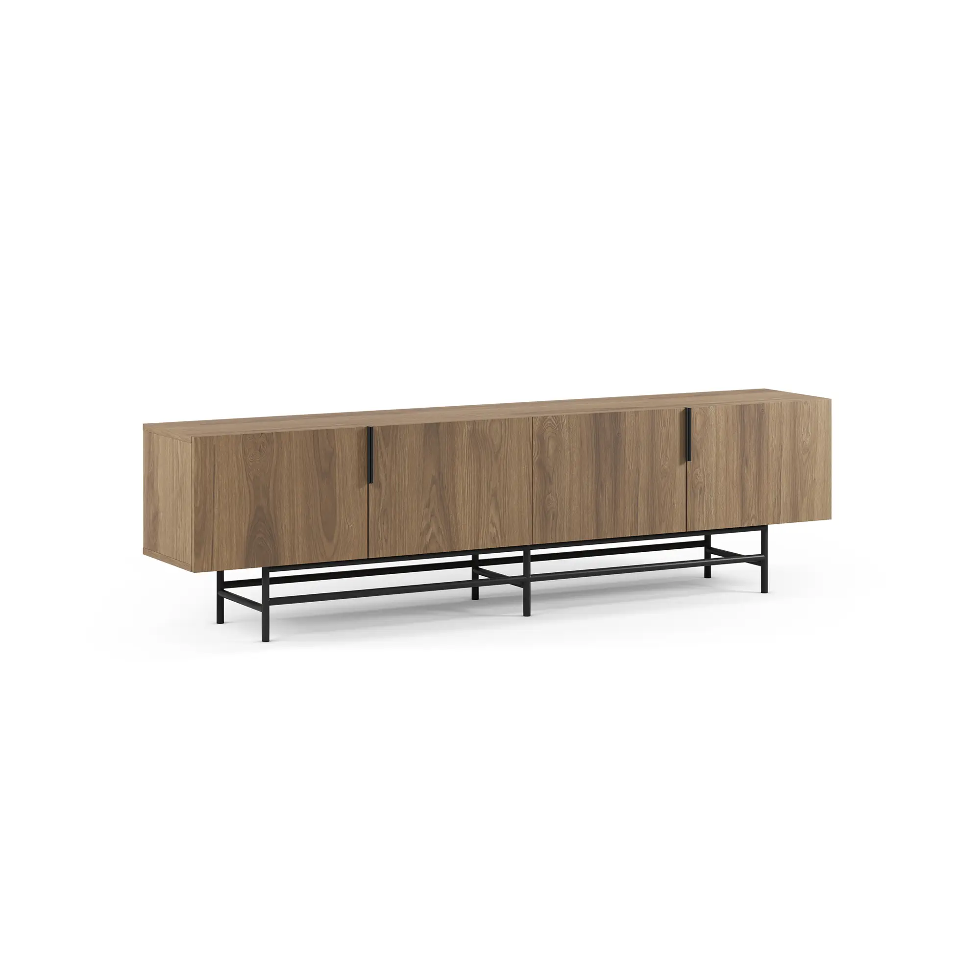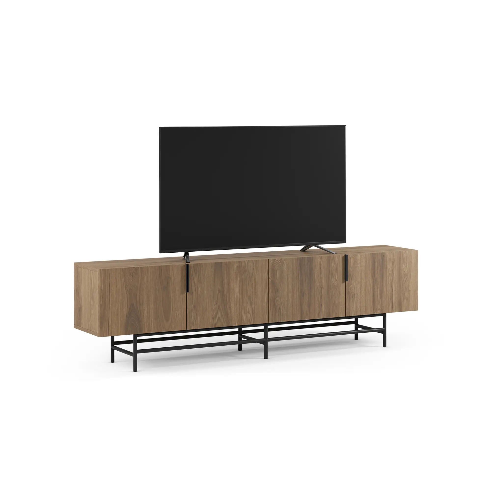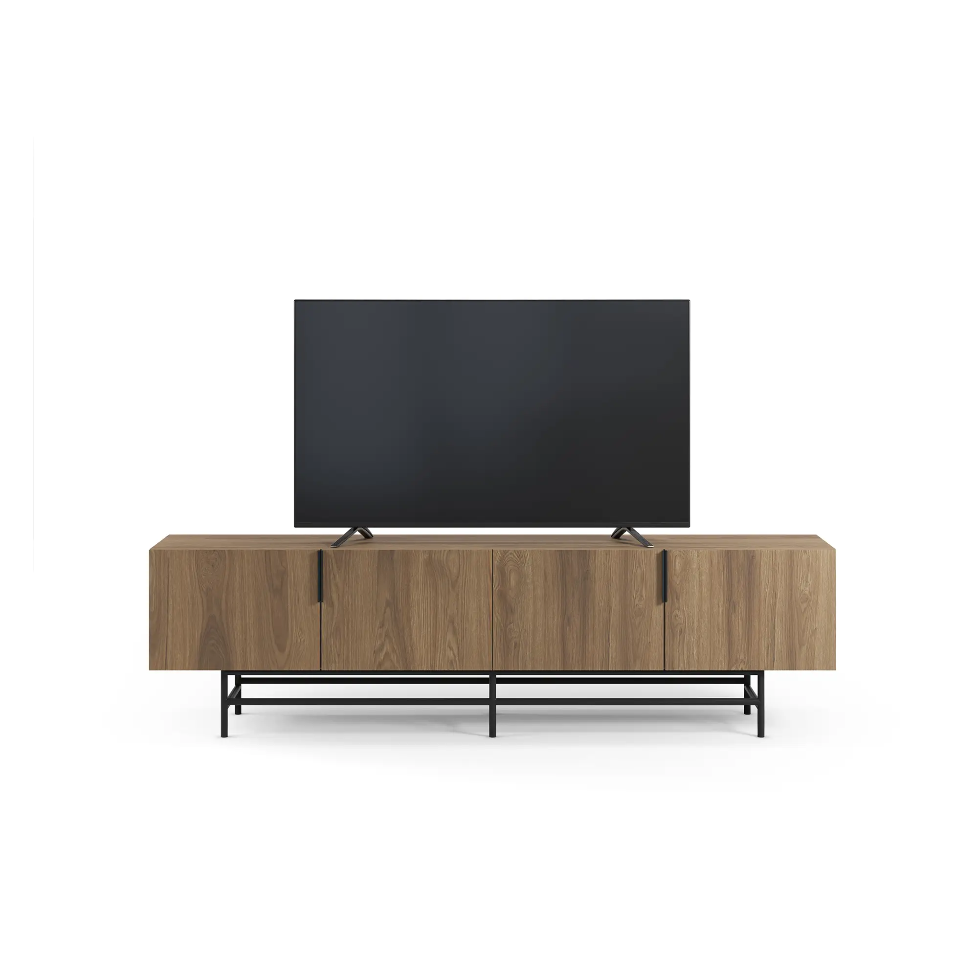 Mueble TV Eldia 4P es un mueble de TV largo de diseño minimalista. Presenta un acabado de madera roble, cuatro puertas con tiradores verticales en negro, y una base de metal geométrica negra. Es una solución funcional y de gran capacidad, optimizada para equipos multimedia.