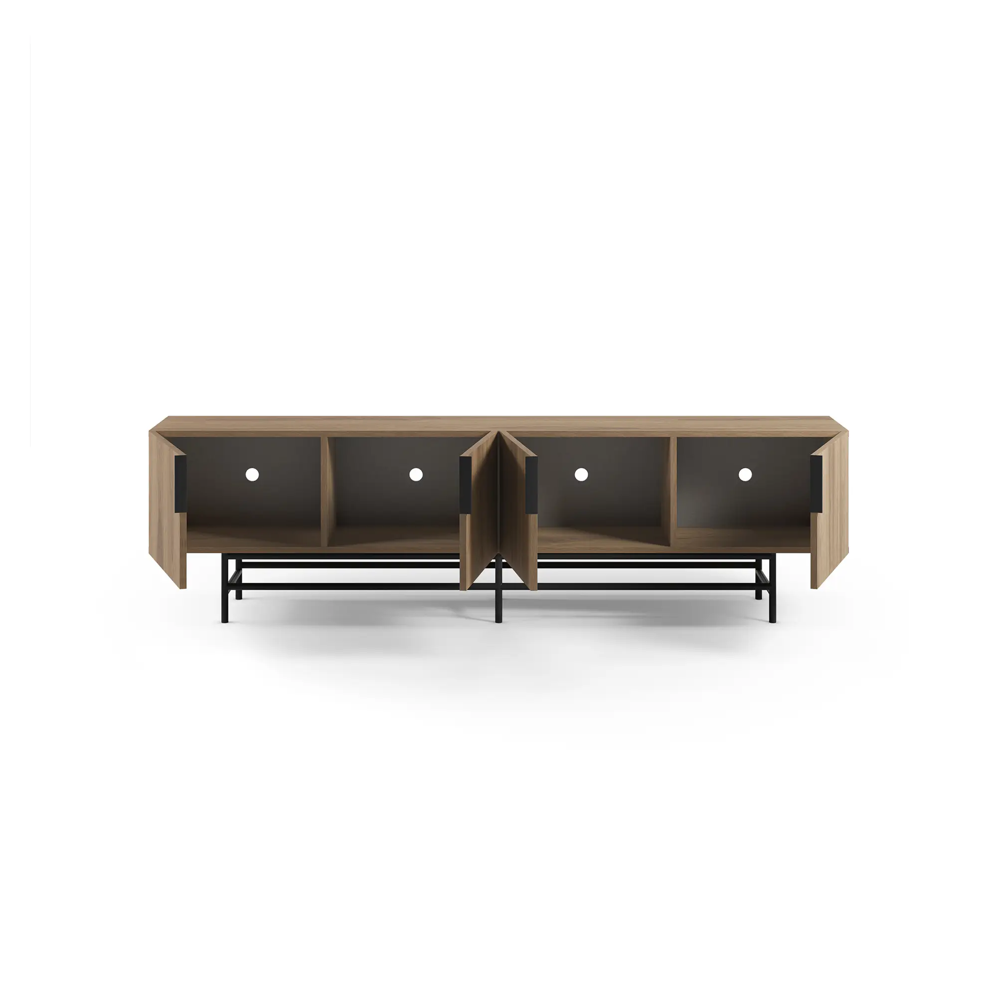Base Geométrica de Metal: El mueble se apoya sobre una base metálica con un diseño de estructura geométrica en color negro. Esta base eleva el mueble, dándole un aire ligero y moderno.