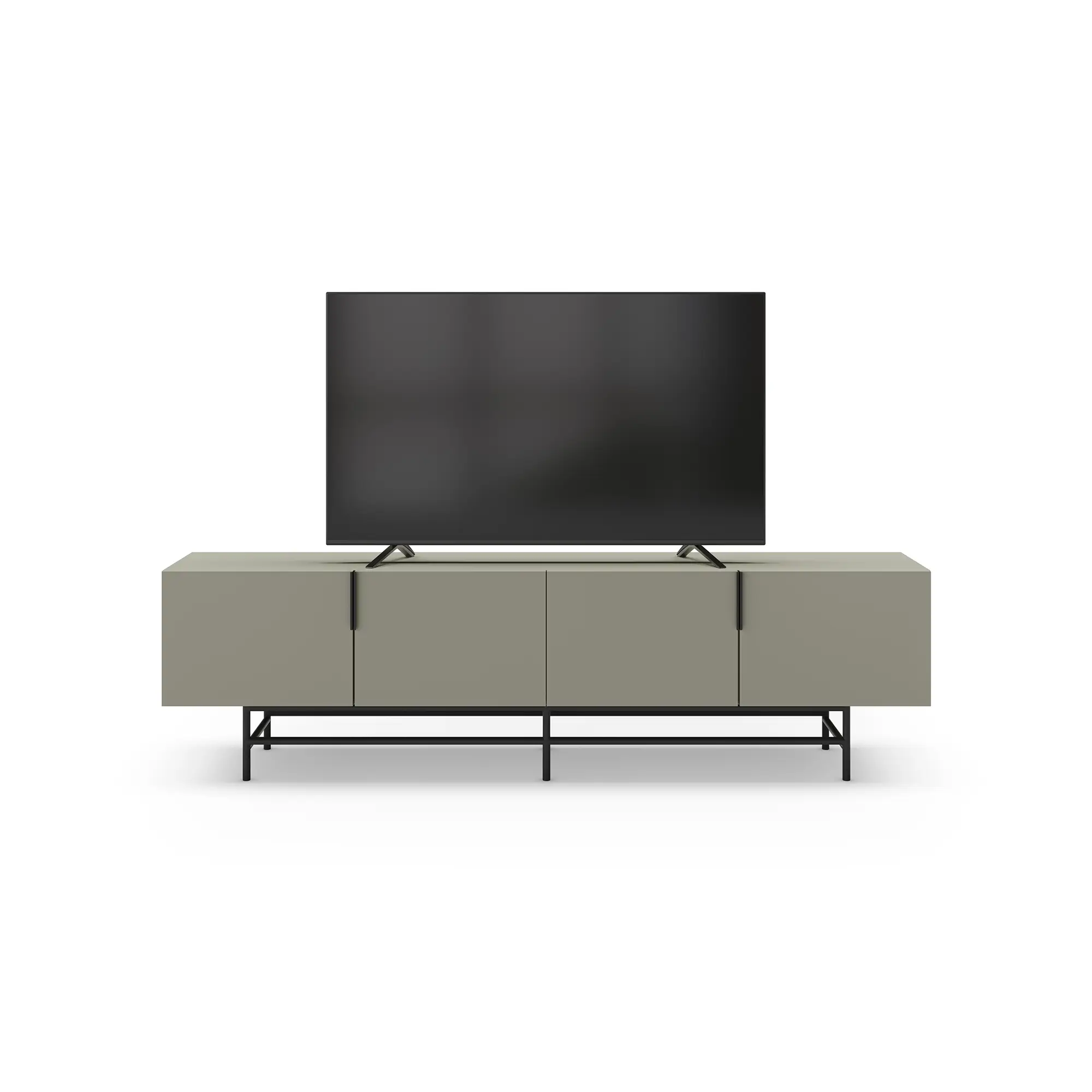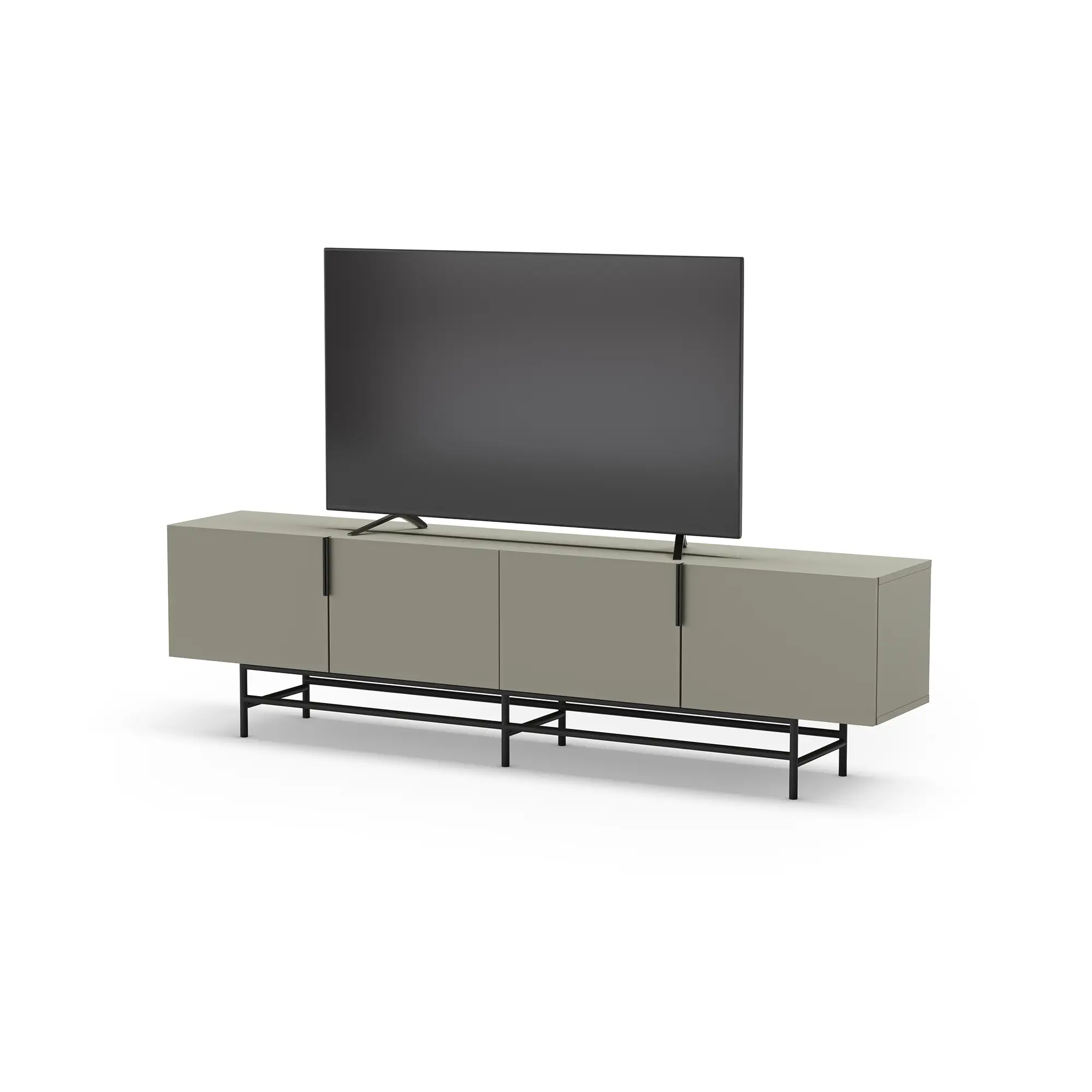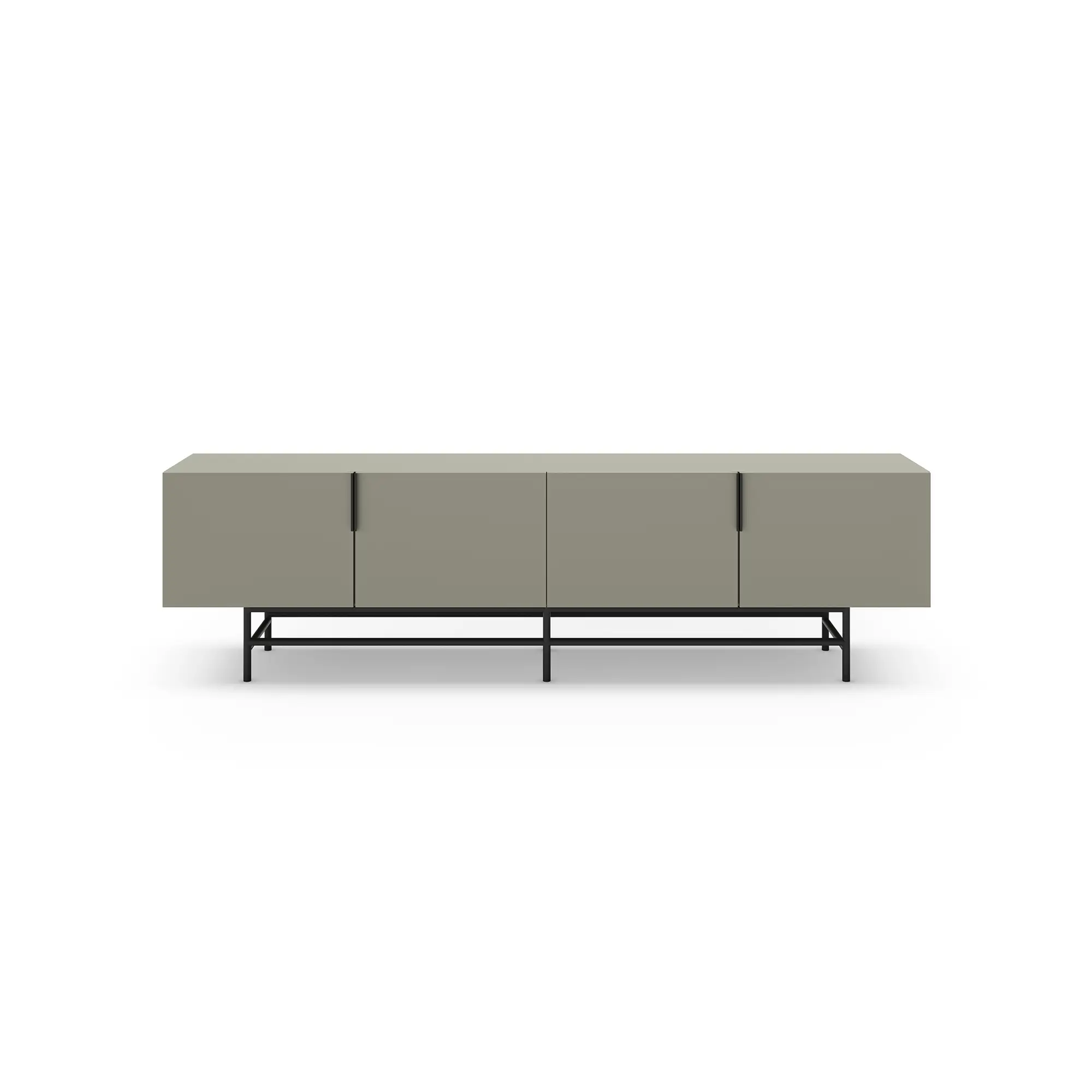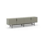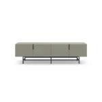 Mueble TV Eldia 4P es un mueble de TV largo de diseño minimalista. Presenta un color verde grisáceo, cuatro puertas con tiradores verticales, y una base de metal geométrica en negro. Es una solución de gran capacidad, optimizada para equipos multimedia y de estilo contemporáneo.