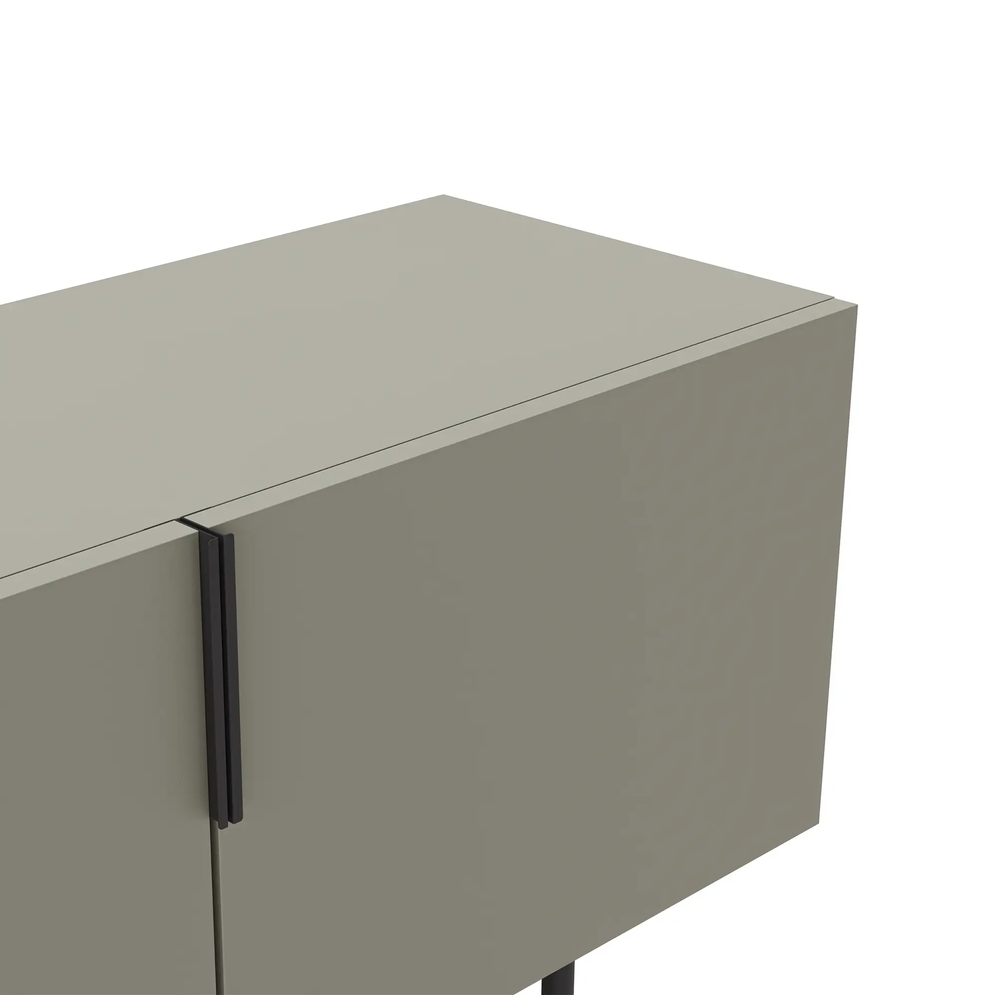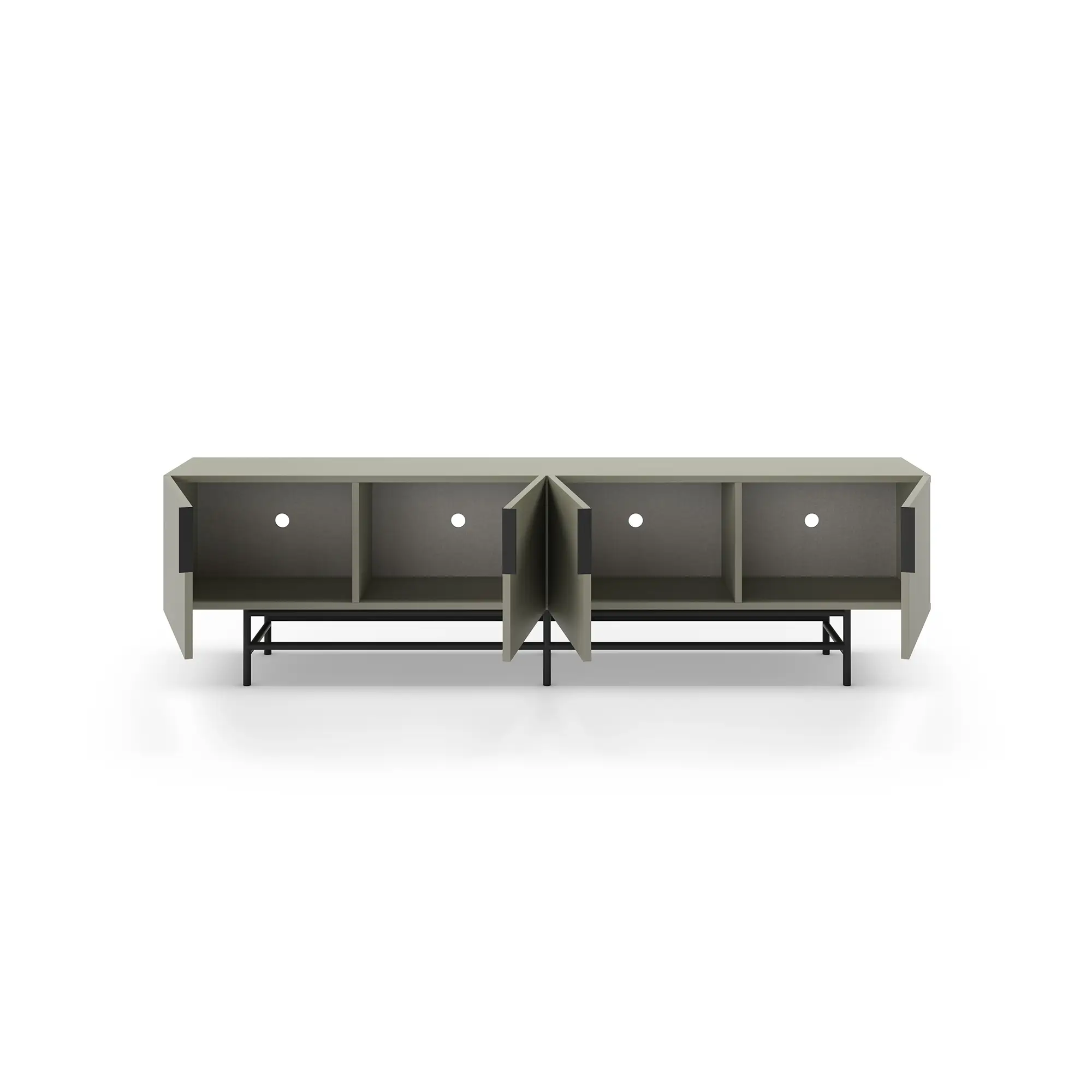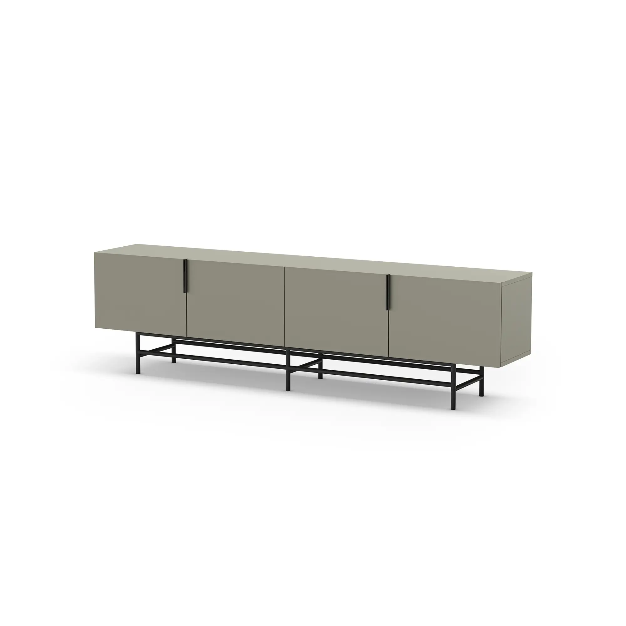 Mueble TV Eldia 4P es un mueble de TV largo de diseño minimalista. Presenta un color verde grisáceo, cuatro puertas con tiradores verticales, y una base de metal geométrica en negro. Es una solución de gran capacidad, optimizada para equipos multimedia y de estilo contemporáneo.