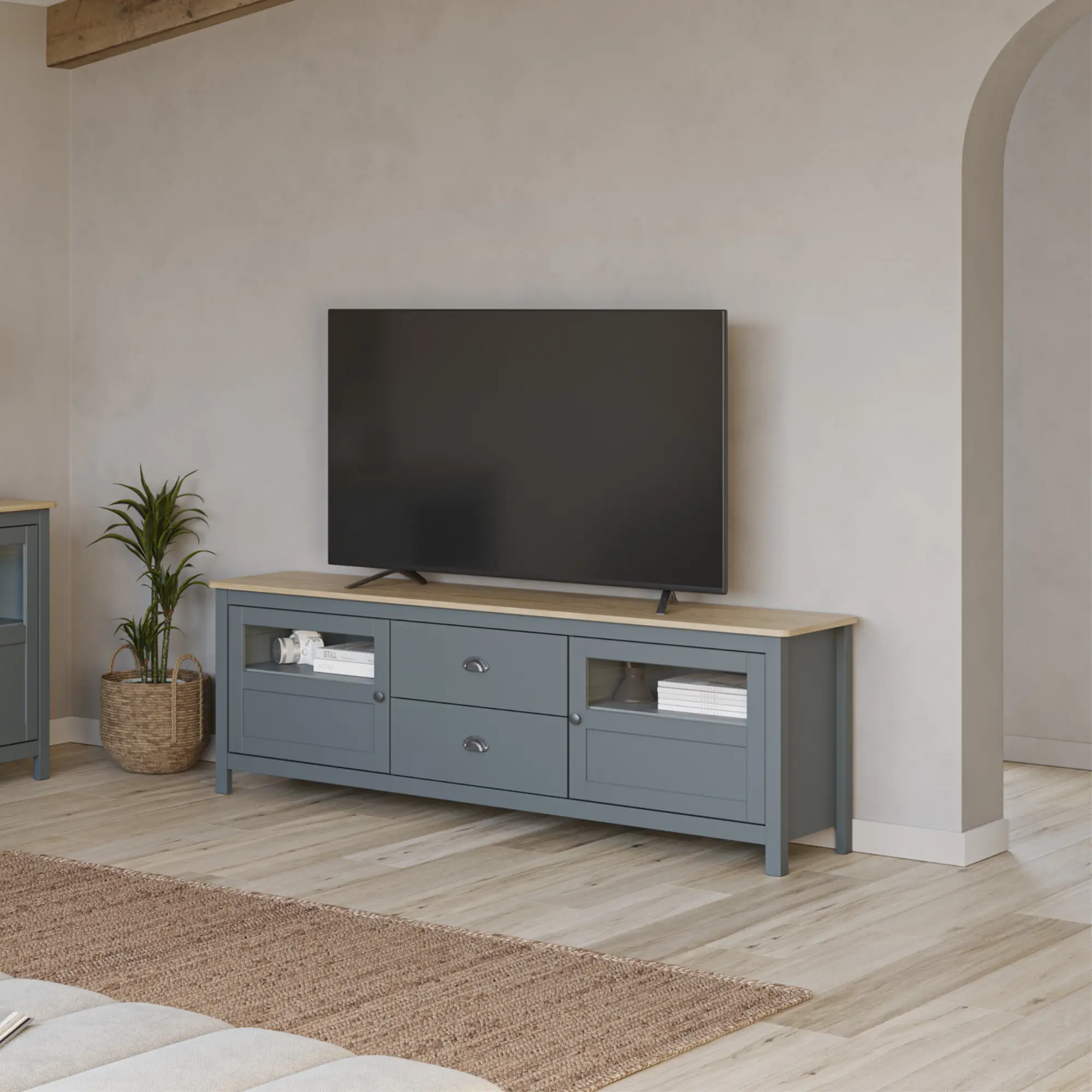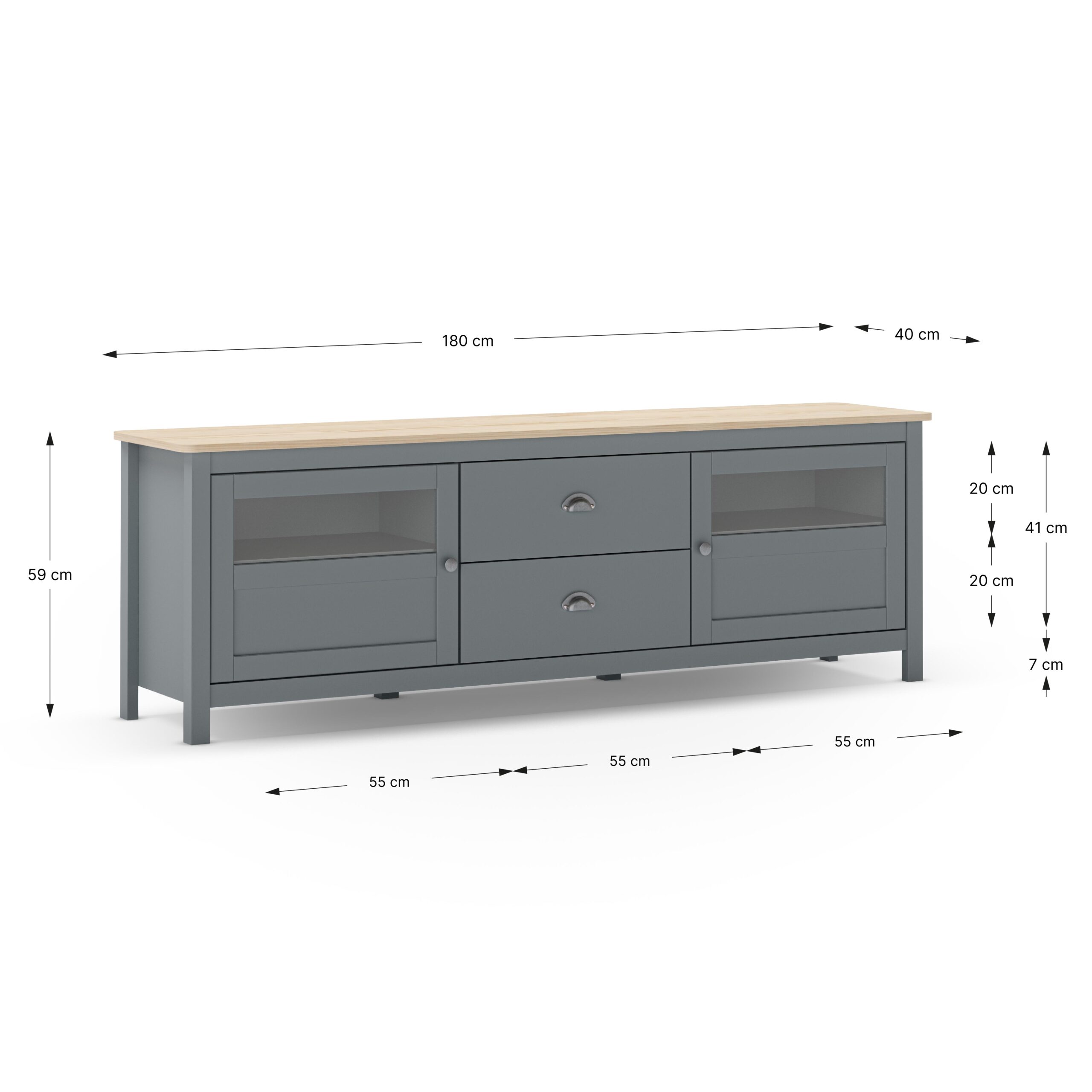 Superficie Extra Ancha de 180 cm: Diseñada para soportar pantallas de gran formato y sistemas de sonido complejos, manteniendo una proporción estética armoniosa y equilibrada en la pared principal del salón.