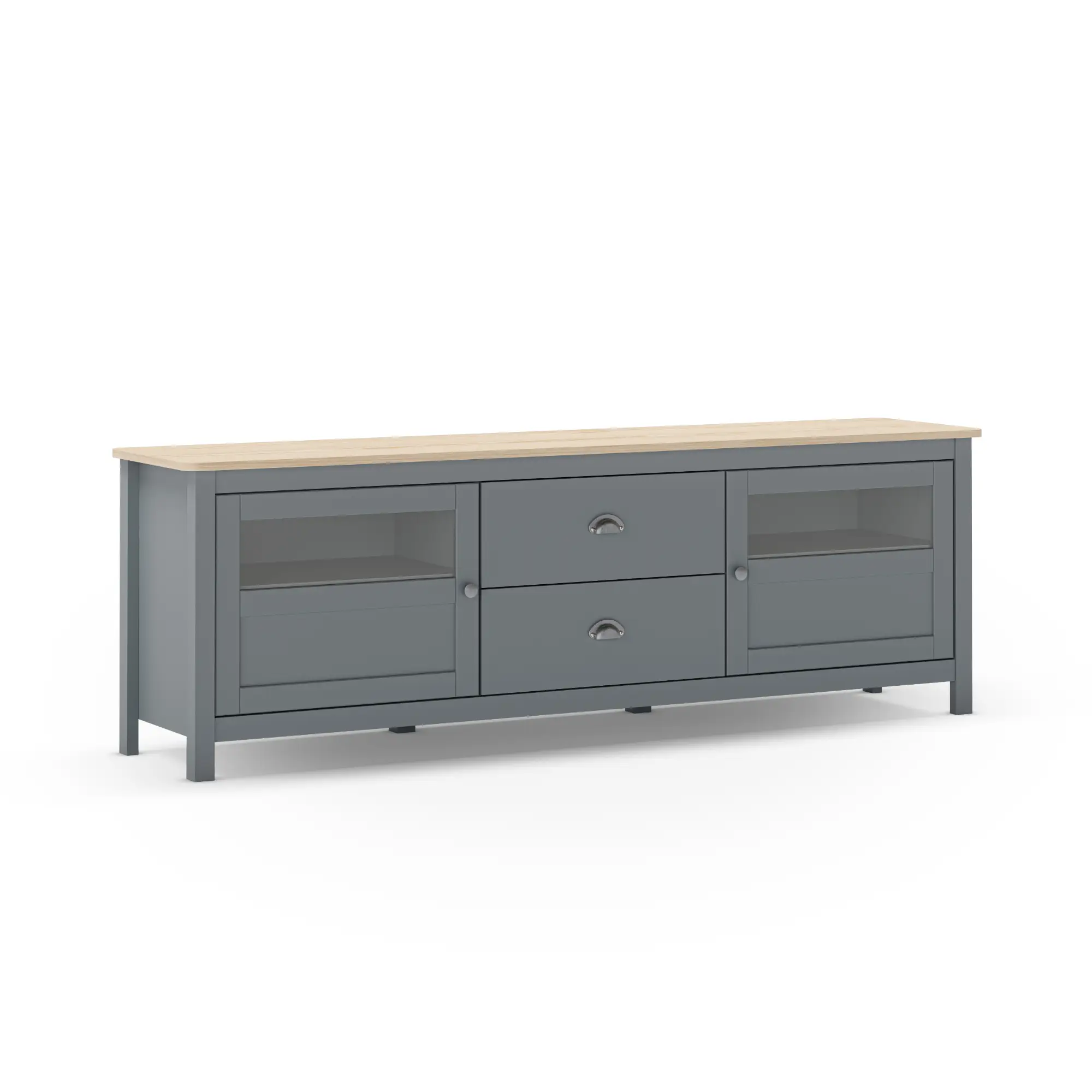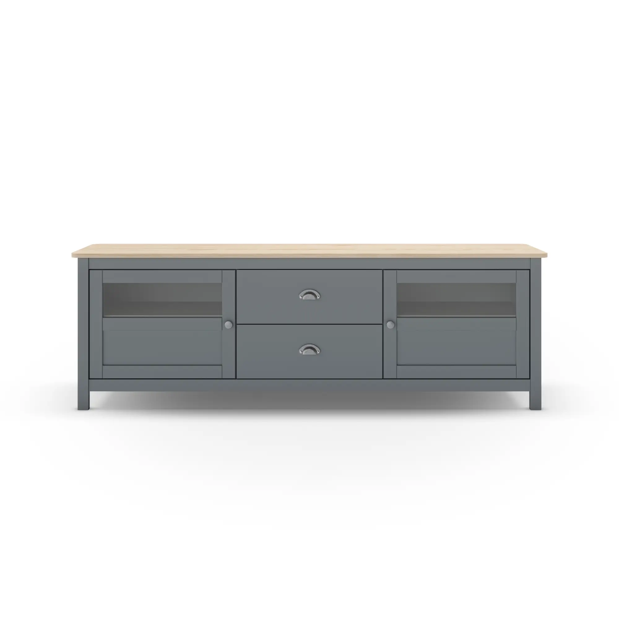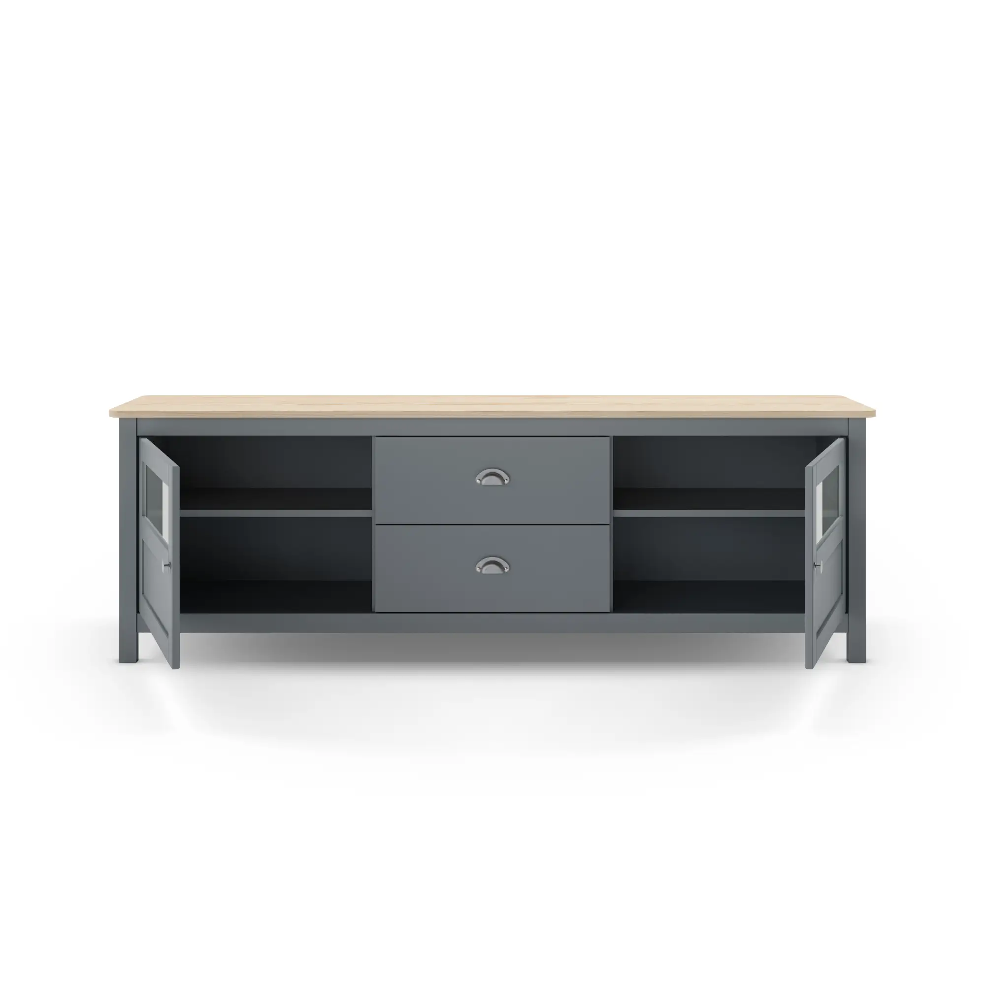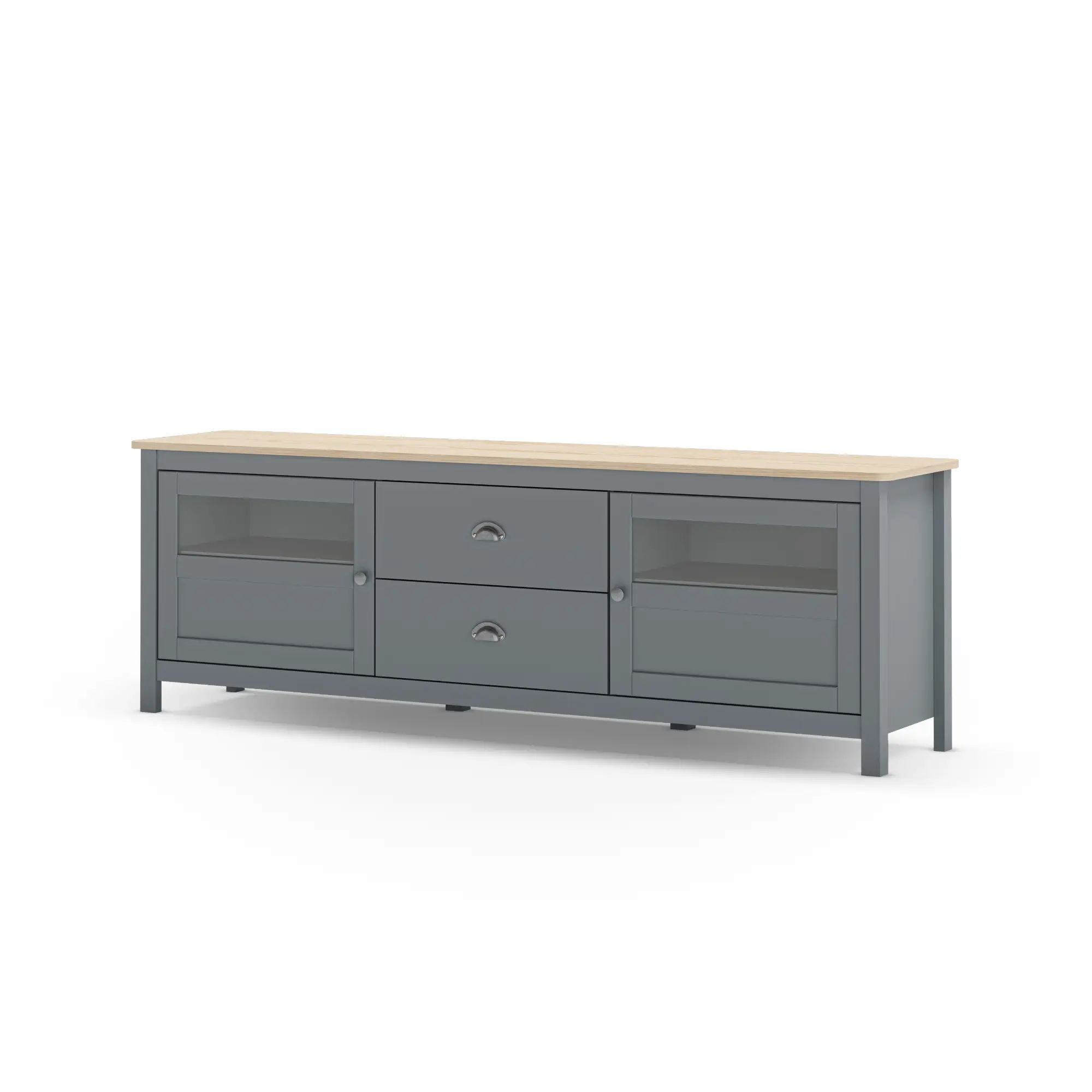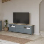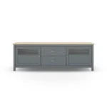 Almacenaje Mixto Central y Lateral: Cuenta con 2 cajones centrales de extracción suave, ideales para organizar mandos y accesorios multimedia, flanqueados por 2 amplias puertas laterales que ocultan compartimentos de gran volumen para consolas, vajilla o documentos.