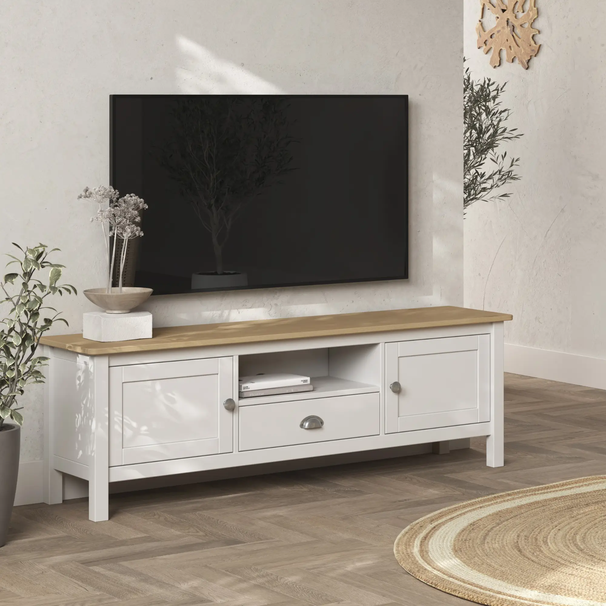 El Mueble de TV Misti en Blanco y Roble es la solución perfecta para quienes buscan un salón luminoso, moderno y bien organizado. Su diseño inteligente combina dos armarios laterales, un cajón de extracción suave y un hueco abierto central, ideal para alojar dispositivos multimedia. La fusión del blanco puro con el detalle en roble natural aporta una calidez orgánica que amplía visualmente el espacio, creando un ambiente de descanso sereno y sofisticado.