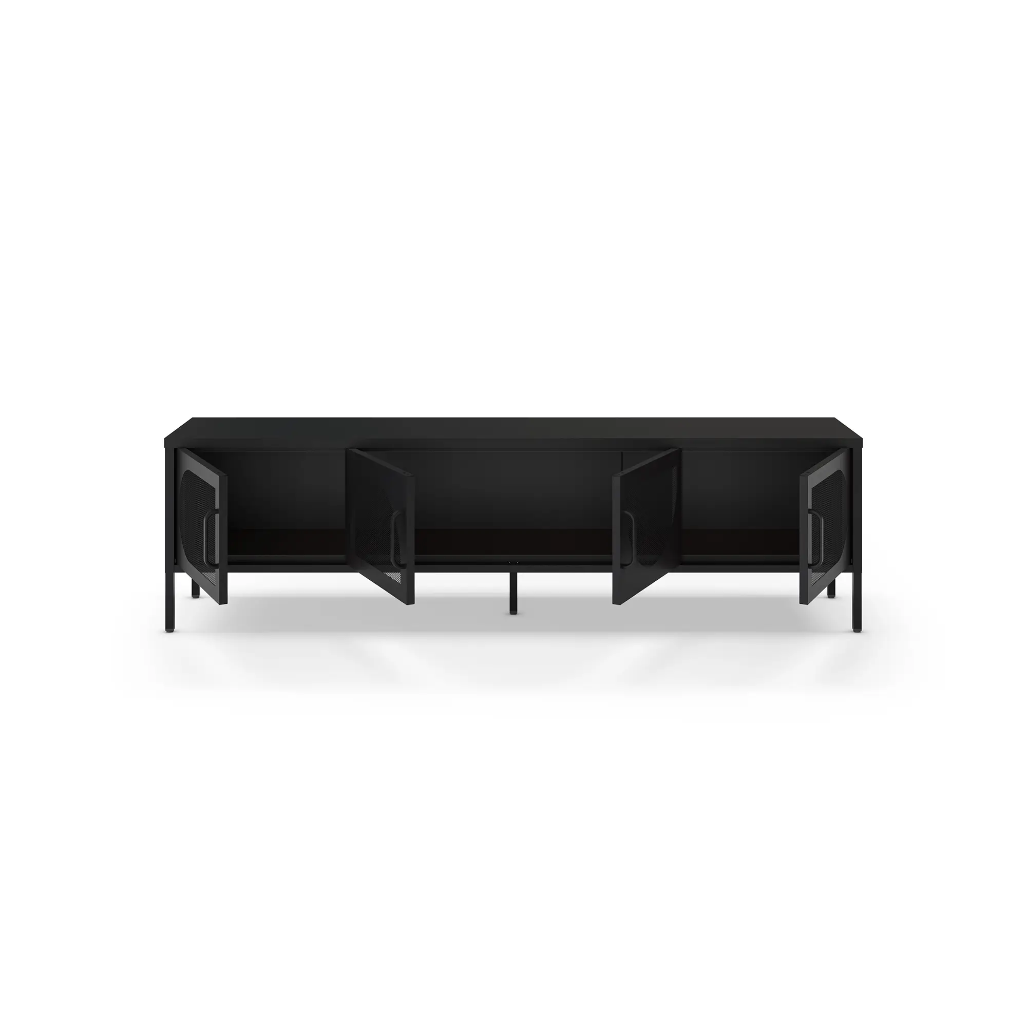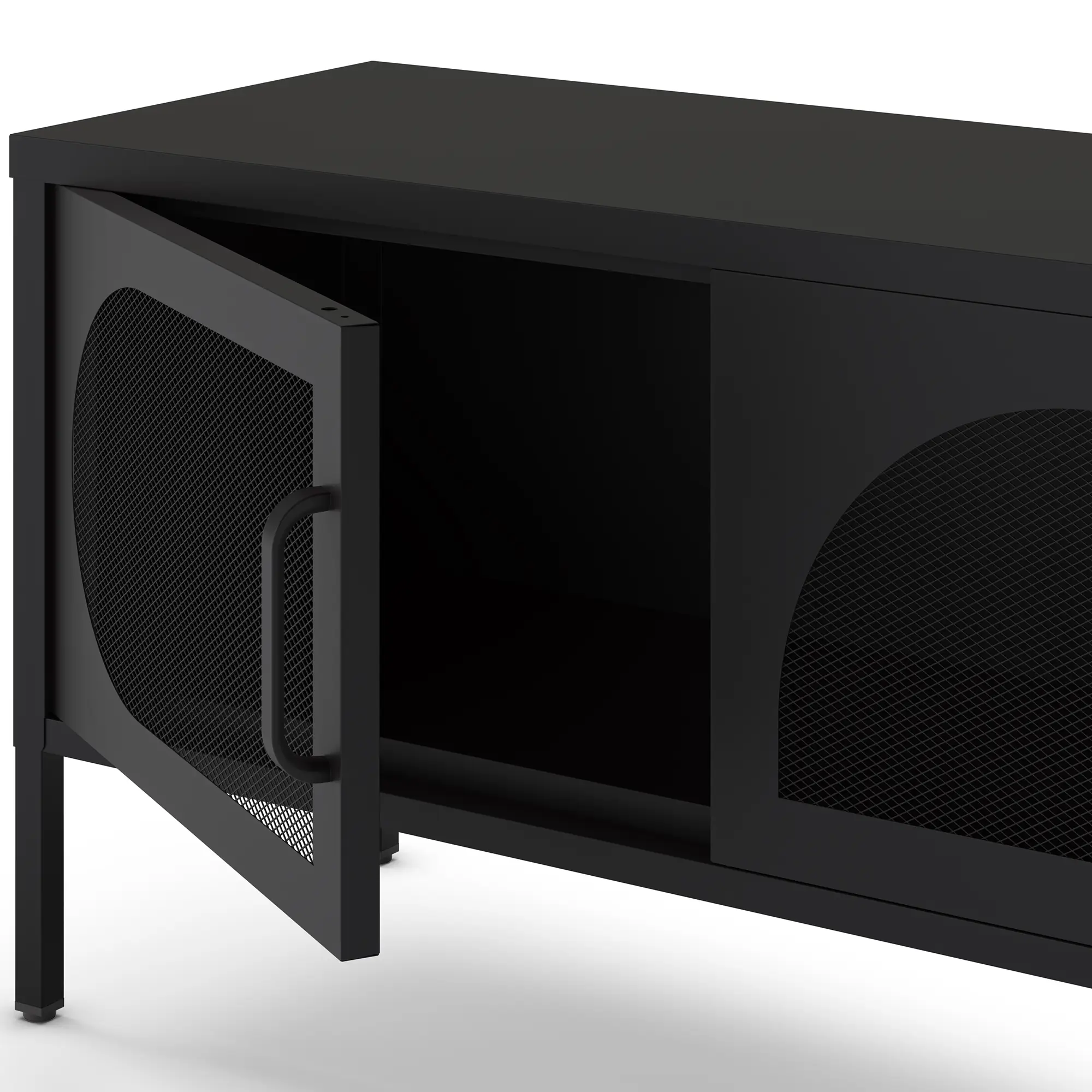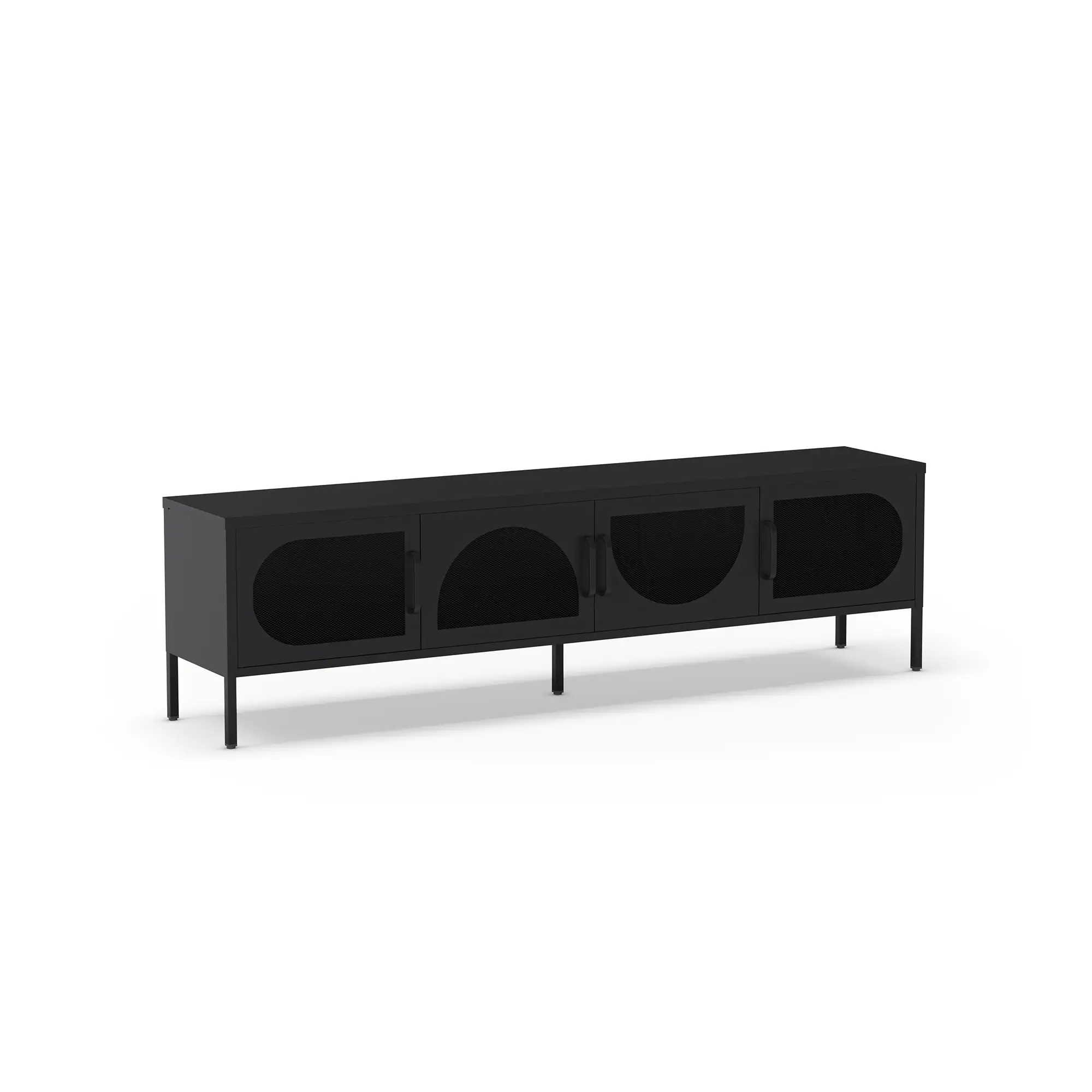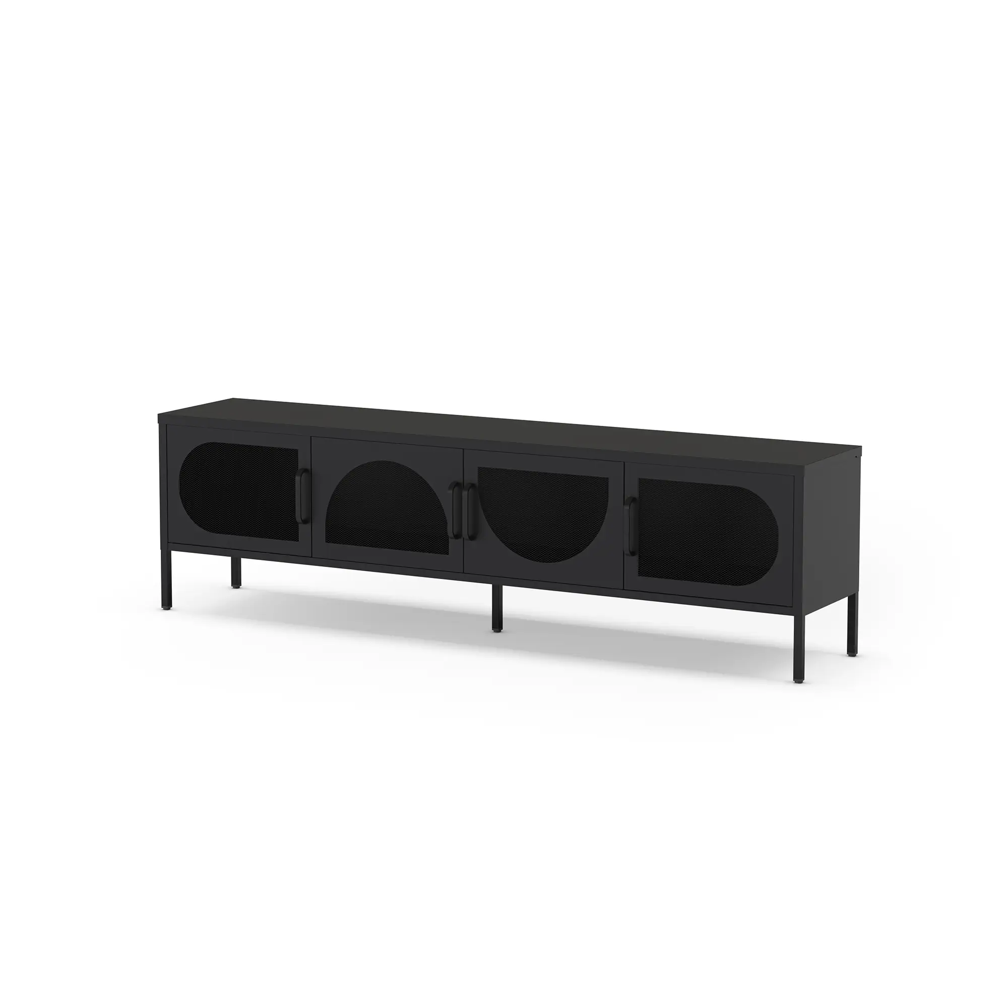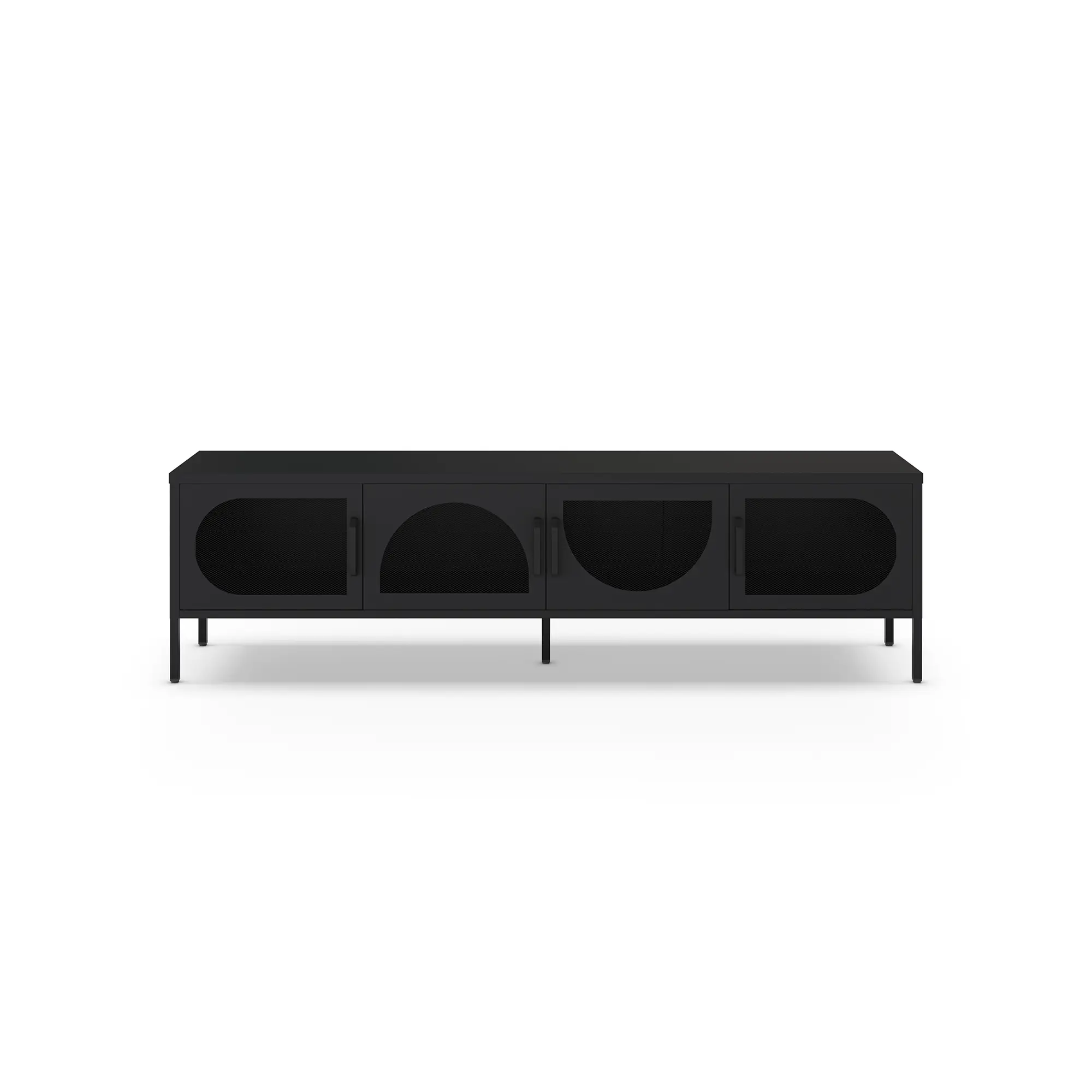 El Mueble TV Tayra 4P 180cm de color negro es un mueble de televisión, caracterizado por su color negro sobrio y su diseño moderno con puertas curvas de rejilla metálica.