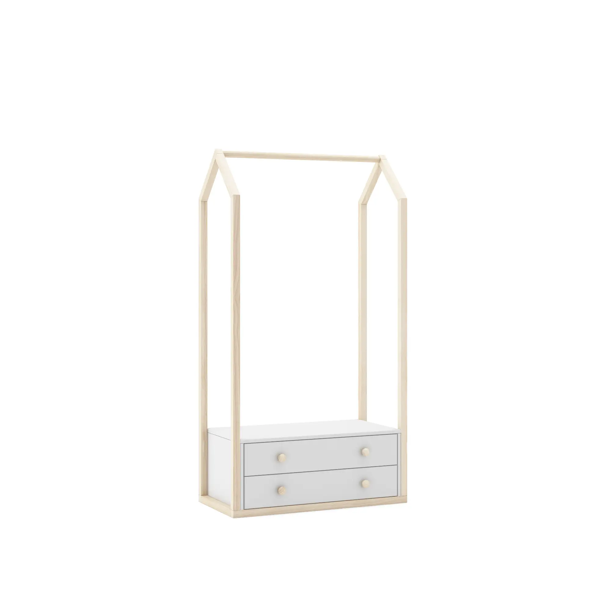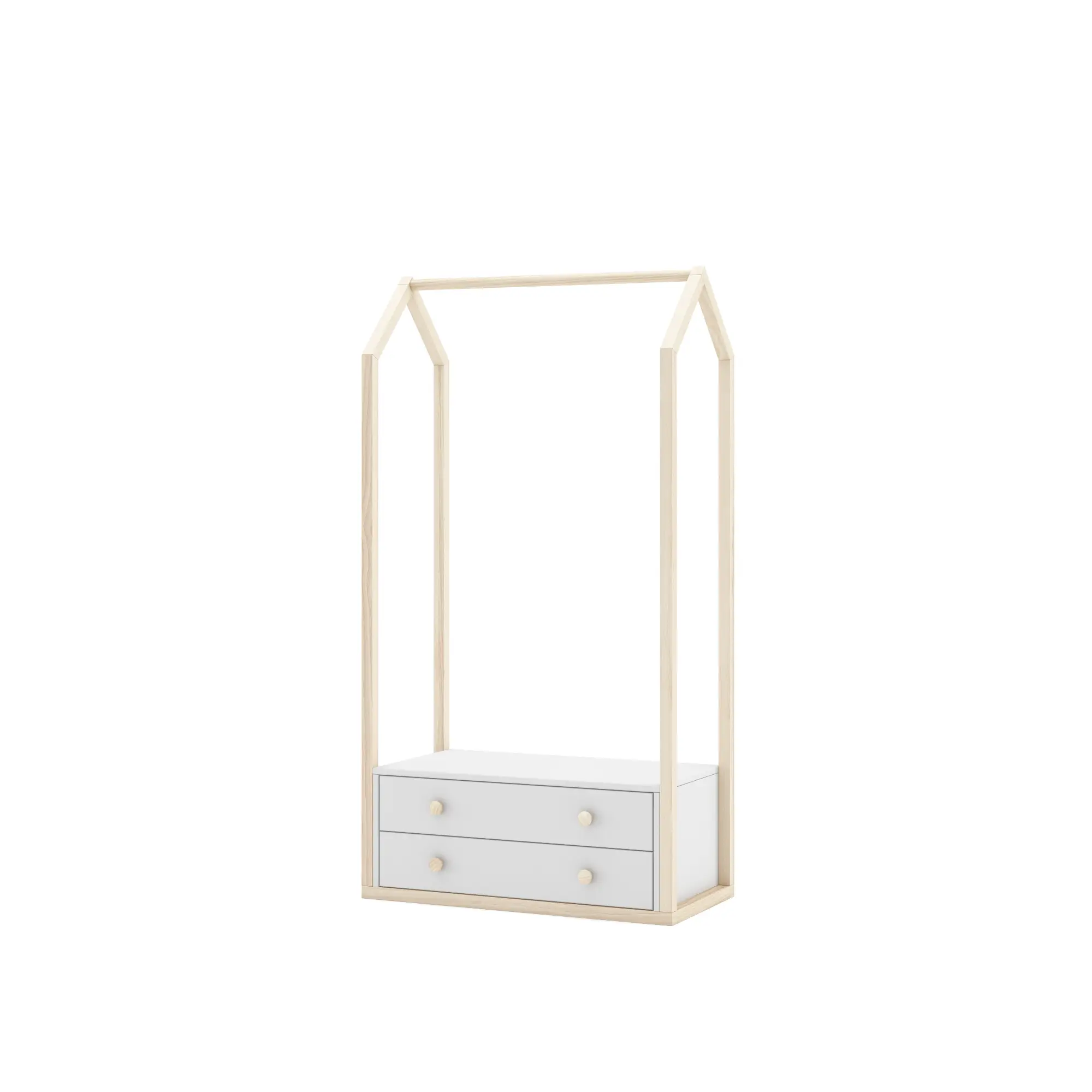 Perchero en blanco y cera blanca con barra para colgar y dos cajones inferiores diseñado para organizar ropa y mantener el espacio ordenado