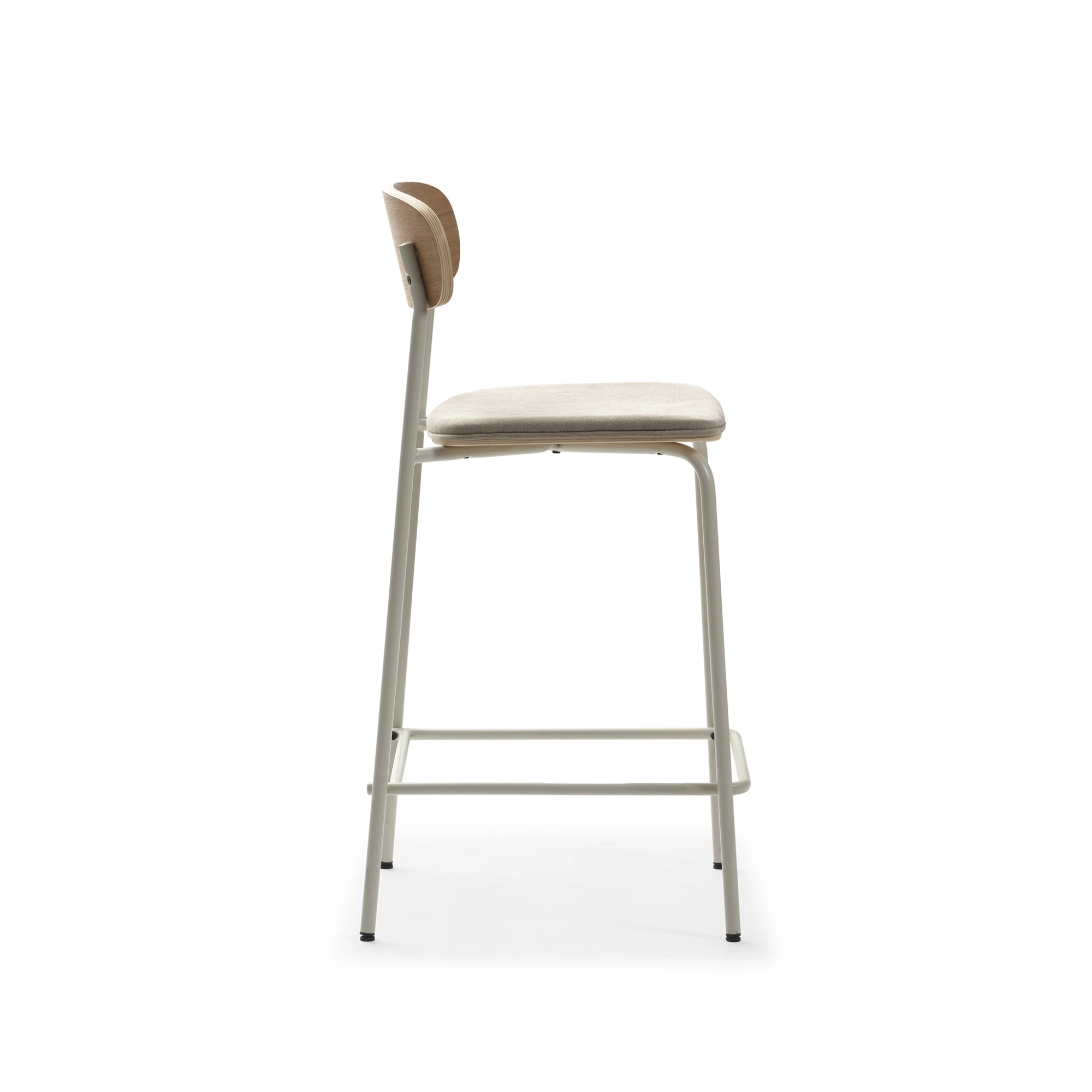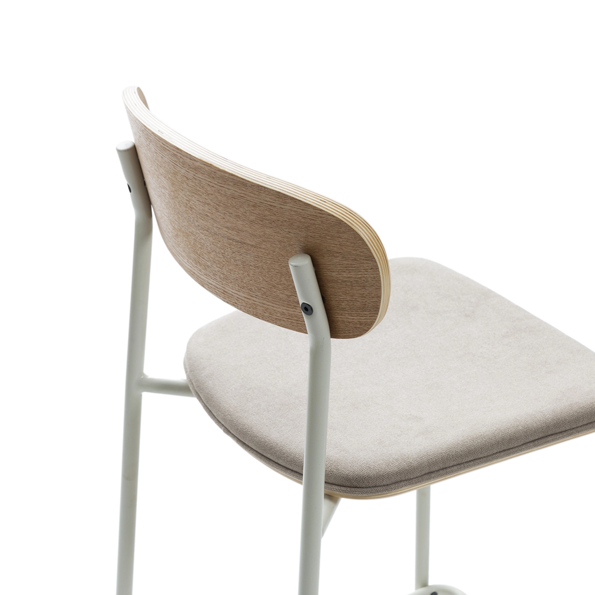 Patas Metálicas Blancas: A diferencia de las opciones industriales con patas oscuras, el acabado en blanco mate de la estructura aligera el peso visual del mueble. Esto hace que el taburete parezca «flotar» en el espacio, manteniendo una estética limpia y diáfana.