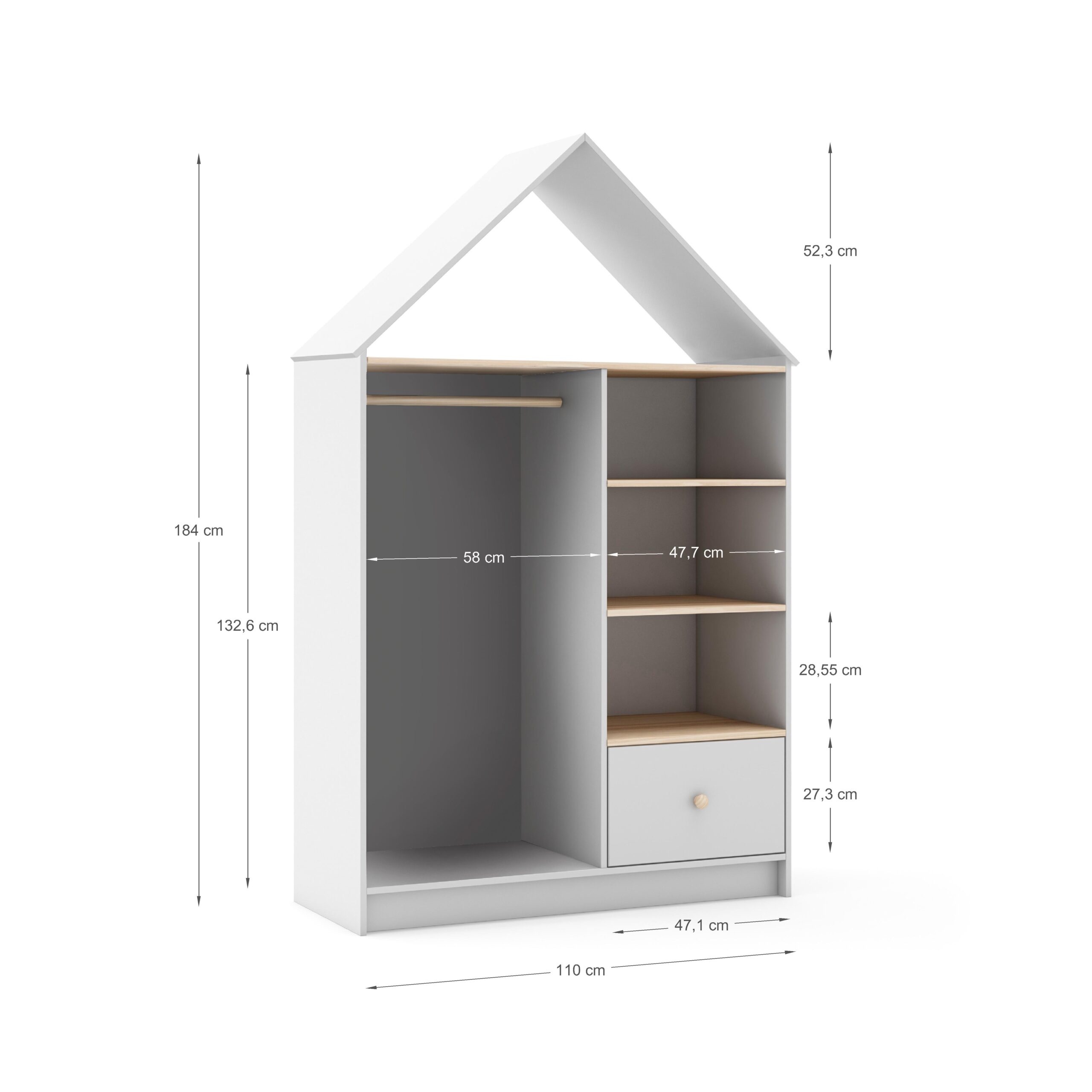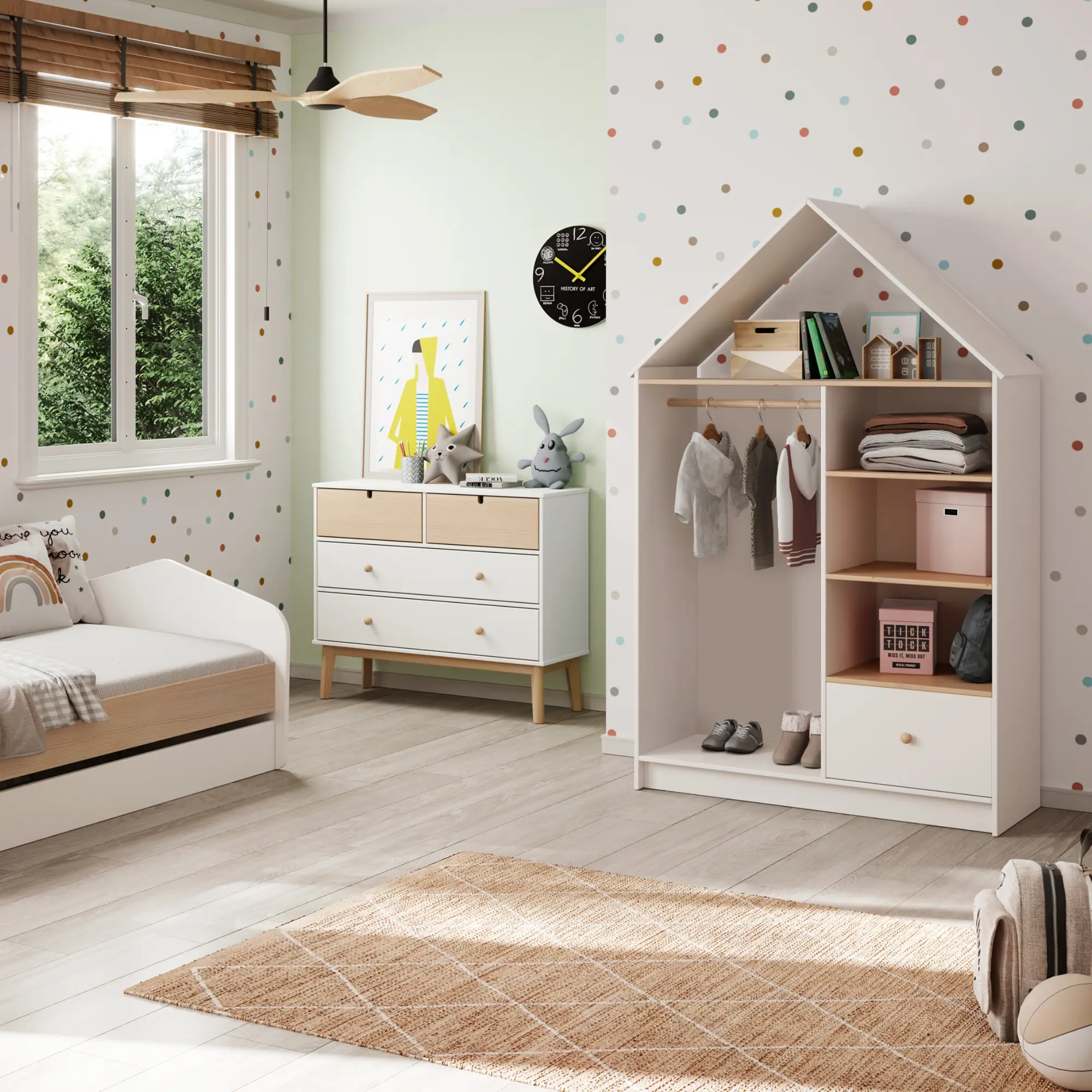 El Vestidor Estefanía 3H1C Blanco/Cera Blanca es una solución práctica para organizar ropa y accesorios de forma accesible y ordenada. Su diseño abierto combina funcionalidad y estilo, aportando luminosidad al espacio gracias a su acabado en tonos claros.